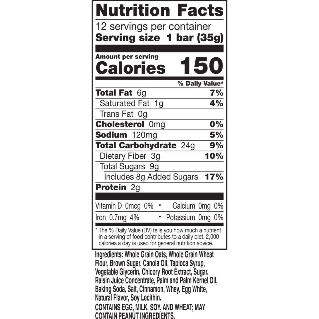Whole Grain Oats, Whole Grain Wheat Flour, Brown Sugar, Canola Oil, Tapioca Syrup, Vegetable Glycerin, Chicory Root Extract, Sugar, Raisin Juice Concentrate, Palm and Palm Kernel Oil, Baking Soda, Salt, Cinnamon, Whey, Egg White, Natural Flavor, Soy Lecithin./div>