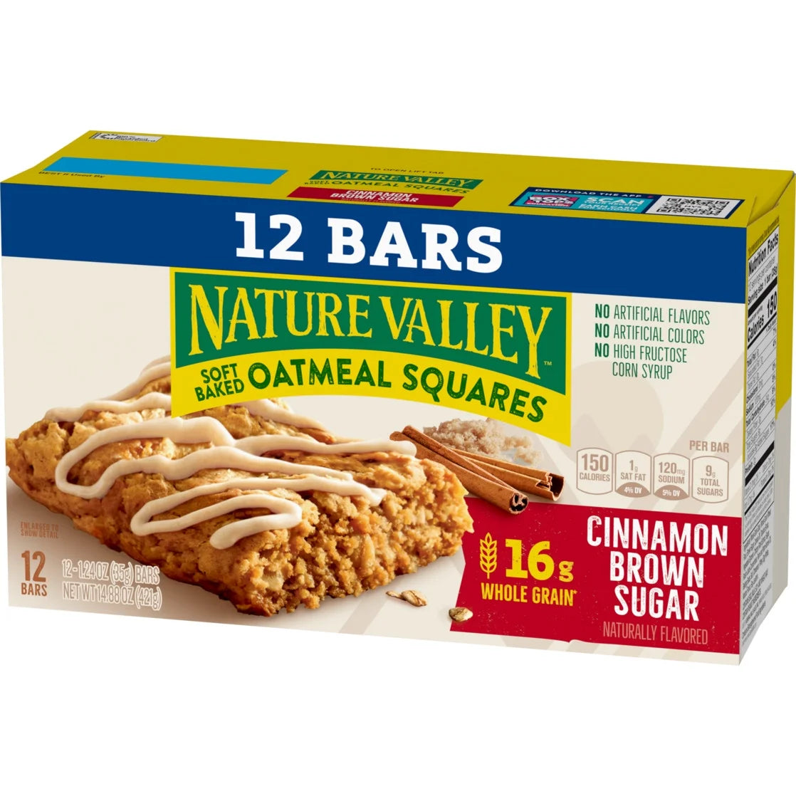 - CONTAINS: One big cardboard box of Nature Valley Soft Baked Oatmeal Squares, Cinnamon Brown Sugar, 12 Ct, 14.88 oz; Perfect for instant snacking