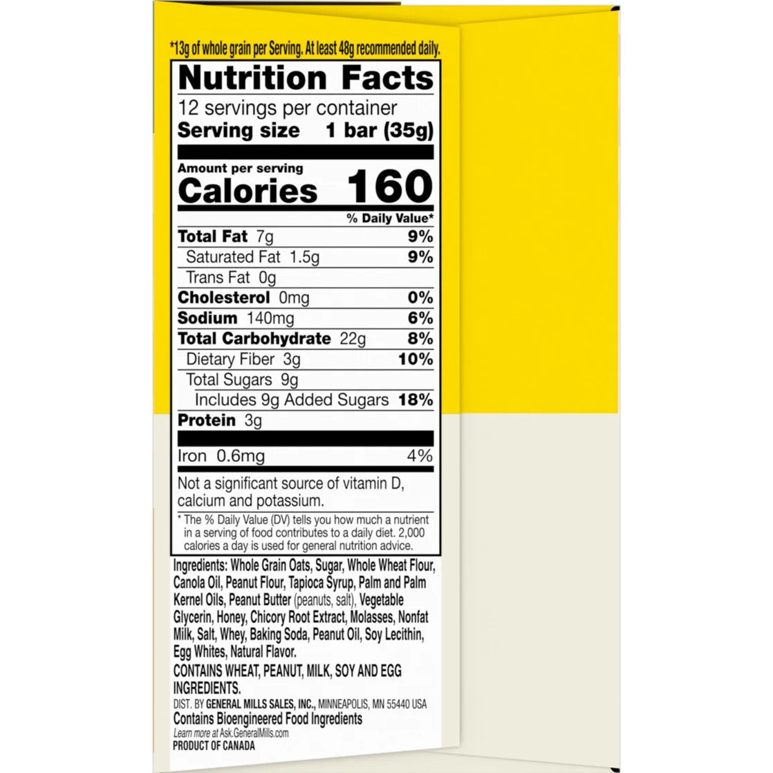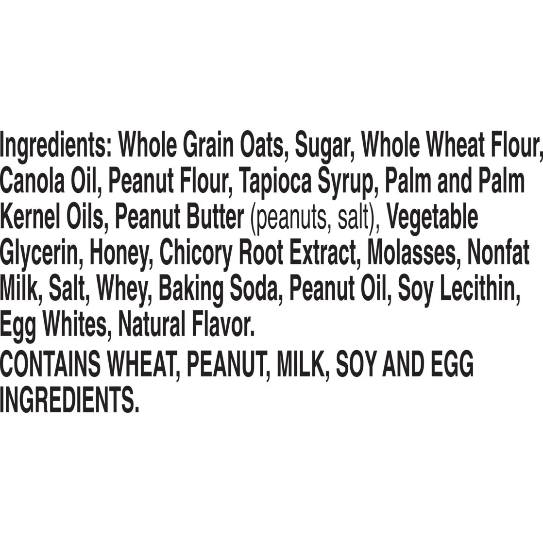 Whole Grain Oats, Sugar, Whole Wheat Flour, Canola Oil, Peanut Flour, Tapioca Syrup, Palm and Palm Kernel Oils, Peanut Butter (peanuts, salt), Vegetable Glycerin, Honey, Chicory Root Extract, Molasses, Nonfat Milk, Salt, Whey, Baking Soda, Peanut Oil, Soy Lecithin, Egg Whites, Natural Flavor./div>