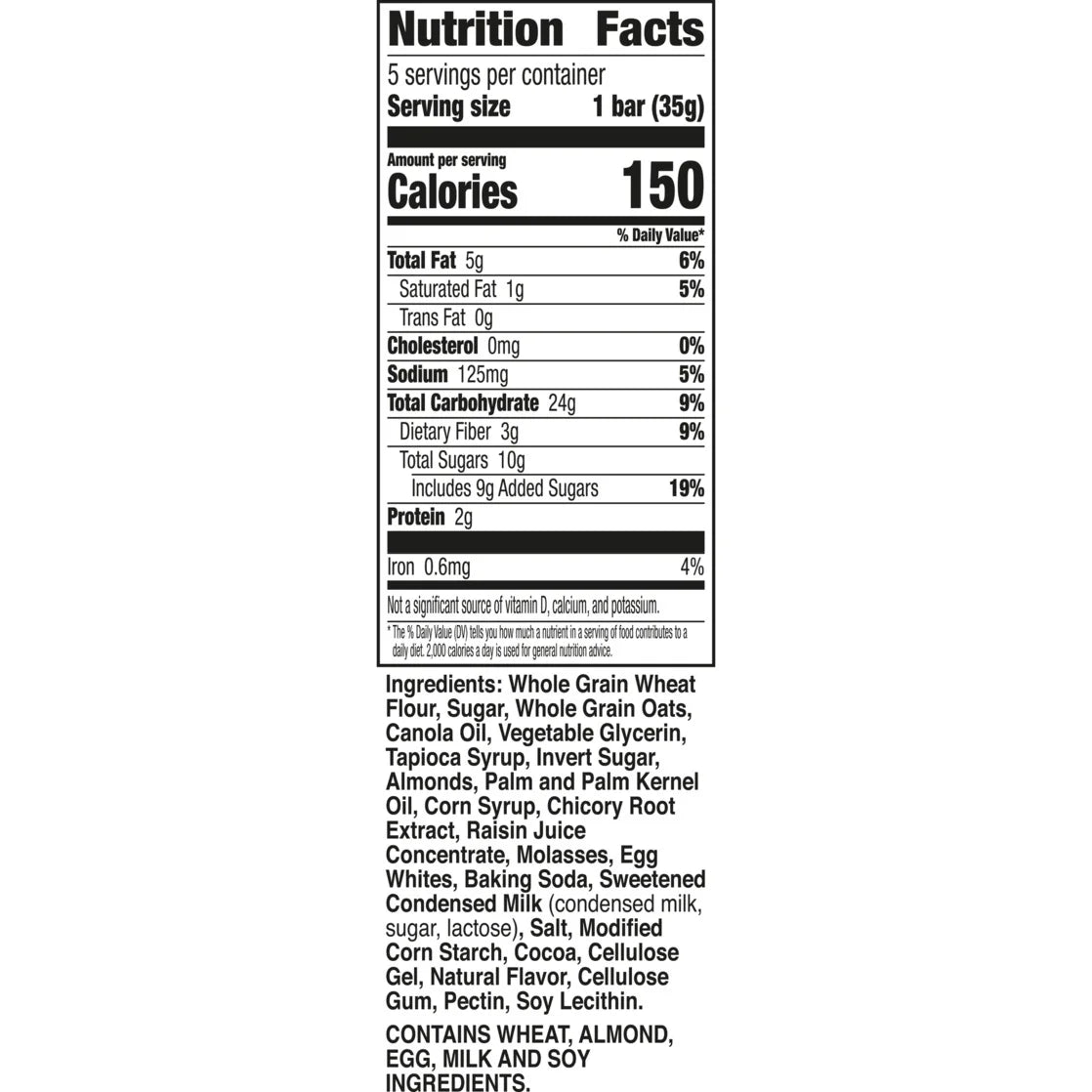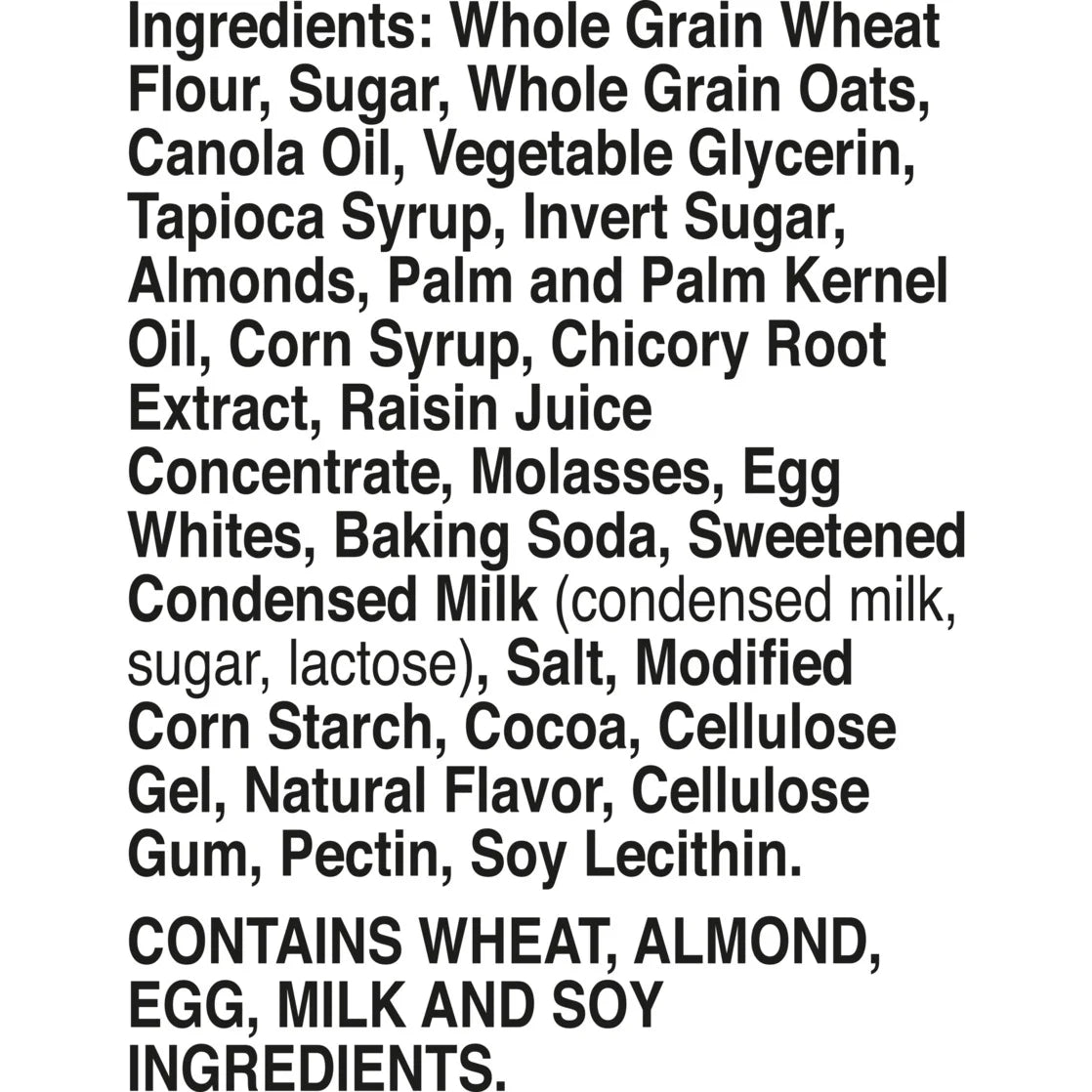 Whole Grain Wheat Flour, Sugar, Whole Grain Oats, Canola Oil, Vegetable Glycerin, Tapioca Syrup, Invert Sugar, Almonds, Palm and Palm Kernel Oil, Corn Syrup, Chicory Root Extract, Raisin Juice Concentrate, Molasses, Egg Whites, Baking Soda, Sweetened Condensed Milk (condensed milk, sugar, lactose), Salt, Modified Corn Starch, Cocoa, Cellulose Gel, Natural Flavor, Cellulose Gum, Pectin, Soy Lecithin./div>