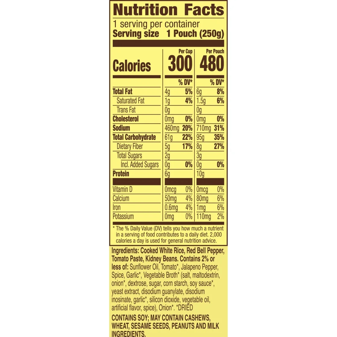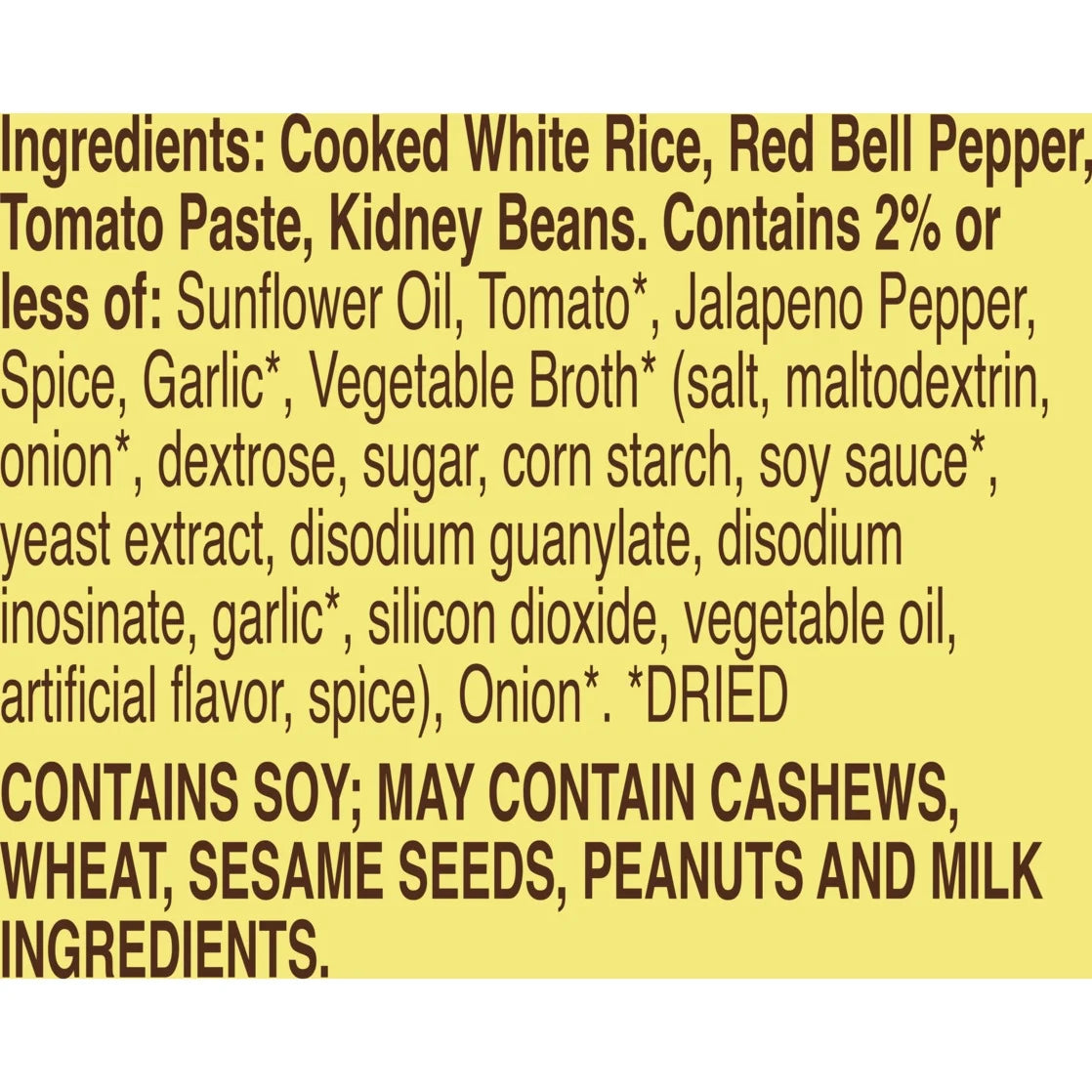 Cooked White Rice, Red Bell Pepper, Tomato Paste, Kidney Beans. Contains 2% or less of: Sunflower Oil, Tomato*, Jalapeno Pepper, Spice, Garlic*, Vegetable Broth* (salt, maltodextrin, onion*, dextrose, sugar, corn starch, soy sauce*, yeast extract, disodium guanylate, disodium inosinate, garlic*, silicon dioxide, vegetable oil, artificial flavor, spice), Onion*. *DRIED/div>