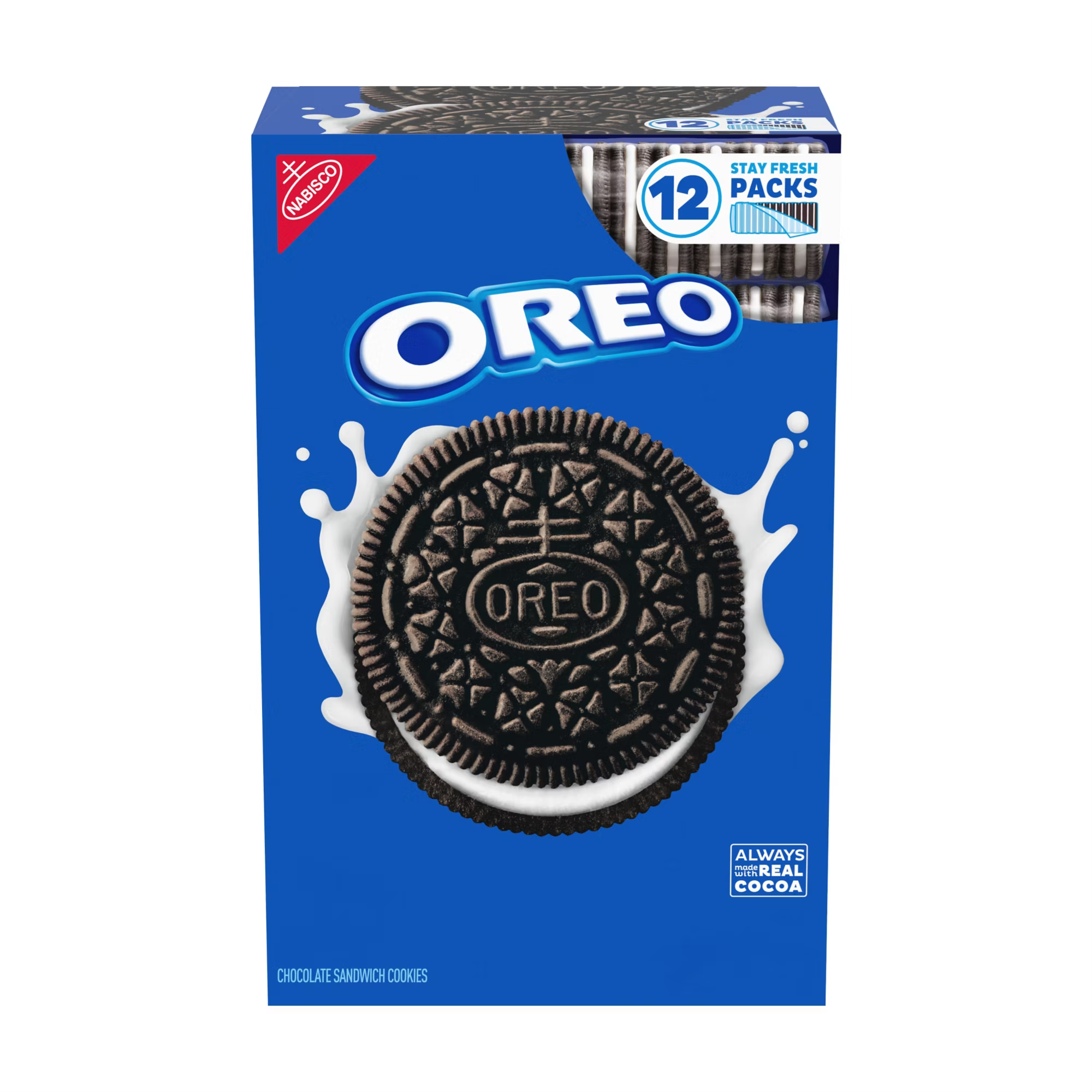 62.76 oz. pack Oreo Chocolate Sandwich Cookies (packaging may vary)Chocolate wafers always made with real cocoa filled with Oreo crème12 individually wrapped packs of Oreo cookies13 certified Kosher cookies per packBulk cookies in stay fresh packs are great for sharingPackaging may vary. Please refer to the actual packaging for current information for this product Chocolate wafers always made with real cocoa filled with Oreo crème12 individually wrapped packs of Oreo cookies13 certified Kosher cookies per pack Includes chocolate sandwich cookies, 62.76 oz.