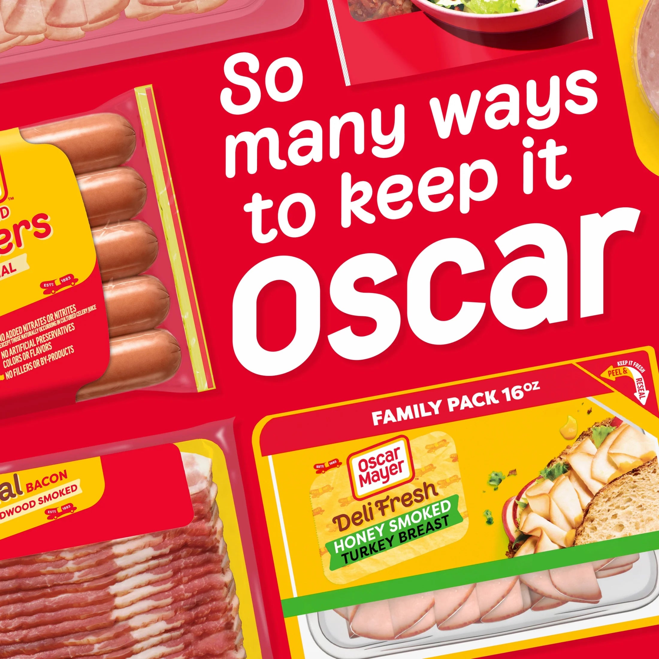 Oscar Mayer Deli Fresh Honey Smoked Turkey Breast Family Size Tray contains quality deli sliced turkey breast with no artificial preservatives, no nitrates or nitrites added, and no added hormones. This sliced turkey meat is fully cooked, and has a mouthwatering smoky flavor with a touch of sweet honey. Oscar Mayer Deli Fresh makes the perfect lunch - use smoked turkey slices to make a classic cold meat sandwich, like a turkey croissant sandwich, or try making a turkey club. Honey smoked turkey sliced up also makes a great addition to cheese and crackers, salads or on a party platter with chicken breast and deli-sliced corn beef. Keep the 16 ounce tray refrigerated to maintain freshness. Swap out the frozen breakfast sandwich for a delicious sandwich filled with our fresh turkey cold cuts. No Allergen Free Claims Apply.