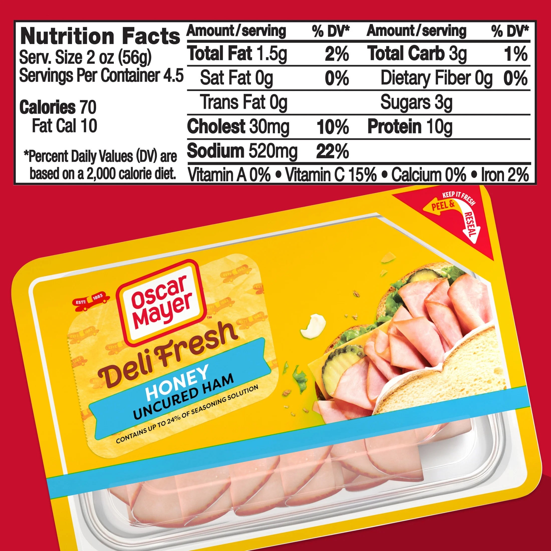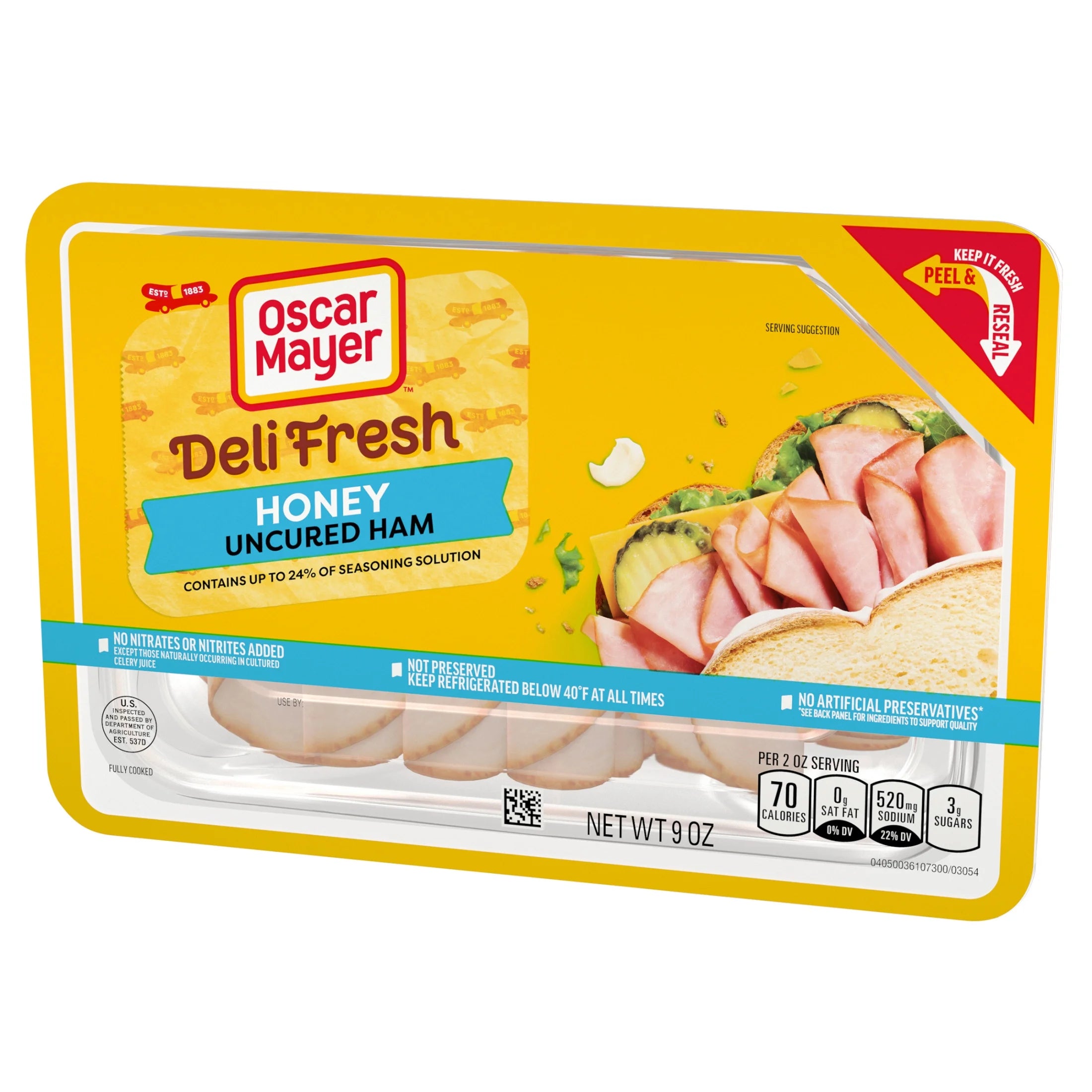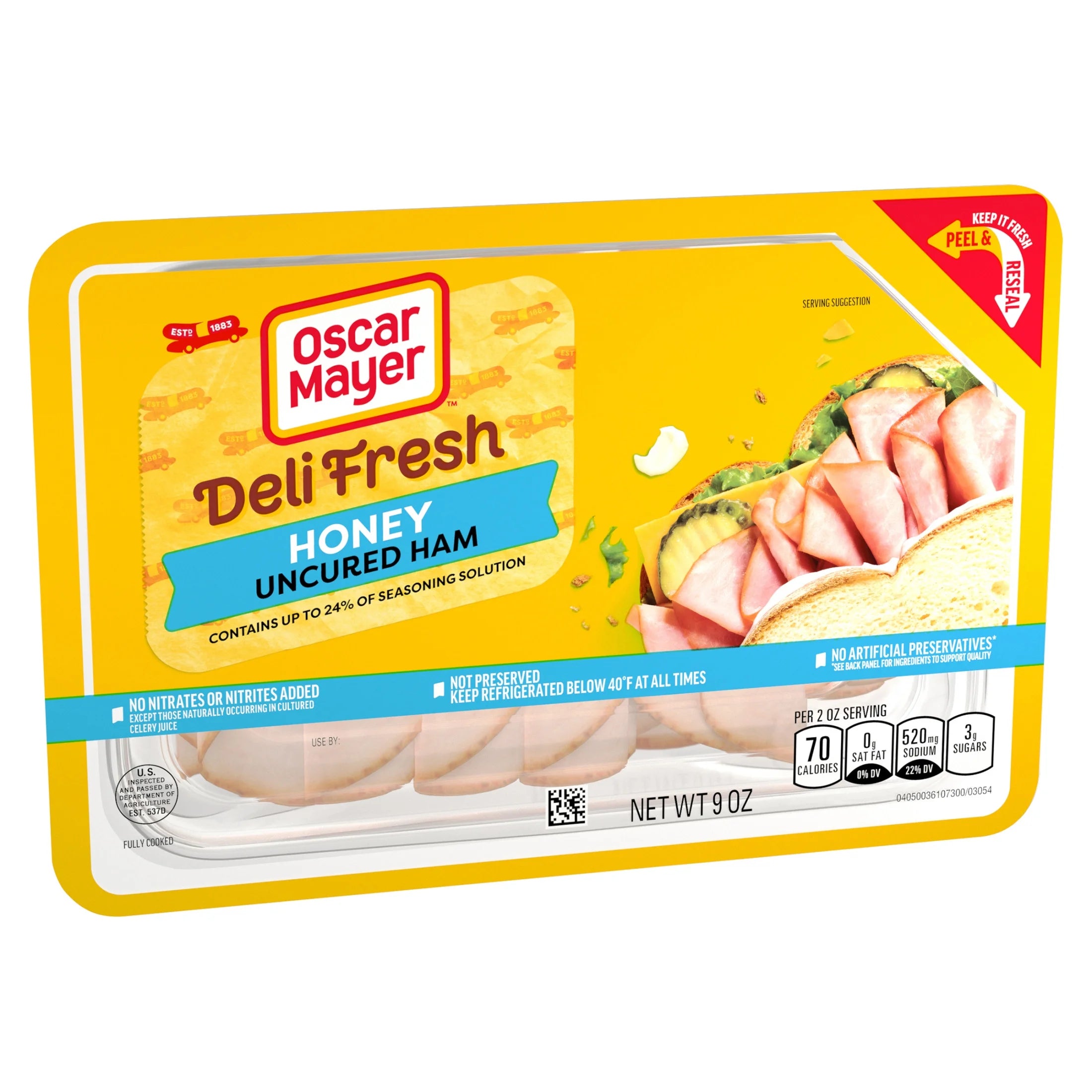- One 9 oz plastic tray of Oscar Mayer Deli Fresh Honey Uncured Ham, Contains Up To 24% Of Seasoning Solution, Browned With Caramel Color, Sliced Lunch Meat No Nitrates or Nitrites Added Except Those Naturally Occurring in Cultured Celery Juice