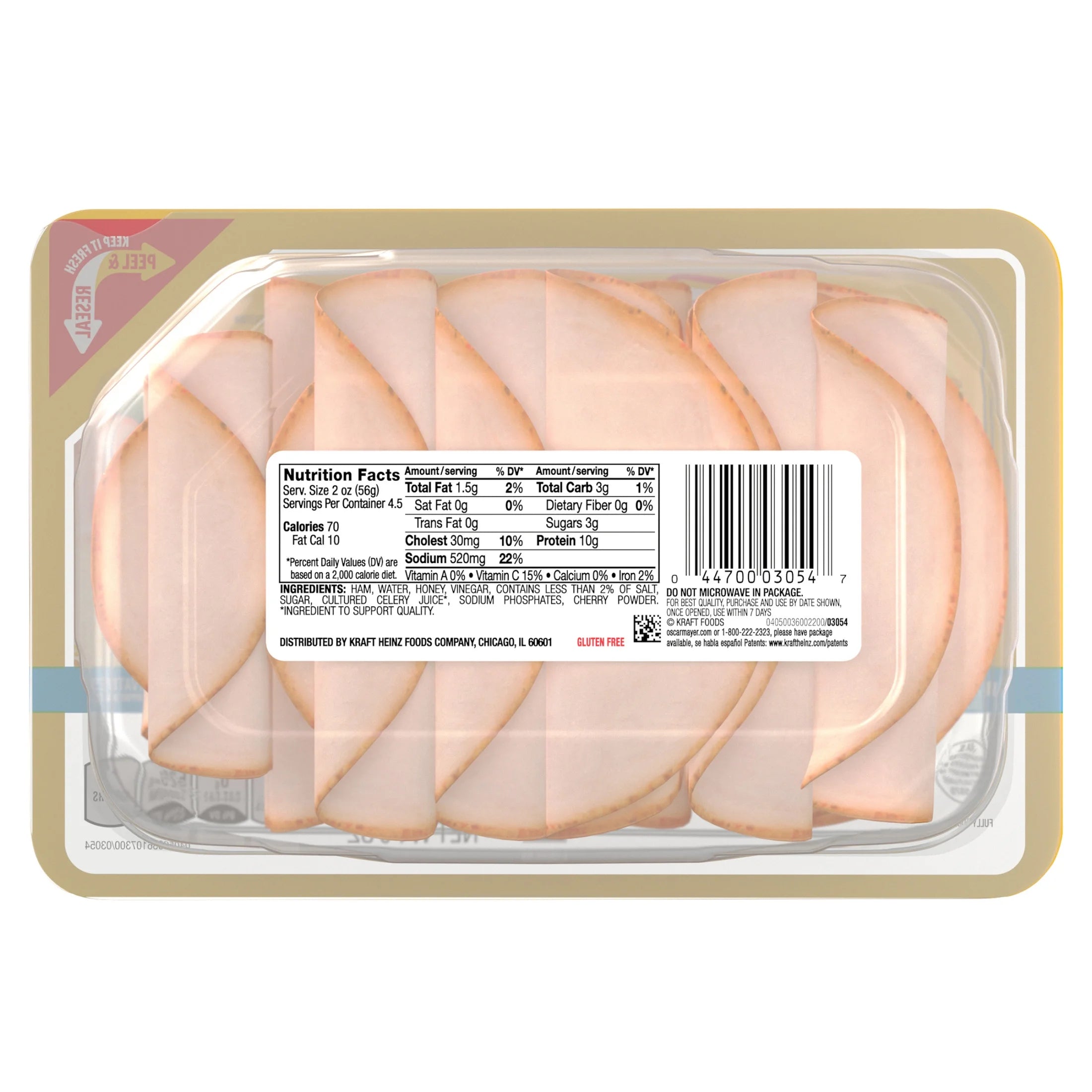 Oscar Mayer Deli Fresh Uncured Honey Ham lunch meat is quality uncured deli ham with no artificial preservatives, no added hormones and no nitrates or nitrites added. Oscar Mayer honey ham deli lunch meat is fully cooked and has a honey glaze for a rich, sweet flavor. Oscar Mayer lunch meat makes the perfect lunch - use this pre sliced ham as luncheon meat to make a classic ham and cheese sandwich, ham salad sandwich or deli meat tray. With honey sliced ham you'll have a great addition to salads, cheese and crackers or a party tray with deli-sliced corn beef and turkey lunch meat. Keep the 9 ounce tray of Oscar Mayer Deli Fresh Uncured Honey Ham slices refrigerated to maintain freshness. Also try our deli fresh turkey and other ham sandwich meat varieties. No Allergen Free Claims Apply.