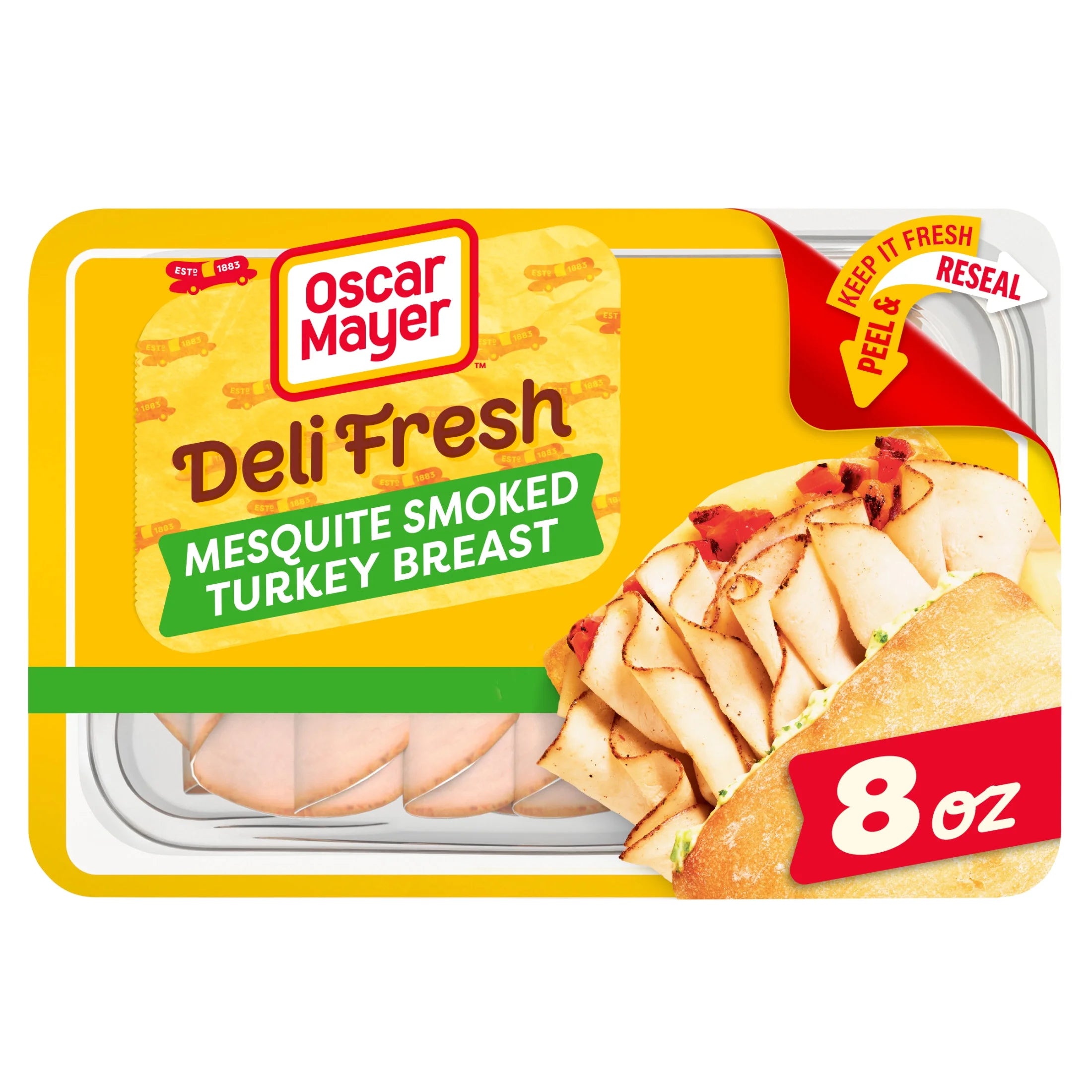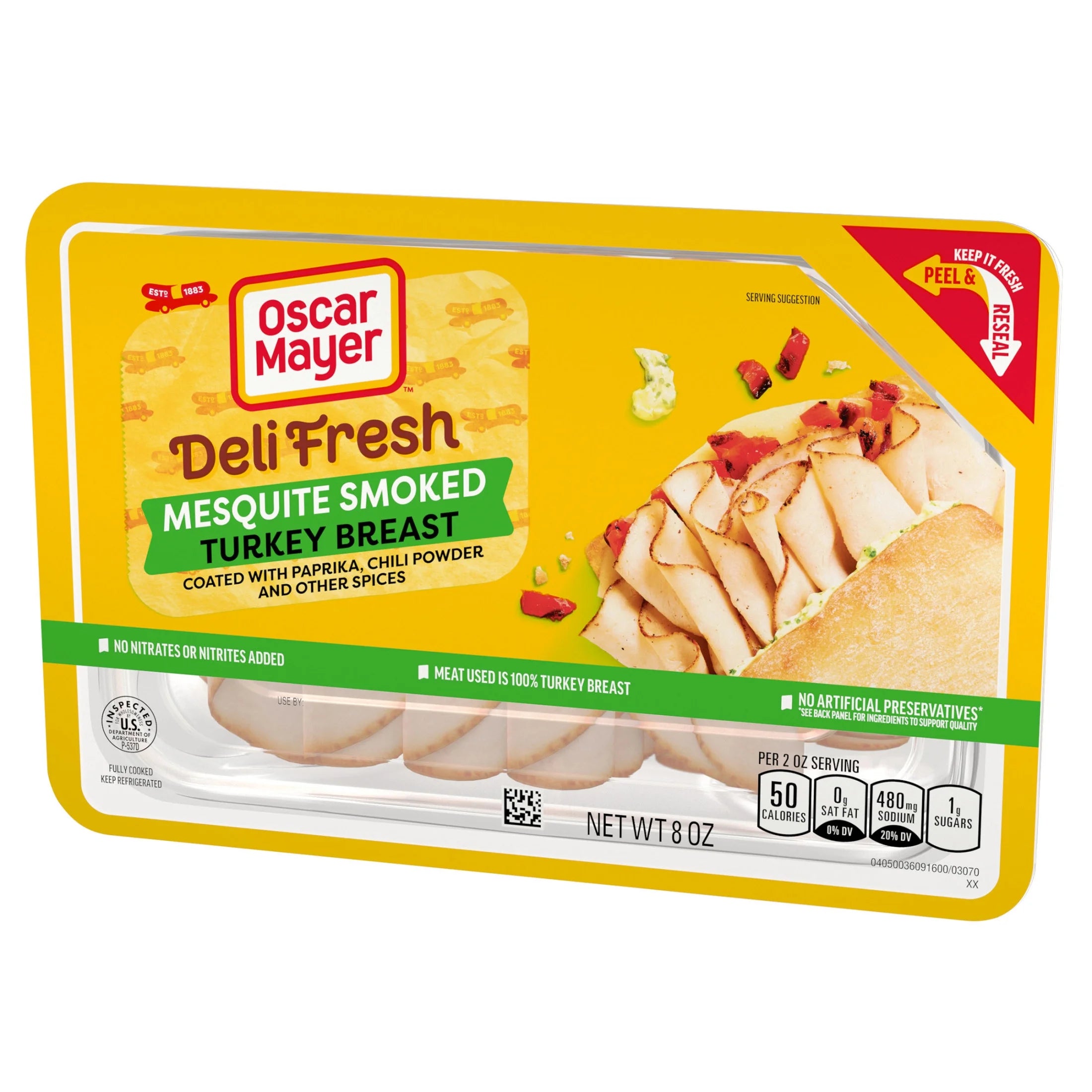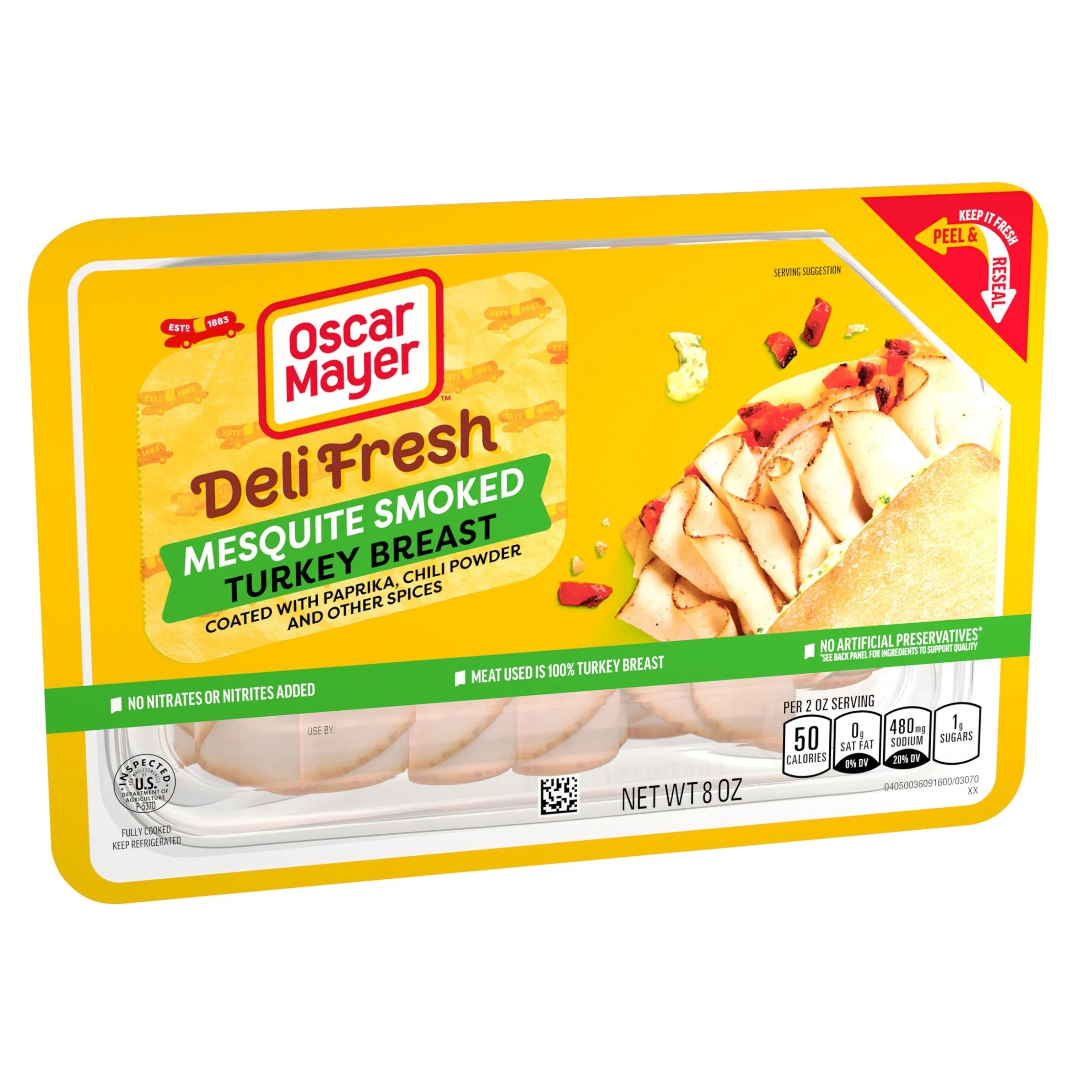- One 8 oz plastic tray of Oscar Mayer Deli Fresh Mesquite Smoked Turkey Breast, Coated With Paprika, Chili Powder And Other Spices, Sliced Lunch Meat