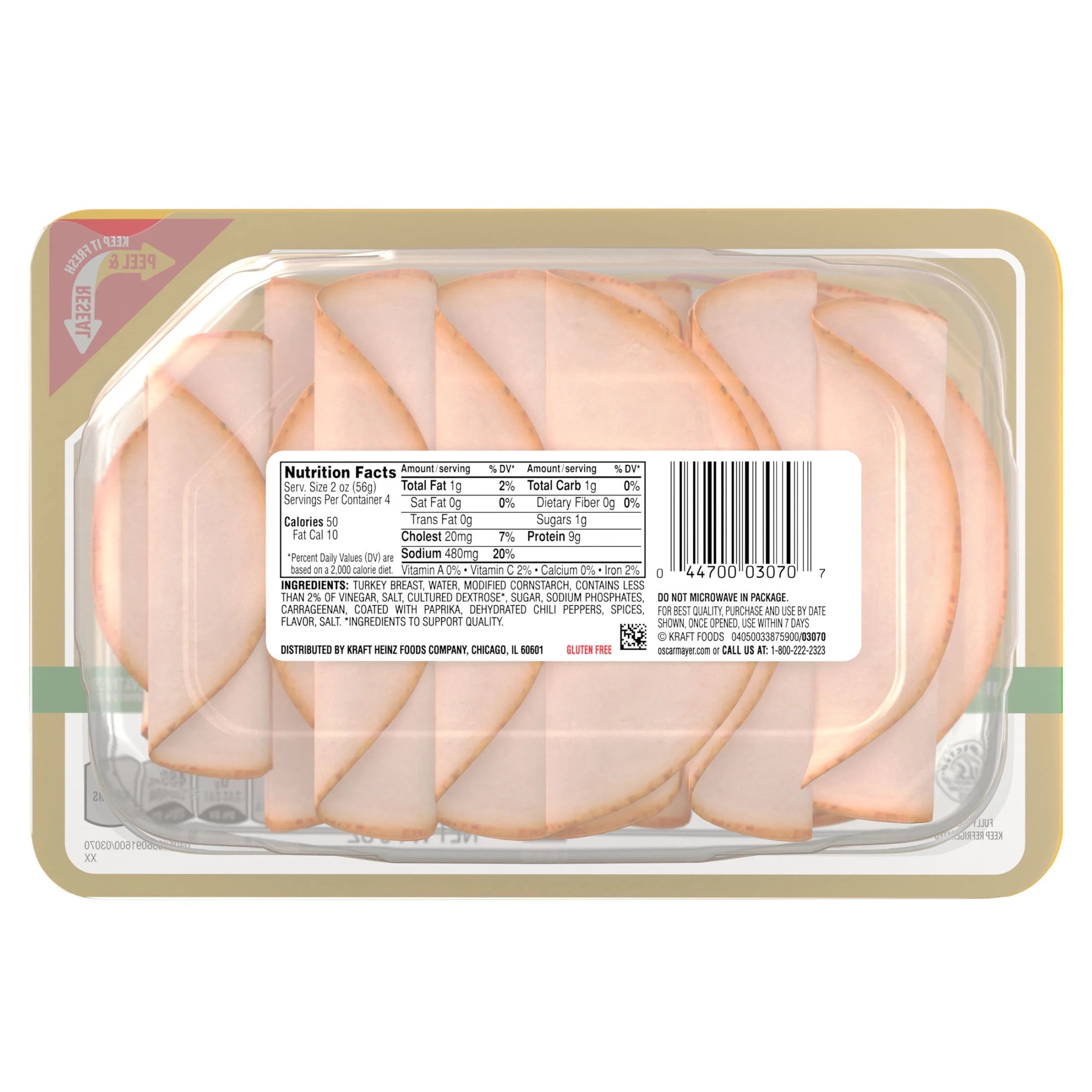 Oscar Mayer Deli Fresh Mesquite Smoked Turkey Breast is quality deli fresh turkey meat with no artificial preservatives, no added hormones and no nitrates or nitrites added. This lunch meat is fully cooked and coated with paprika, chili powder and other spices for a mouthwatering, smoky flavor. Oscar Mayer Deli Fresh makes the perfect turkey lunch meat - use smoked turkey slices to make a turkey club, or try making a turkey melt in the oven. Oscar Mayer Deli Fresh Mesquite Smoked Turkey Breast also makes a great addition to cheese and crackers, salads and even on a party platter with deli-sliced corn beef and turkey pepperoni. This smoked turkey lunch meat is also perfect for a mini sandwich platter. Keep the 8 ounce tray refrigerated to maintain freshness of your turkey breast lunch meat. Be sure to try our other bulk deli meat varieties. No Allergen Free Claims Apply.