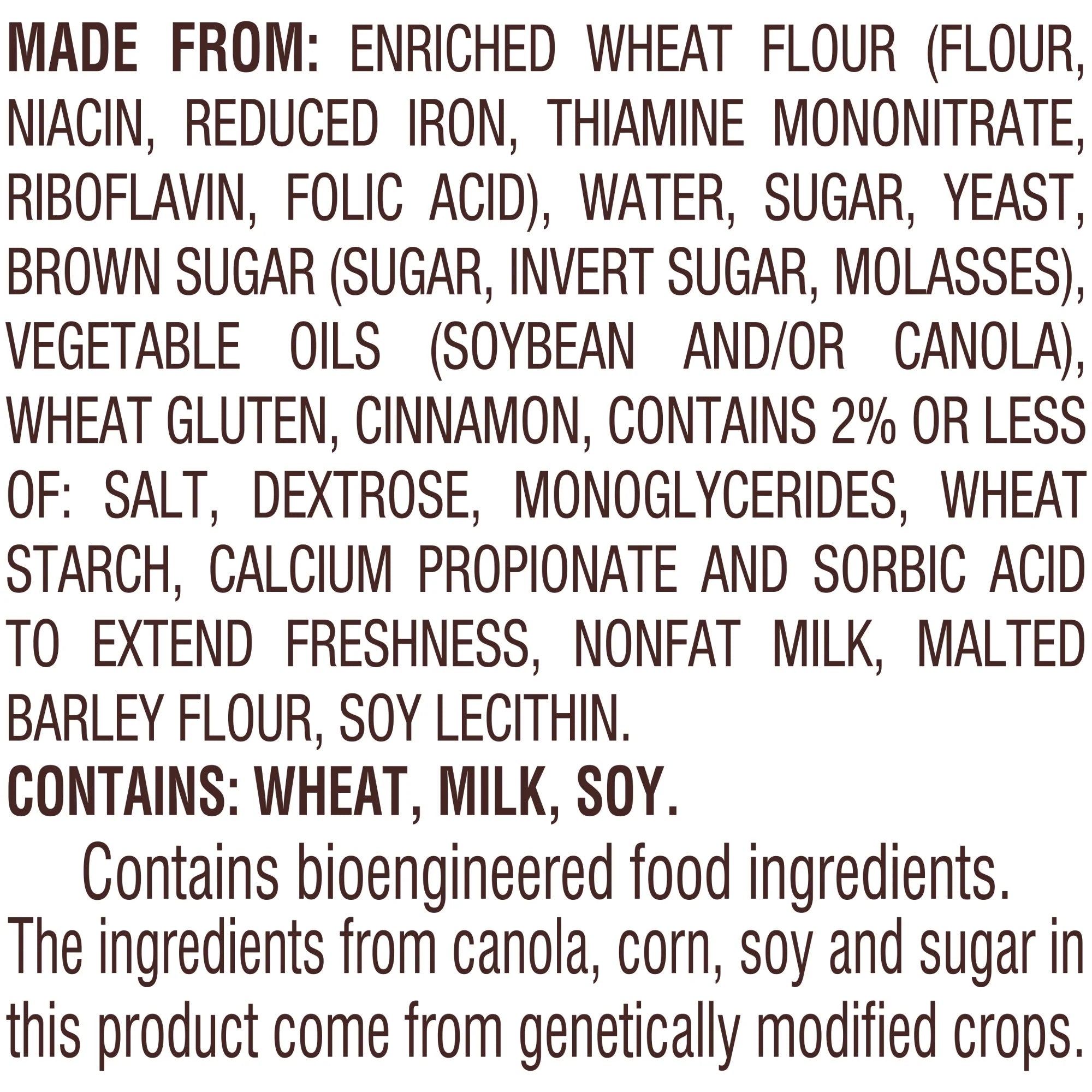 Made From: Enriched Wheat Flour (Flour, Niacin, Reduced Iron, Thiamine Mononitrate, Riboflavin, Folic Acid), Water, Sugar, Yeast, Brown Sugar (Sugar, Invert Sugar, Molasses), Vegetable Oils (Soybean And/Or Canola), Wheat Gluten, Cinnamon, Contains 2% Or Less Of: Salt, Dextrose, Monoglycerides, Wheat Starch, Calcium Propionate And Sorbic Acid To Extend Freshness, Nonfat Milk, Malted Barley Flour, Soy Lecithin. Contains: Wheat, Milk, Soy./div>