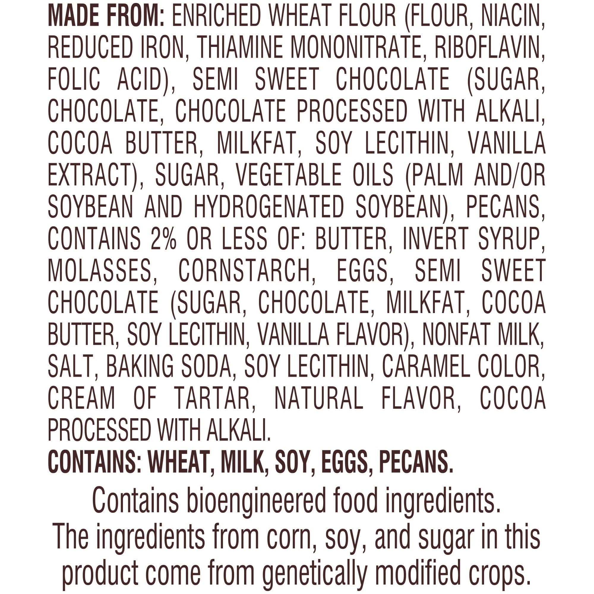 Made From: Enriched Wheat Flour (Flour, Niacin, Reduced Iron, Thiamine Mononitrate, Riboflavin, Folic Acid), Semi Sweet Chocolate (Sugar, Chocolate, Chocolate Processed With Alkali, Cocoa Butter, Milkfat, Soy Lecithin, Vanilla Extract), Sugar, Vegetable Oils (Palm And/Or Soybean And Hydrogenated Soybean), Pecans, Contains 2% Or Less Of: Butter, Invert Syrup, Molasses, Cornstarch, Eggs, Semi Sweet Chocolate (Sugar, Chocolate, Milkfat, Cocoa Butter, Soy Lecithin, Vanilla Flavor), Nonfat Milk, Salt, Baking Soda, Soy Lecithin, Caramel Color, Cream Of Tartar, Natural Flavor, Cocoa Processed With Alkali. Contains: Wheat, Milk, Soy, Eggs, Pecans./div>