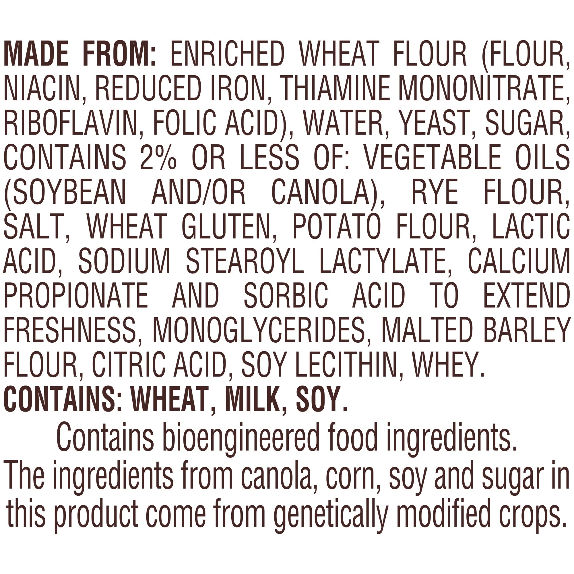 Made From: Enriched Wheat Flour (Flour, Niacin, Reduced Iron, Thiamine Mononitrate, Riboflavin, Folic Acid), Water, Yeast, Sugar, Contains 2% Or Less Of: Vegetable Oils (Soybean And/or Canola), Rye Flour, Salt, Wheat Gluten, Potato Flour, Lactic Acid, Sodium Stearoyl Lactylate, Calcium Propionate And Sorbic Acid To Extend Freshness, Monoglycerides, Malted Barley Flour, Citric Acid, Soy Lecithin, Whey. Contains: Wheat, Milk, Soy./div>