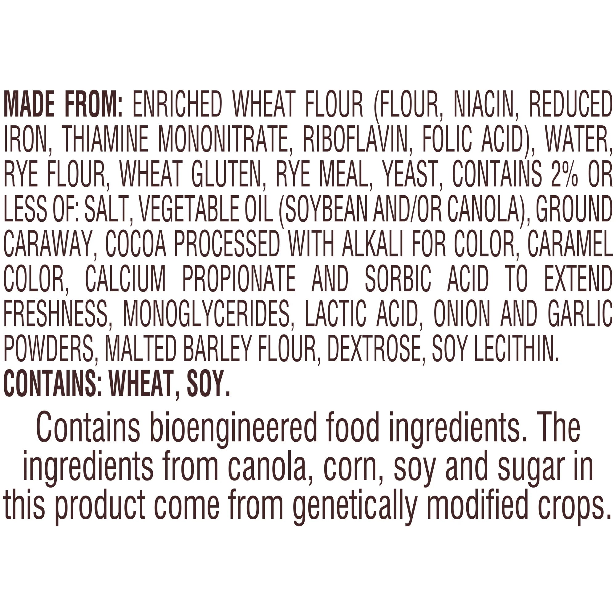 Made From: Enriched Wheat Flour (Flour, Niacin, Reduced Iron, Thiamine Mononitrate, Riboflavin, Folic Acid), Water, Rye Flour, Wheat Gluten, Rye Meal, Yeast, Contains 2% Or Less Of: Salt, Vegetable Oil (Soybean And/Or Canola), Ground Caraway, Cocoa Processed With Alkali For Color, Caramel Color, Calcium Propionate And Sorbic Acid To Extend Freshness, Monoglycerides, Lactic Acid, Onion And Garlic Powders, Malted Barley Flour, Dextrose, Soy Lecithin. Contains: Wheat, Soy./div>