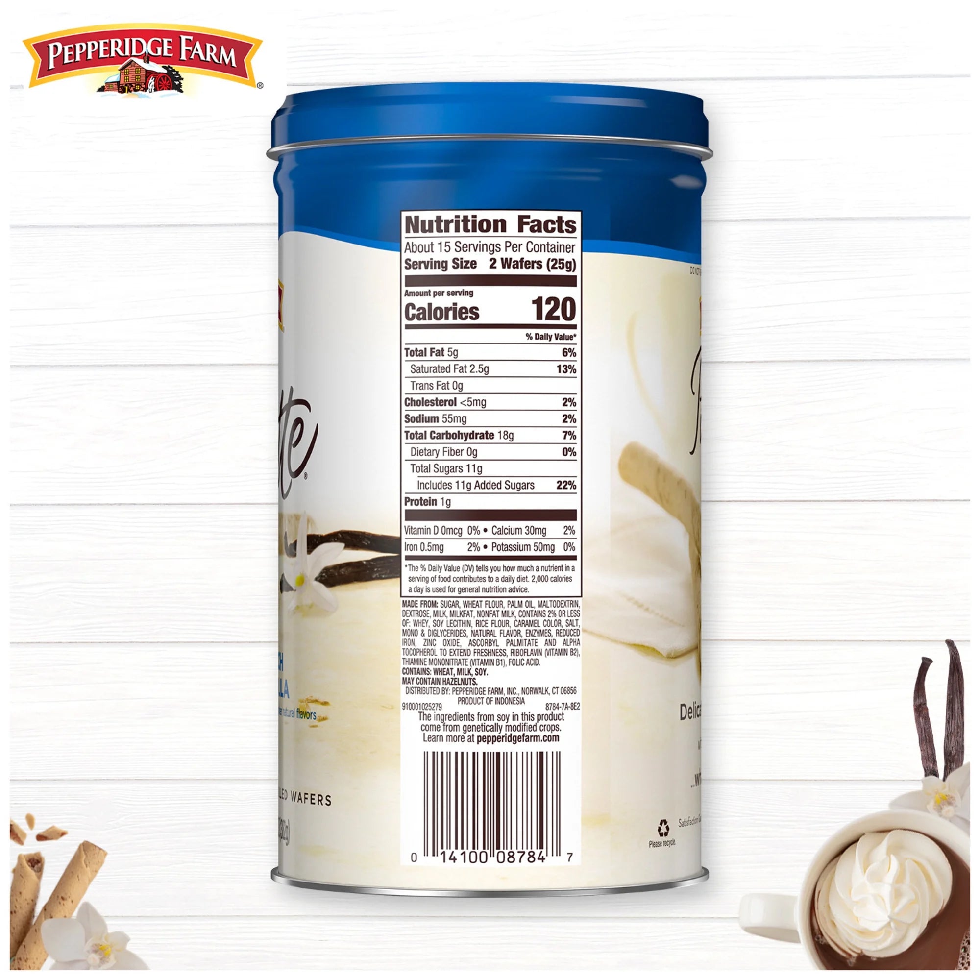 Whether paired with morning tea or coffee, added as an adorable cupcake decoration, or partnered with ice cream, Pepperidge Farm Pirouette French Vanilla Créme-Filled Wafers deliver absolute indulgence in every perfect bite. These pastry-like wafers are baked to a delicate crisp, and filled with a luscious, creamy vanilla flavored filling. They have a European flair that makes serving them extra special - even if it’s a treat just for you. The 13.5-ounce tin helps keep them fresh, so you can continue to savor the sophisticated sweetness. These Pepperidge Farm Pirouette French Vanilla Créme-Filled Wafers are beautifully crafted because, for Pepperidge Farm, baking is more than a job, it's a real passion. Each day, our bakers take the time to make every cookie, pastry, cracker, and loaf of bread the best way they know how - by using carefully selected, quality ingredients. So go ahead and give in to delicious indulgence. Shelf-stable product.