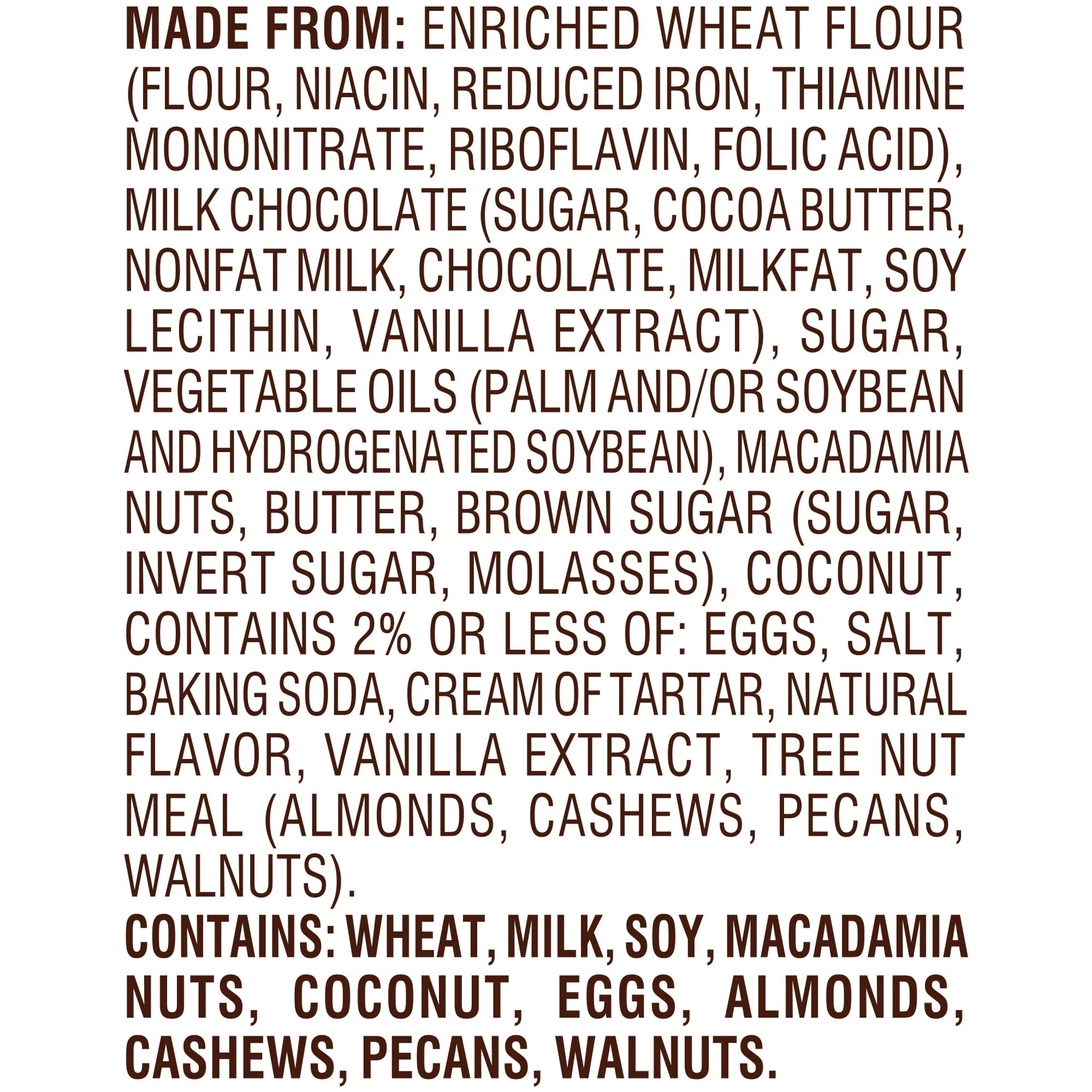 Made From: Enriched Wheat Flour (Flour, Niacin, Reduced Iron, Thiamine Mononitrate, Riboflavin, Folic Acid), Milk Chocolate (Sugar, Cocoa Butter, Nonfat Milk, Chocolate, Milkfat, Soy Lecithin, Vanilla Extract), Sugar, Vegetable Oils (Palm And/Or Soybean And Hydrogenated Soybean), Macadamia Nuts, Butter, Brown Sugar (Sugar, Invert Sugar, Molasses), Coconut, Contains 2% Or Less Of: Eggs, Salt, Baking Soda, Cream Of Tartar, Natural Flavor, Vanilla Extract, Tree Nut Meal (Almonds, Cashews, Pecans, Walnuts). Contains: Wheat, Milk, Soy, Macadamia Nuts, Coconut, Eggs, Almonds, Cashews, Pecans, Walnuts./div>