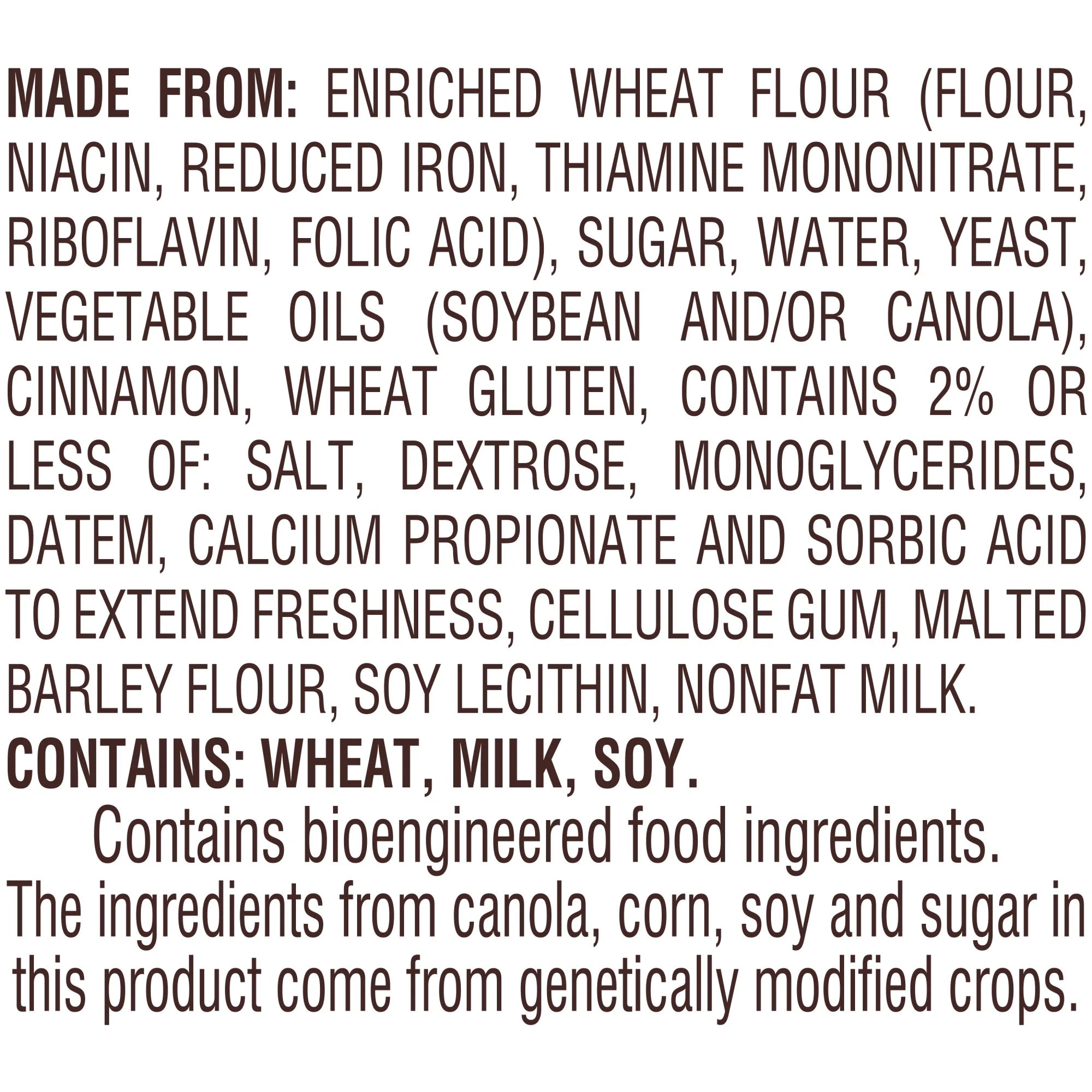 Made From: Enriched Wheat Flour (Flour, Niacin, Reduced Iron, Thiamine Mononitrate, Riboflavin, Folic Acid), Sugar, Water, Yeast, Vegetable Oils (Soybean And/or Canola), Cinnamon, Wheat Gluten, Contains 2% Or Less Of: Salt, Dextrose, Monoglycerides, Datem, Calcium Propionate And Sorbic Acid To Extend Freshness, Cellulose Gum, Malted Barley Flour, Soy Lecithin, Nonfat Milk. Contains: Wheat, Milk, Soy./div>