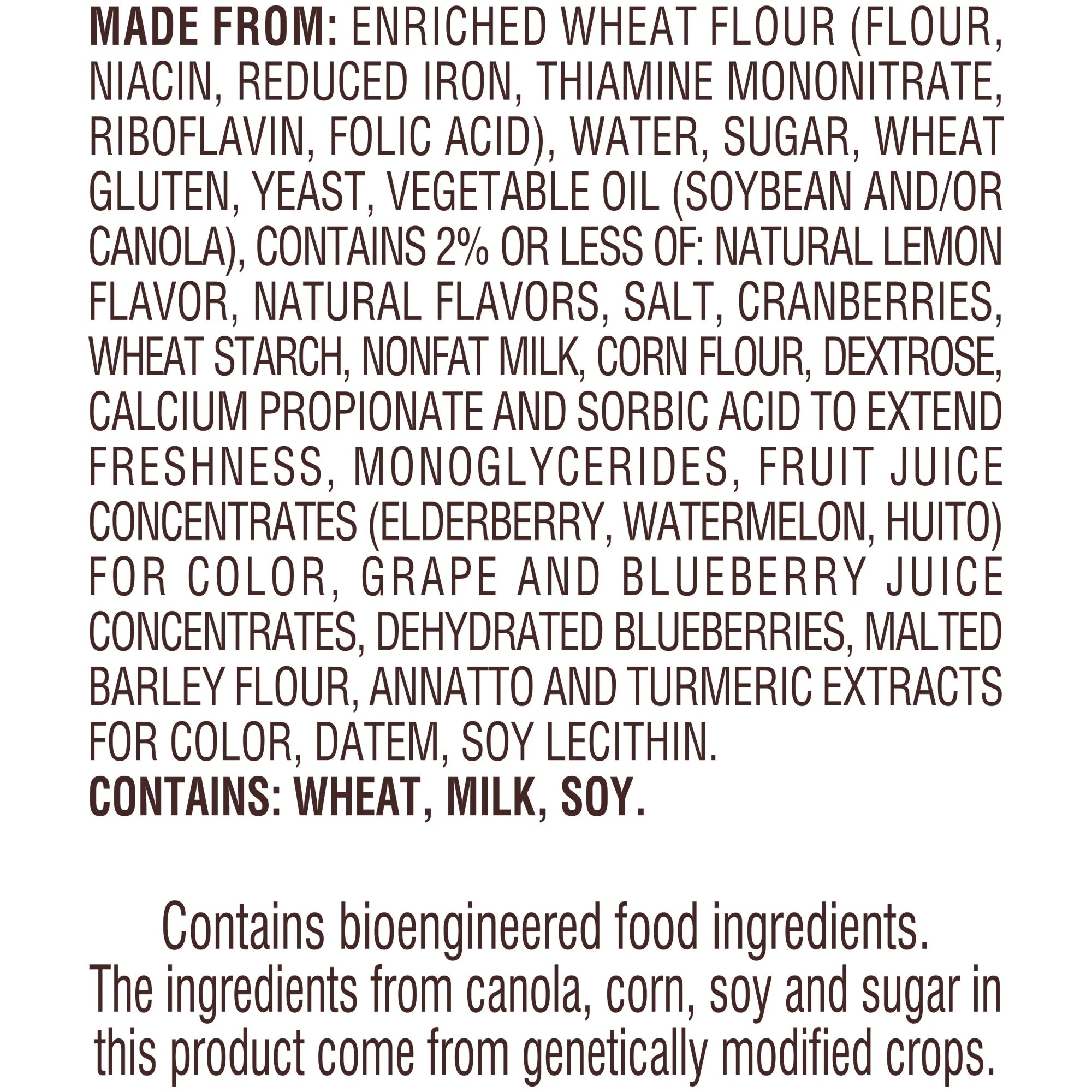 Made From: Enriched Wheat Flour (Flour, Niacin, Reduced Iron, Thiamine Mononitrate, Riboflavin, Folic Acid), Water, Sugar, Wheat Gluten, Yeast, Vegetable Oil (Soybean And/or Canola), Contains 2% Or Less Of: Natural Lemon Flavor, Natural Flavors, Salt, Cranberries, Wheat Starch, Nonfat Milk, Corn Flour, Dextrose, Calcium Propionate And Sorbic Acid To Extend Freshness, Monoglycerides, Fruit Juice Concentrates (Elderberry, Watermelon, Huito) For Color, Grape And Blueberry Juice Concentrates, Dehydrated Blueberries, Malted Barley Flour, Annatto And Turmeric Extracts For Color, Datem, Soy Lecithin. Contains: Wheat, Milk, Soy./div>