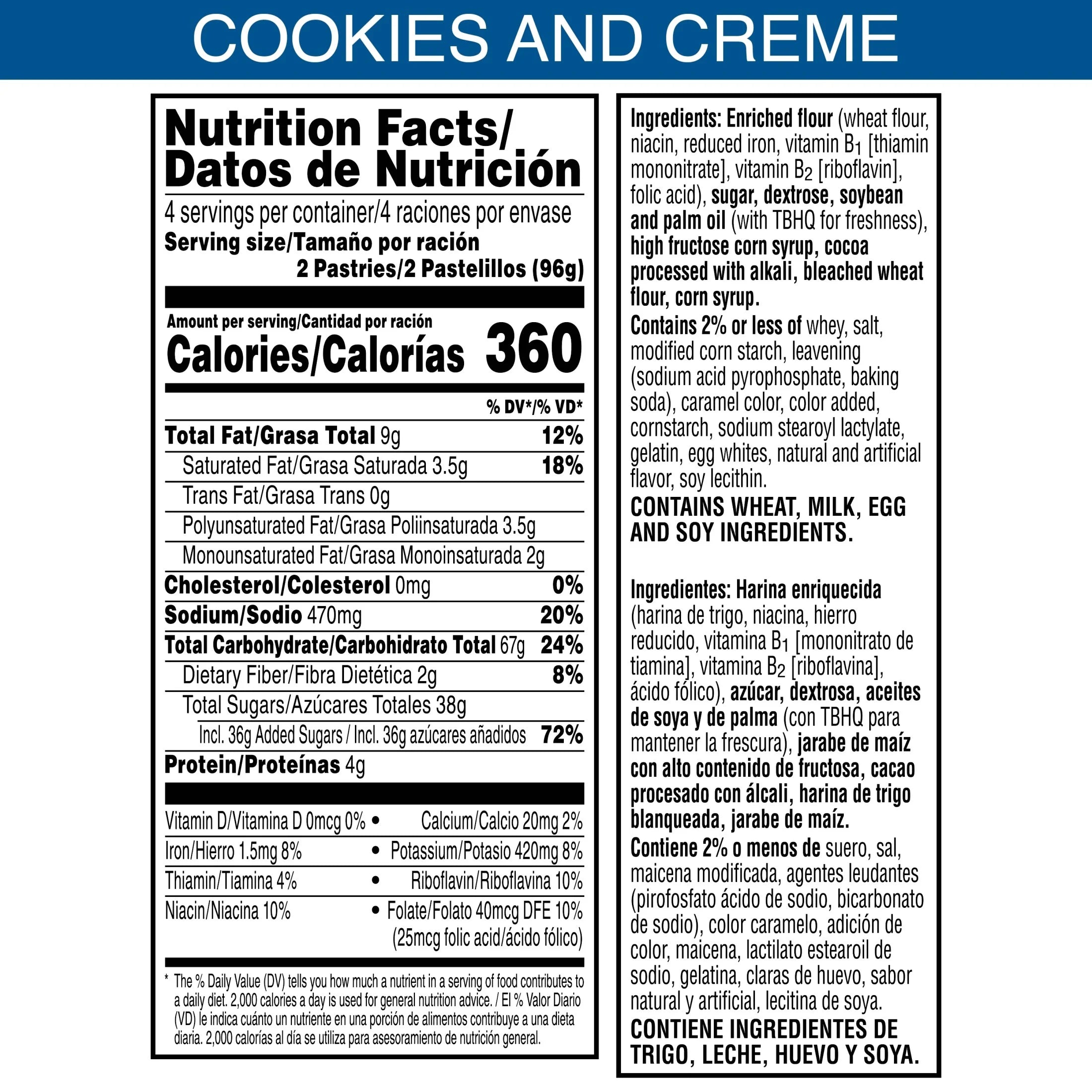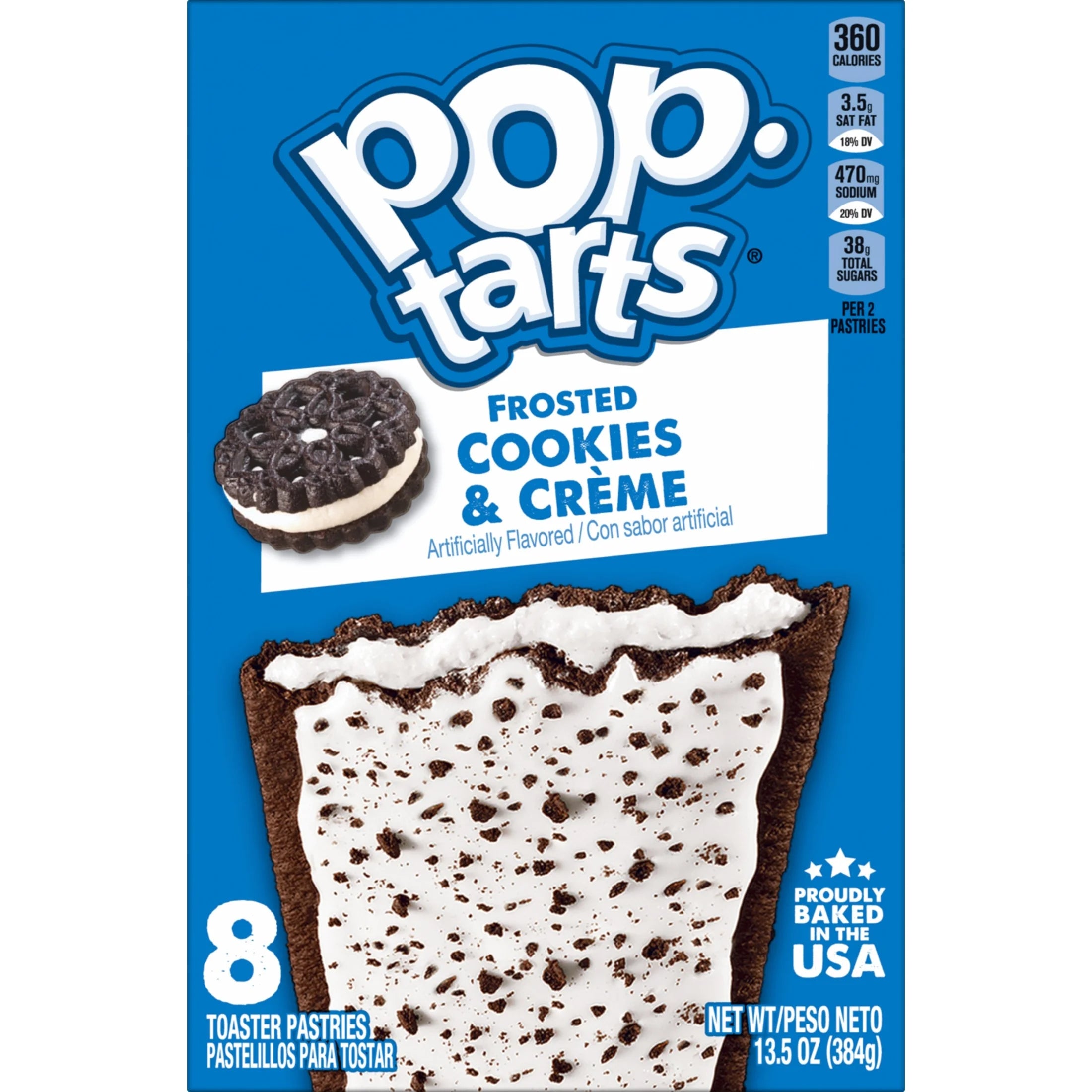 Pop-Tarts toaster pastries are the perfect sweet treat at breakfast, for a lunch snack, or dessert. Featuring a sweet Frosted Cookies and Creme filling and chocolatey crumbles in a soft pastry crust, this ready to eat treat is perfect for kids snacks and adult snacks on the go. Pack Pop-Tarts Frosted Cookies and Creme in kids lunchboxes for school snacks, or stock the office pantry with this individually wrapped grab and go adult snack. Pop them in the toaster and pair with milk, create your own ice cream sandwiches, or incorporate into your favorite dessert recipe for a sweet treat. These irresistible snacks for adults and kids provide a good source of three B vitamins. Stock your pantry with these shelf stable snacks and enjoy ready to eat treats anytime. A flavor for everyone, including beloved classics like Frosted Blueberry or Frosted Cherry, or our more indulgent flavors, Frosted S'mores or Frosted Chocolate Fudge. CONTAINS WHEAT, MILK, EGG AND SOY INGREDIENTS. Shelf-Stable and Instant.