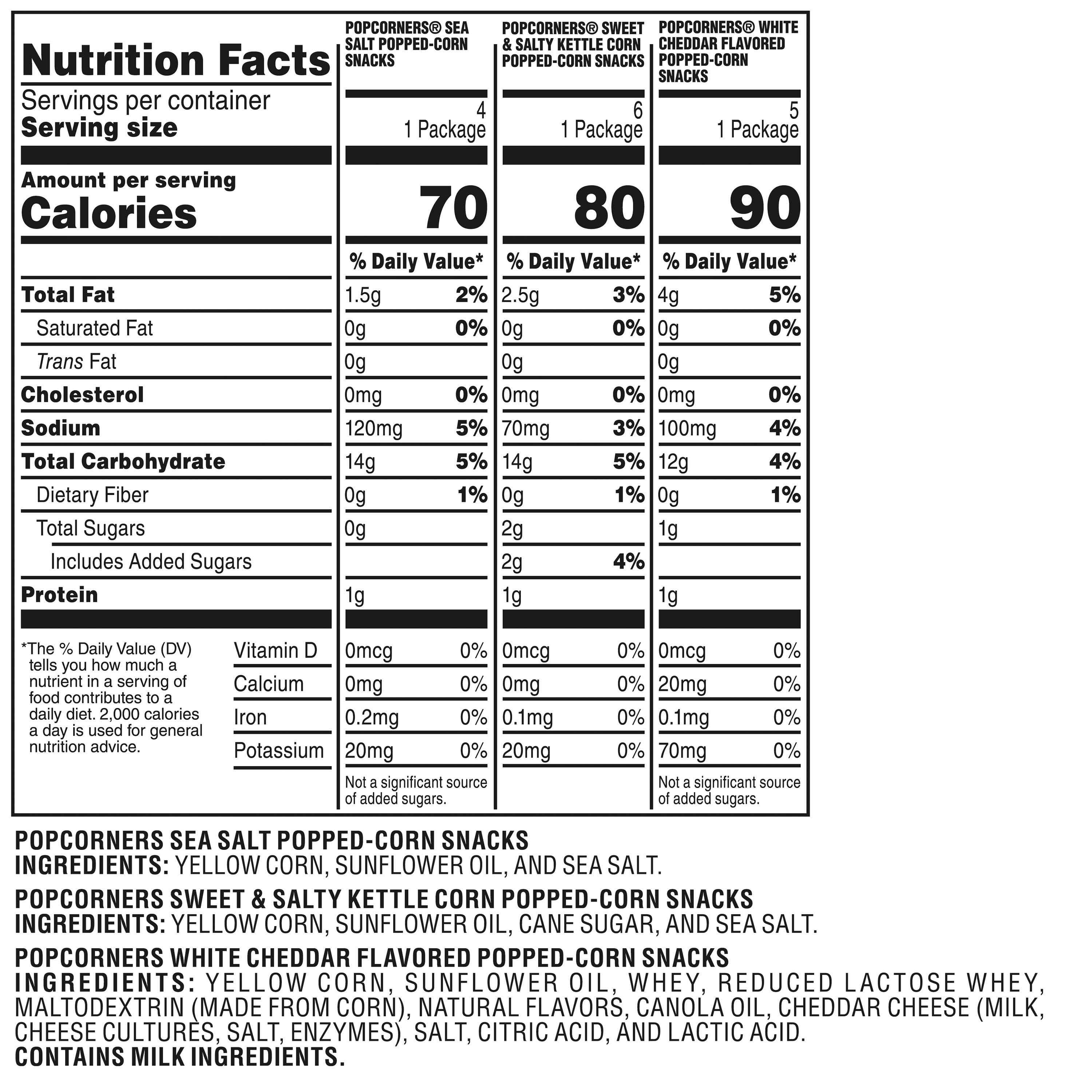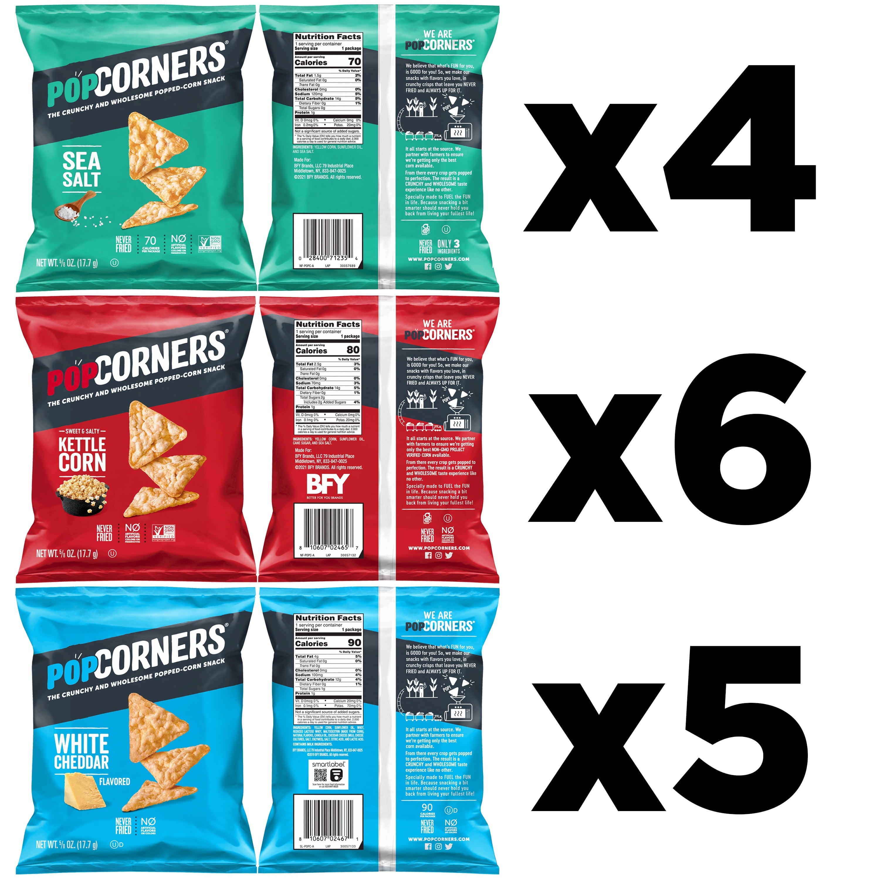 15 count packaging of PopCorners Multipack. Shelf-Stable / Ambient. Multipack Retail Packaging. Frito-Lay Chips and Snacks. Perfect for on the go snacking and adventures the whole family can enjoy! PopCorners are the delicious snack that makes it easier than ever to SNACK BETTER! Drizzled in sunflower oil with a pinch of sea salt, our chips are made with non-GMO corn and never fried. No gluten, no nuts. Just simple ingredients for great tasting flavor.