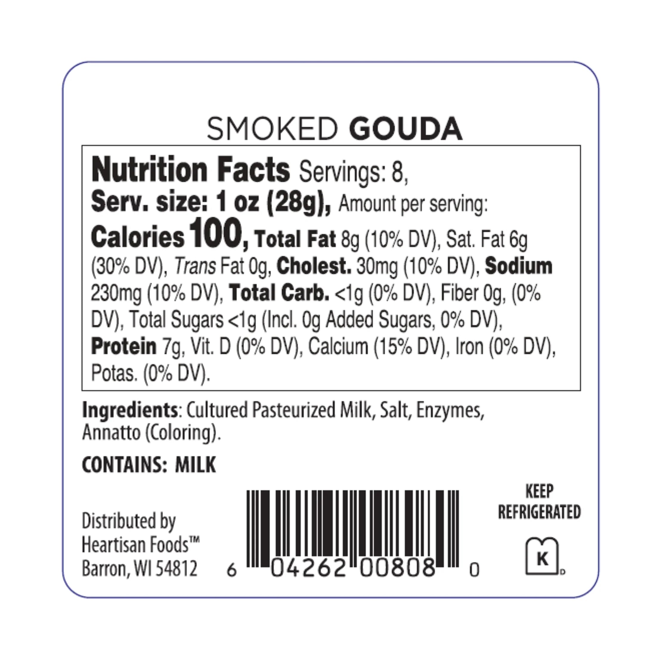 Red Apple Cheese Apple Smoked Natural Gouda, 8 oz Round, Vacuum Pack, Refrigerated. One bite of this cheese and we’re confident you’ll call it the best Smoked Gouda you’ve ever tried. Prepared using our natural cold smoking process from the Red Apple Cheese wood-fired ovens, our Smoked Gouda boasts rich, caramelly flavors. Add this to your cart now, your friends will thank you later. This diverse flavor pairs nicely with everything from your custom charcuterie platters to include nuts, grapes and sausage; to casseroles, nachos, eggs, grilled cheese, and a glass of your favorite wine.