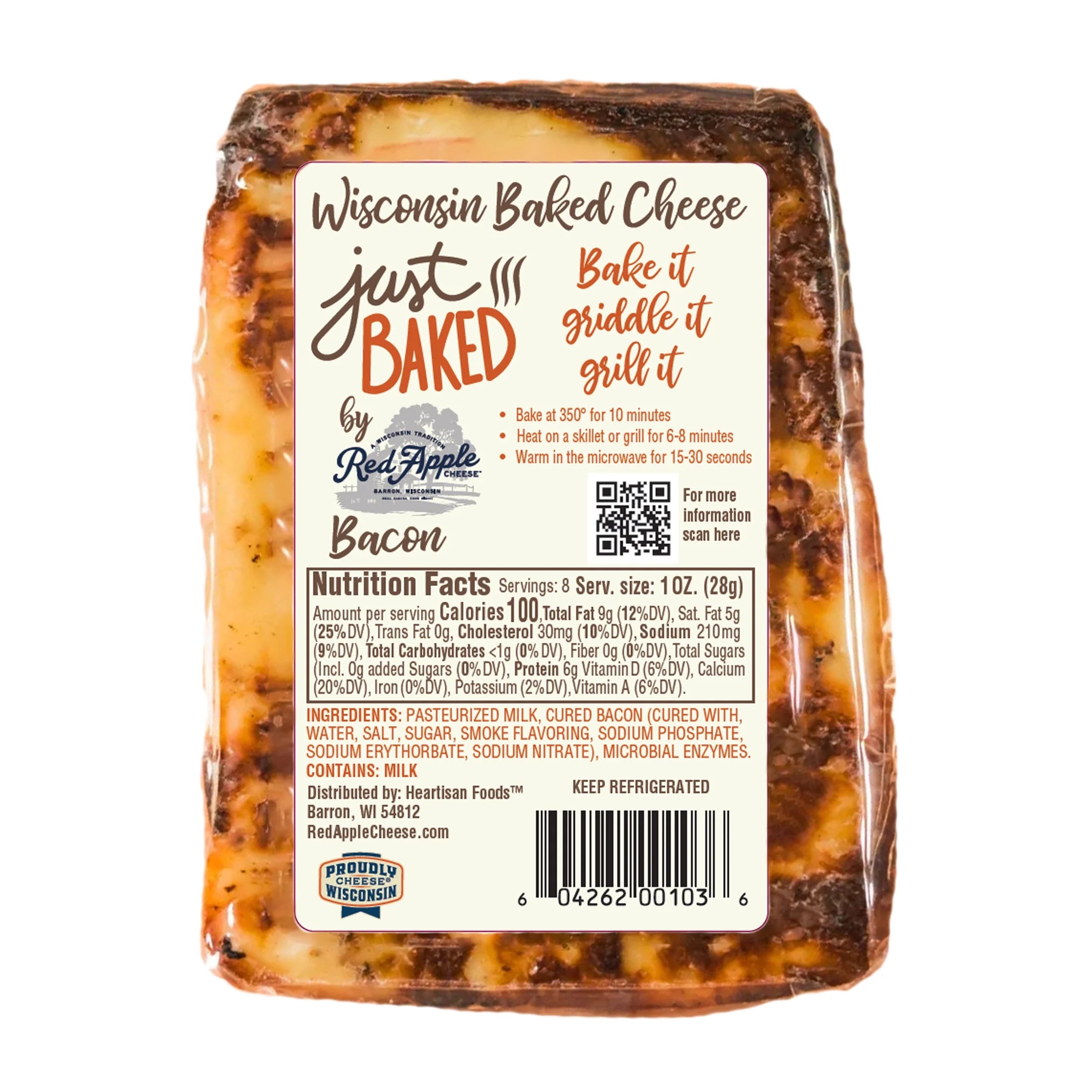 Red Apple Just Baked Bacon Cheese, 8 oz. Known as bread cheese in the dairy state of Wisconsin, our Red Apple Cheese Just Baked Bacon variety is the BEST cheese you’ve never heard of! We added real bits of bacon to create the perfect savory snack with this baked, buttery and squeaky cheese. Just Baked Bacon is a taste sensation perfect for breakfast, lunch, or a late-night snack.