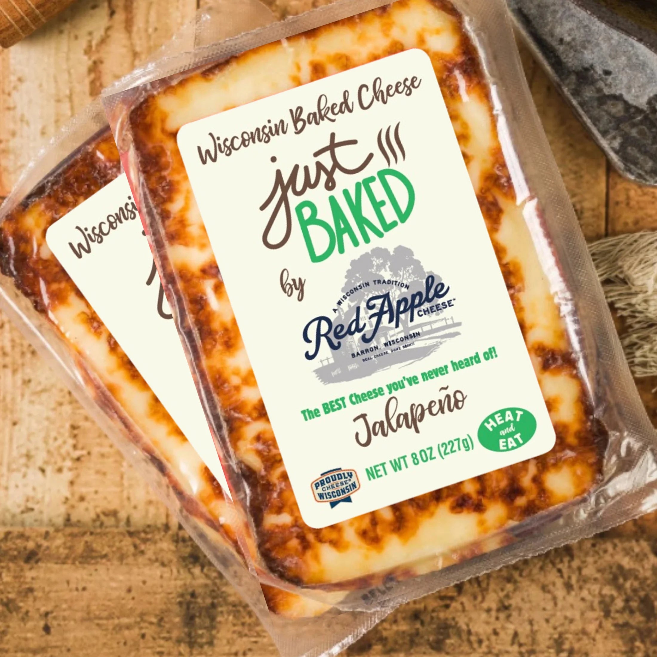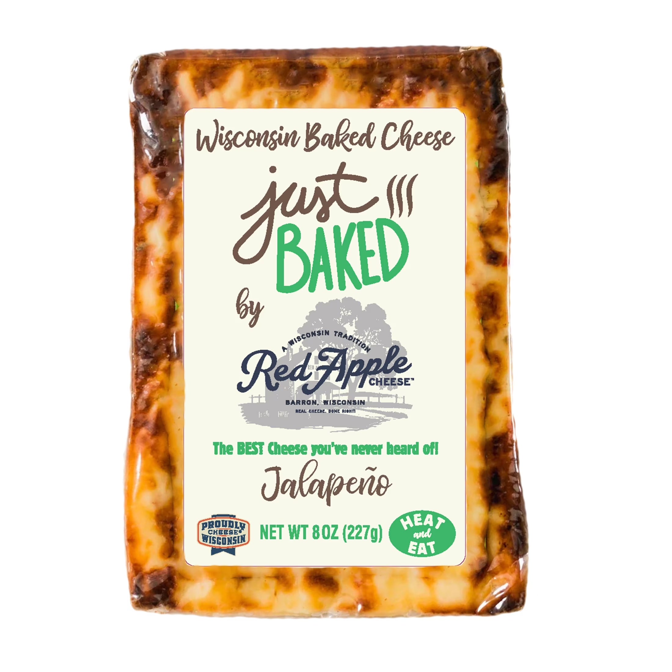 Red Apple Just Baked Jalapeno Cheese, 8 oz. Known as bread cheese in Wisconsin, our Red Apple Cheese Just Baked Jalapeno is the BEST cheese you’ve never heard of! We added just the right amount of jalapeño peppers to this buttery heat and eat cheese, giving it a spicy edge that will keep you coming back for more. Serve and eat it hot paired with your favorite salsa or as a perfect accompaniment to your chorizo tacos.