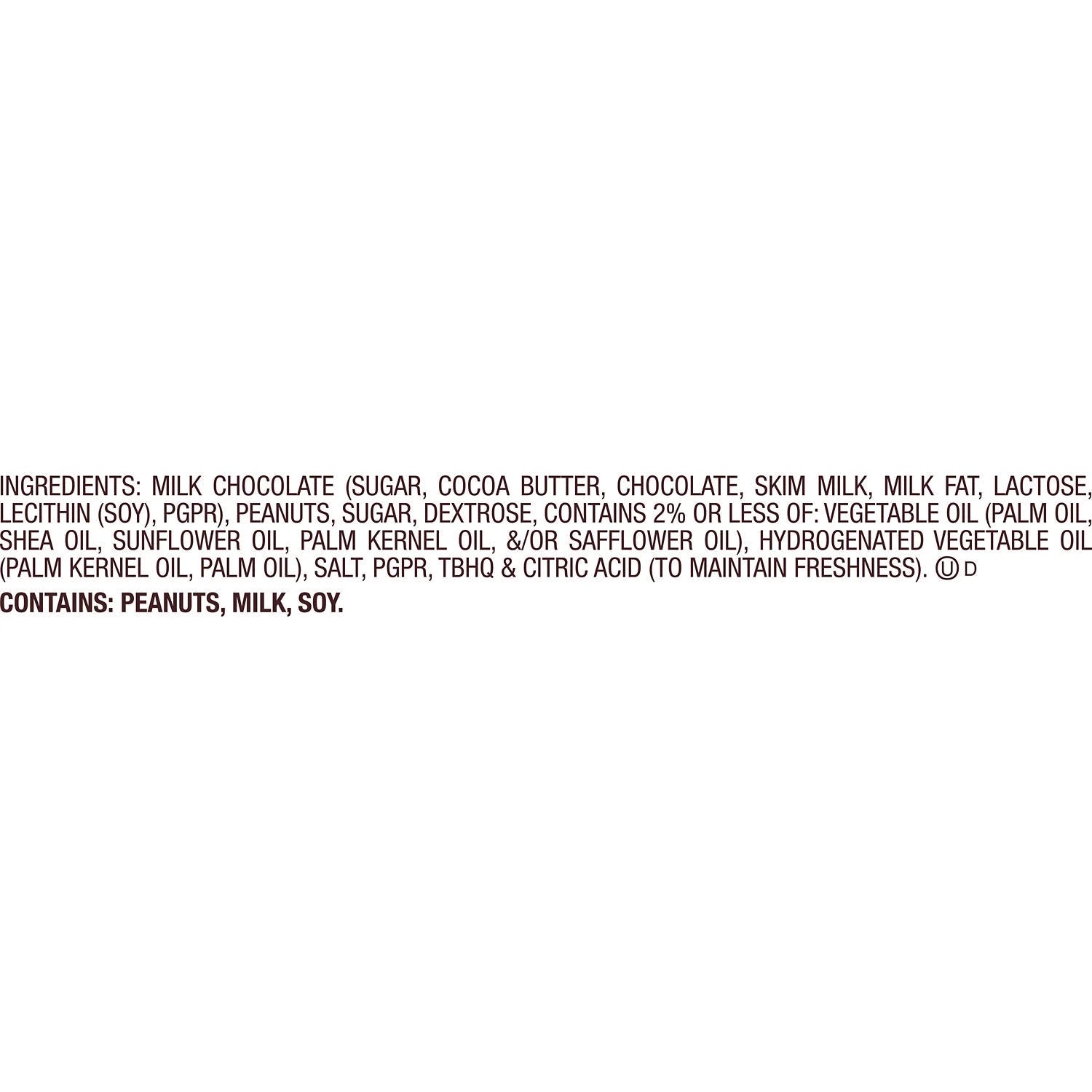 MILK CHOCOLATE (SUGAR, COCOA BUTTER, CHOCOLATE, SKIM MILK, MILK FAT, LACTOSE, LECITHIN (SOY), PGPR), PEANUTS, SUGAR, DEXTROSE, CONTAINS 2% OR LESS OF: VEGETABLE OIL (PALM OIL, SHEA OIL, SUNFLOWER OIL, PALM KERNEL OIL, &/OR SAFFLOWER OIL), HYDROGENATED VEGETABLE OIL (PALM KERNEL OIL, PALM OIL), SALT, PGPR, TBHQ & CITRIC ACID (TO MAINTAIN FRESHNESS)./div>
