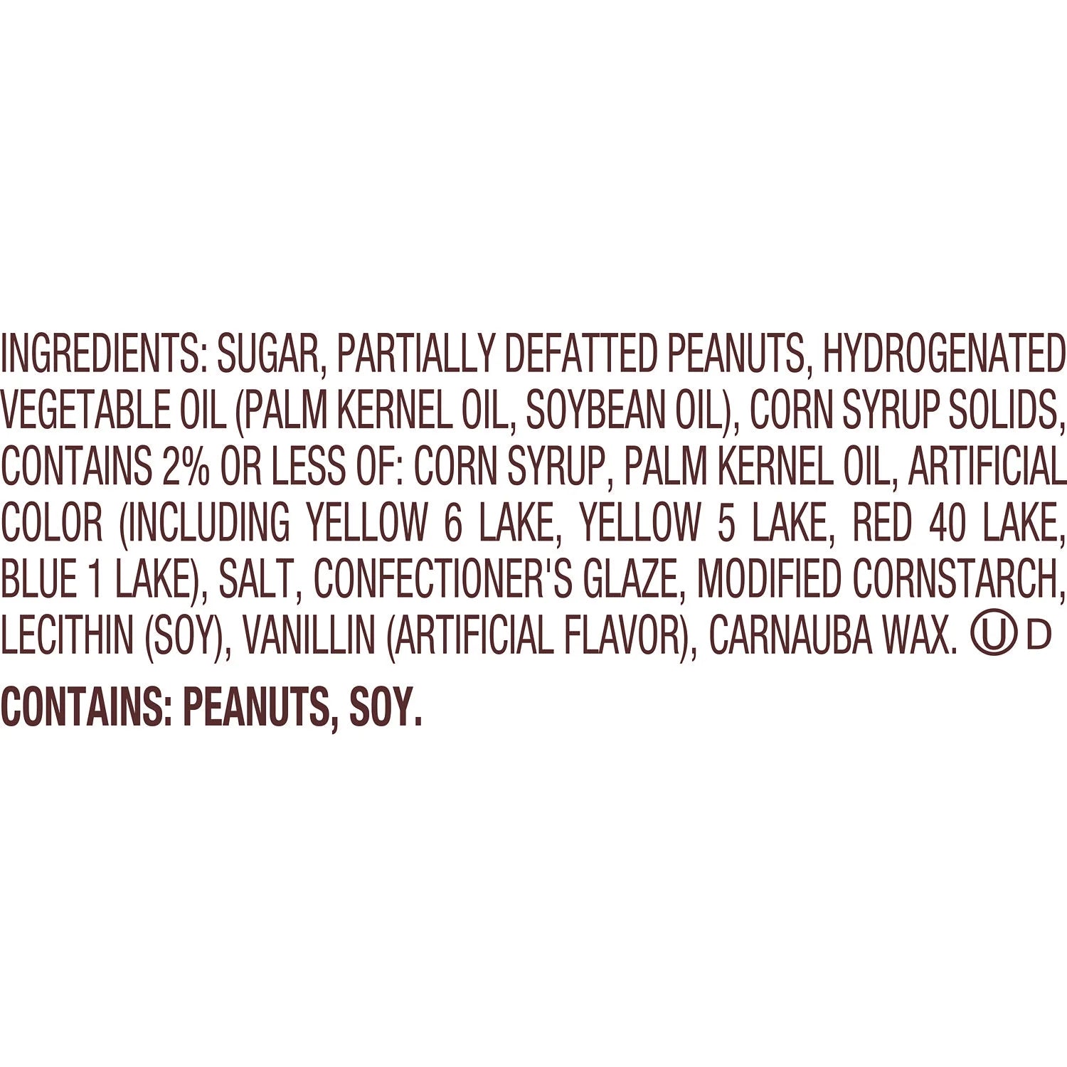 SUGAR, PARTIALLY DEFATTED PEANUTS, HYDROGENATED VEGETABLE OIL (PALM KERNEL OIL, SOYBEAN OIL), CORN SYRUP SOLIDS, CONTAINS 2% OR LESS OF: PALM KERNEL OIL, CORN SYRUP, SALT, ARTIFICIAL COLOR (INCLUDING YELLOW 6 LAKE, YELLOW 5 LAKE, RED 40 LAKE, BLUE 1 LAKE), MODIFIED CORNSTARCH, CONFECTIONER'S GLAZE, LECITHIN (SOY), VANILLIN (ARTIFICIAL FLAVOR), CARNAUBA WAX./div>