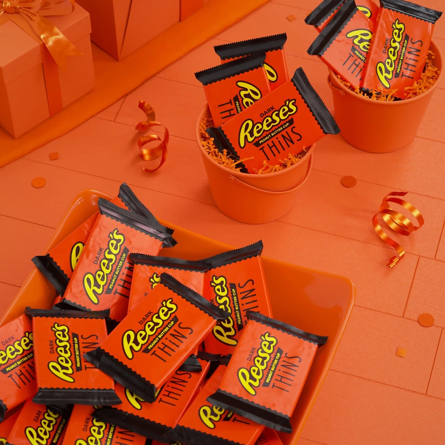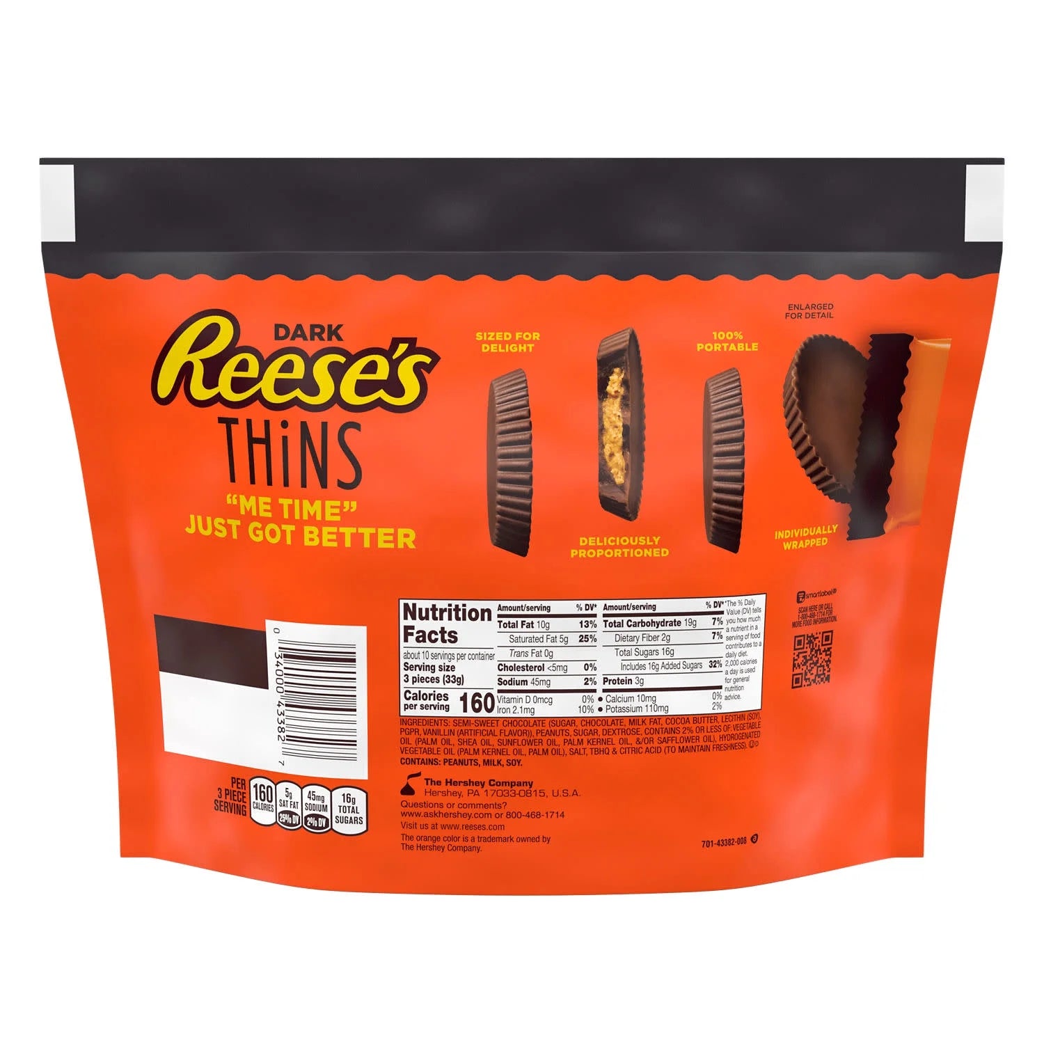 No, your eyes aren't playing tricks: REESE'S THiNS candy really is that thin! Indulge in the sweet combination of dark chocolate and peanut butter with these deliciously proportioned candies. REESE'S THiNS dark chocolate peanut butter cups are perfectly sized for sharing and snacking. Keep this bag on hand for a bite of something sweet if you need an afternoon pick-me-up or want an easy, on-the-go snack. Ready to kick your movie night up a notch? Share a bag of these individually wrapped candies to keep everyone happily snacking throughout the film.