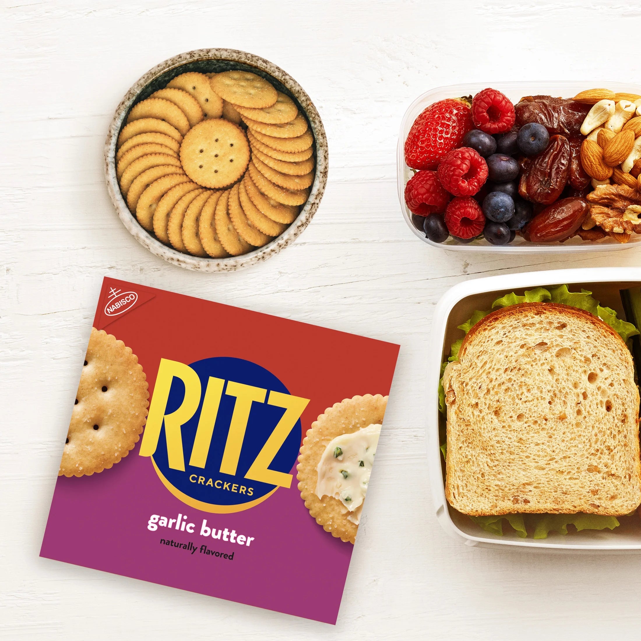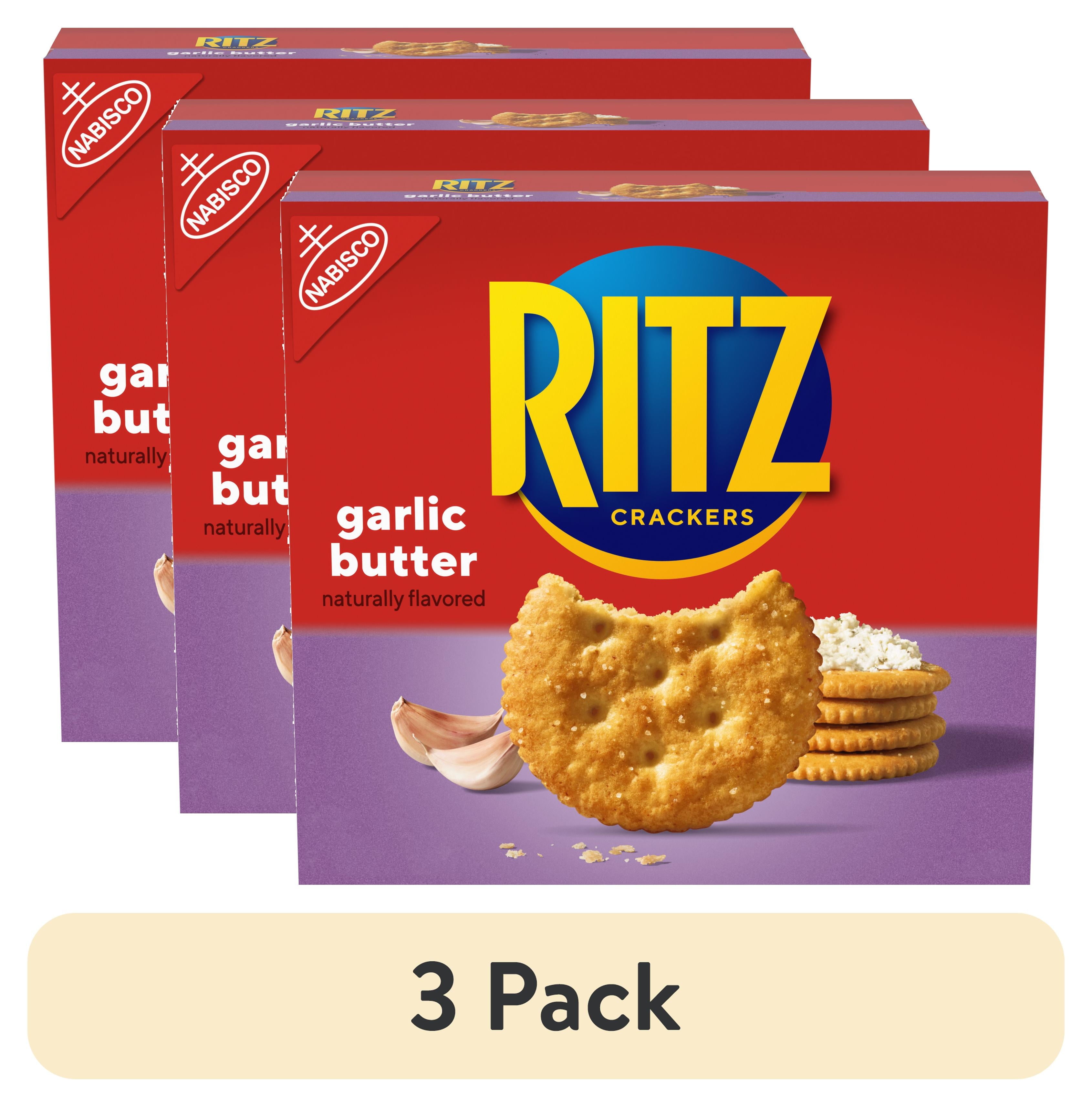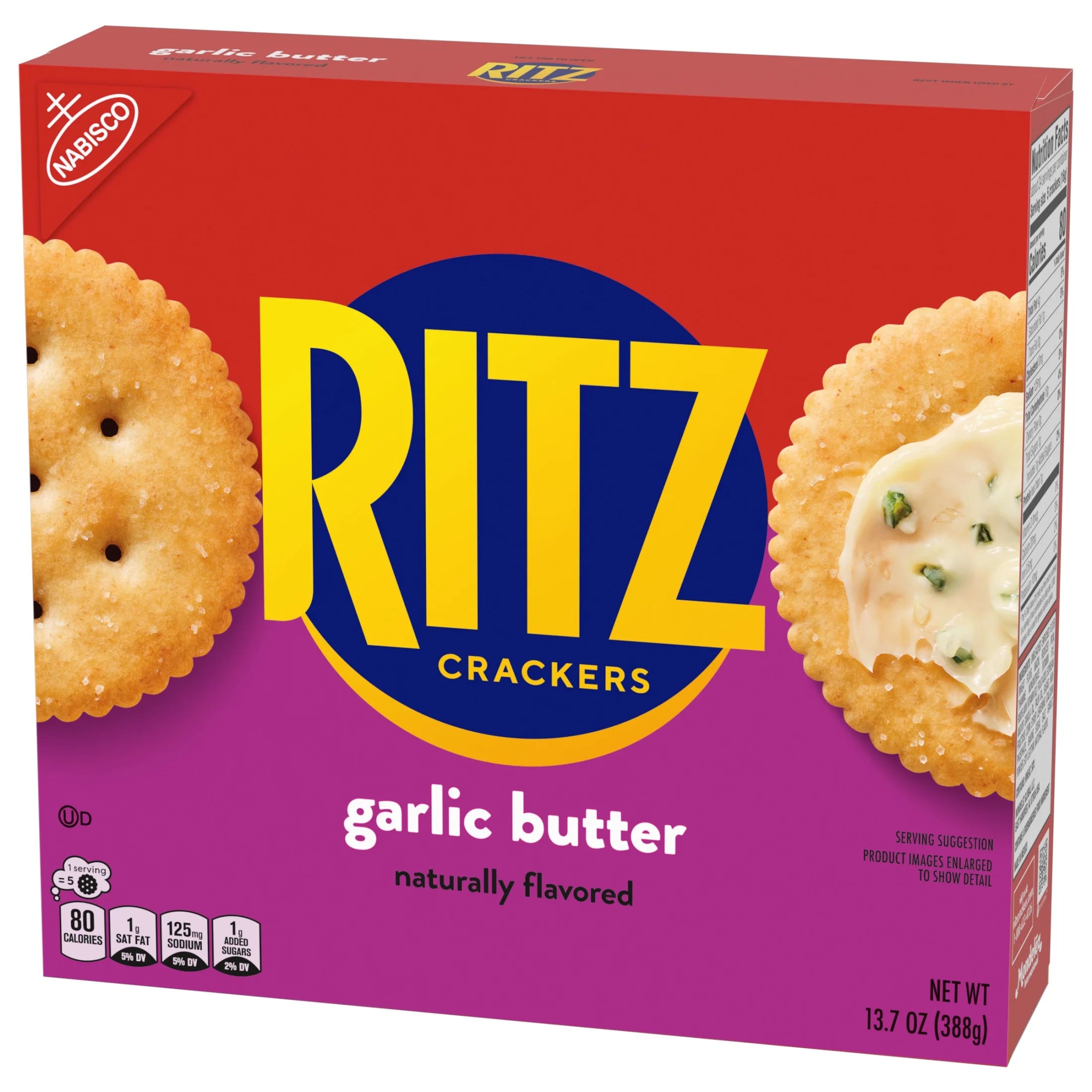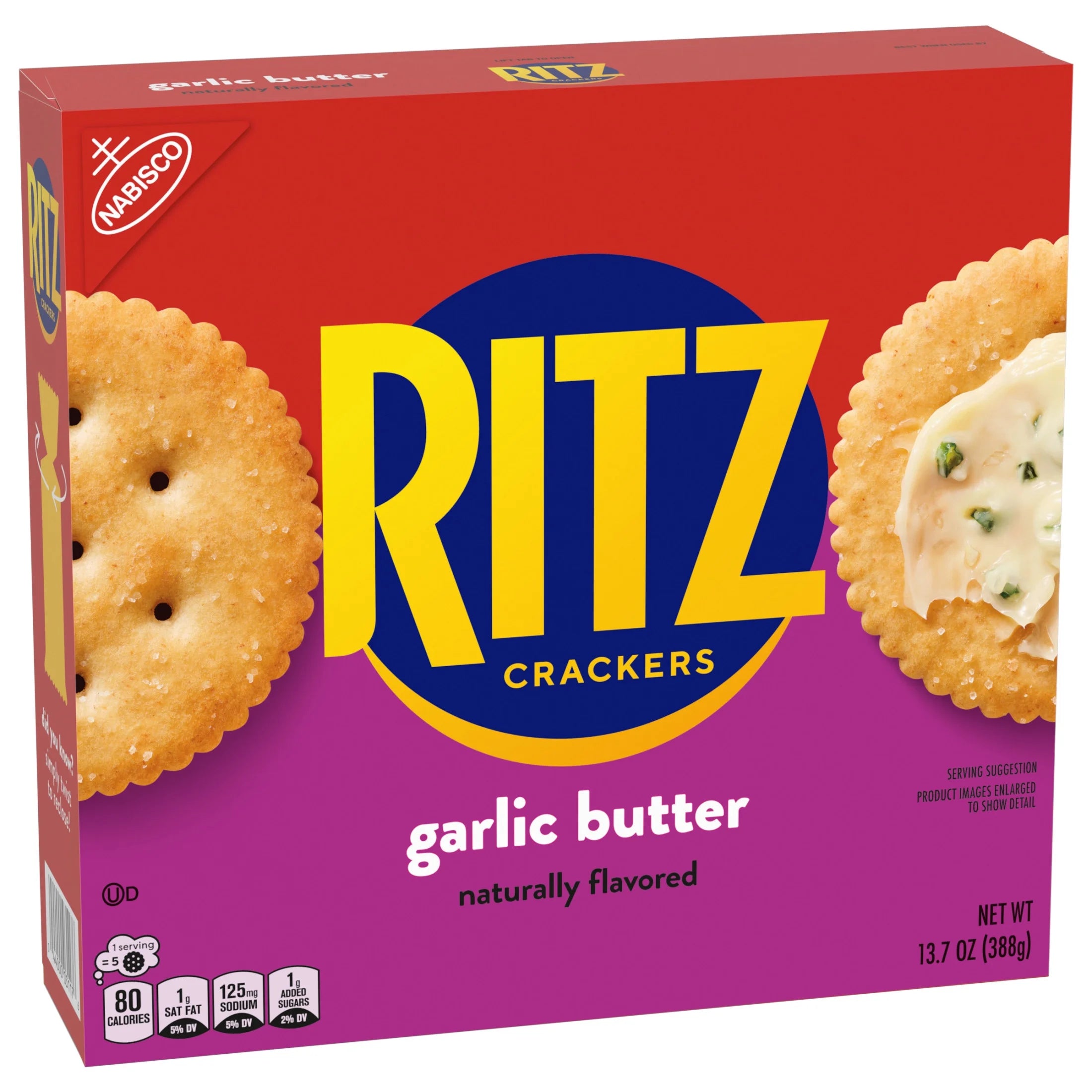 RITZ Garlic Butter crackers are the same flaky and delicious RITZ recipe you love, baked with a garlic butter flavor. RITZ traditional round crackers are a twist on the classic RITZ cracker, with a garlic butter taste that pairs well with almost any topping. RITZ Garlic Butter Crackers are delicious all on their own too, so keep these kosher dairy snacks on your shelf of salty snacks for an easy anytime treat. Each box includes one 13.7 ounce package of RITZ crackers.