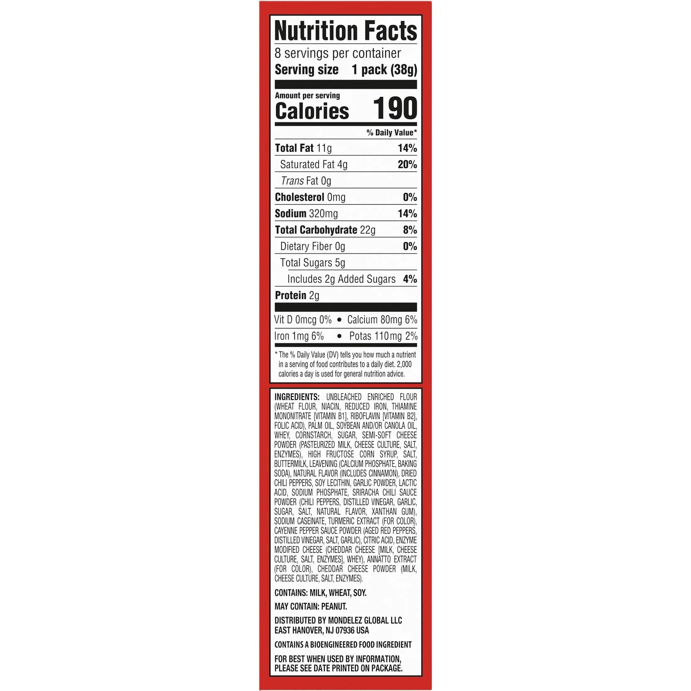 Unbleached Enriched Flour (Wheat Flour, Niacin, Reduced Iron, Thiamine Mononitrate [Vitamin B1], Riboflavin [Vitamin B2], Folic Acid), Palm Oil, Soybean And/Or Canola Oil, Whey, Cornstarch, Sugar, Semi-Soft Cheese Powder (Pasteurized Milk, Cheese Culture, Salt, Enzymes), High Fructose Corn Syrup, Salt, Buttermilk, Leavening (Calcium Phosphate, Baking Soda), Natural Flavor (Includes Cinnamon), Dried Chili Peppers, Soy Lecithin, Garlic Powder, Lactic Acid, Sodium Phosphate, Sriracha Chili Sauce Powder (Chili Peppers, Distilled Vinegar, Garlic, Sugar, Salt, Natural Flavor, Xanthan Gum), Sodium Caseinate, Turmeric Extract (For Color), Cayenne Pepper Sauce Powder (Aged Red Peppers, Distilled Vinegar, Salt, Garlic), Citric Acid, Enzyme Modified Cheese (Cheddar Cheese [Milk, Cheese Culture, Salt, Enzymes], Whey), Annatto Extract (For Color), Cheddar Cheese Powder (Milk, Cheese Culture, Salt, Enzymes). Contains: Milk, Wheat, Soy. May Contain: Peanut./div>