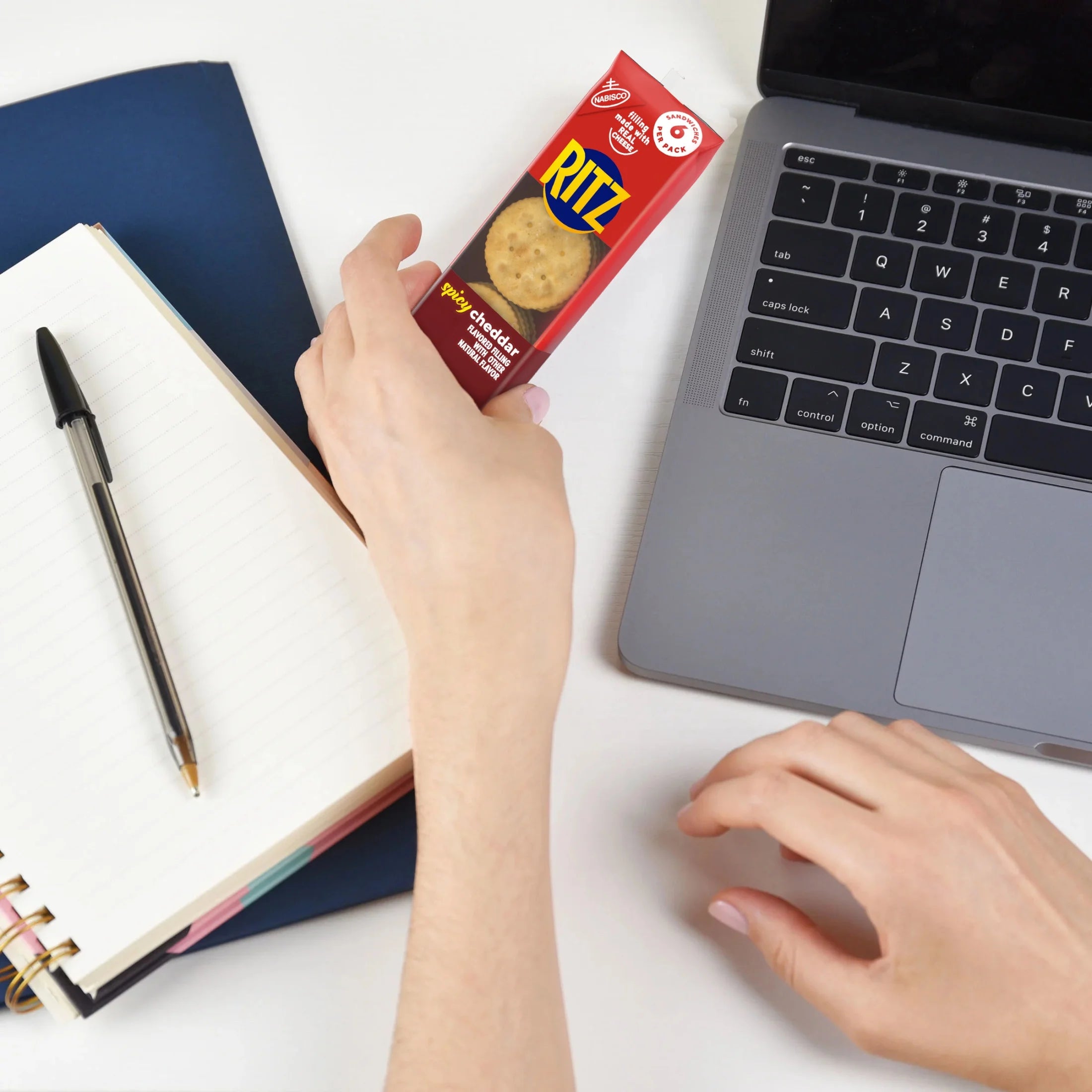 - RITZ snack crackers with cheese spread that make great office snacks and after-school snacks for kids and adults; wonderful on the go snacks and travel snacks