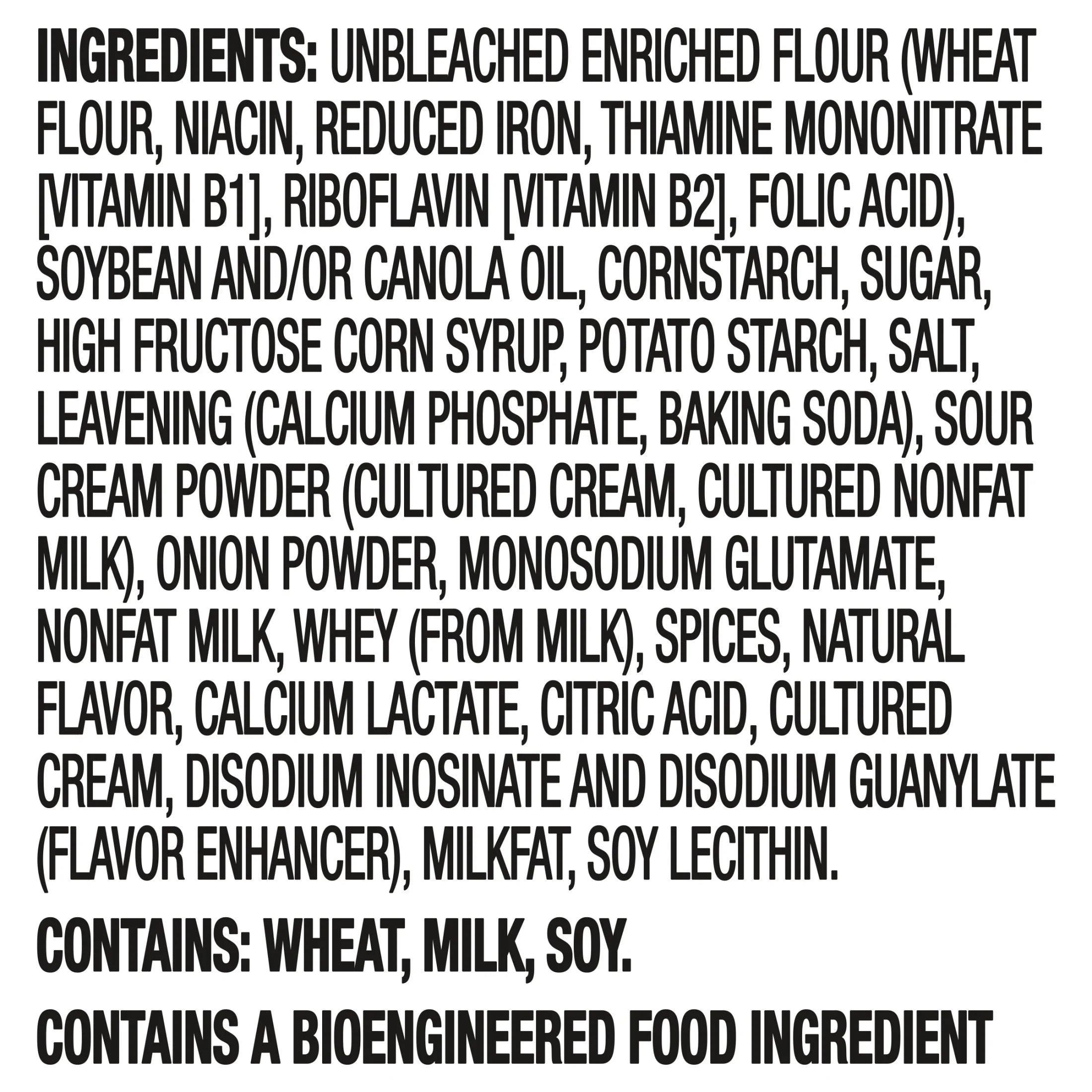 Unbleached Enriched Flour (Wheat Flour, Niacin, Reduced Iron, Thiamine Mononitrate [Vitamin B1], Riboflavin [Vitamin B2], Folic Acid), Soybean And/Or Canola Oil, Cornstarch, Sugar, High Fructose Corn Syrup, Potato Starch, Salt, Leavening (Calcium Phosphate, Baking Soda), Sour Cream Powder (Cultured Cream, Cultured Nonfat Milk), Onion Powder, Monosodium Glutamate, Nonfat Milk, Whey (From Milk), Spices, Natural Flavor, Calcium Lactate, Citric Acid, Cultured Cream, Disodium Inosinate And Disodium Guanylate (Flavor Enhancer), Milkfat, Soy Lecithin.Contains: Wheat, Milk, Soy./div>