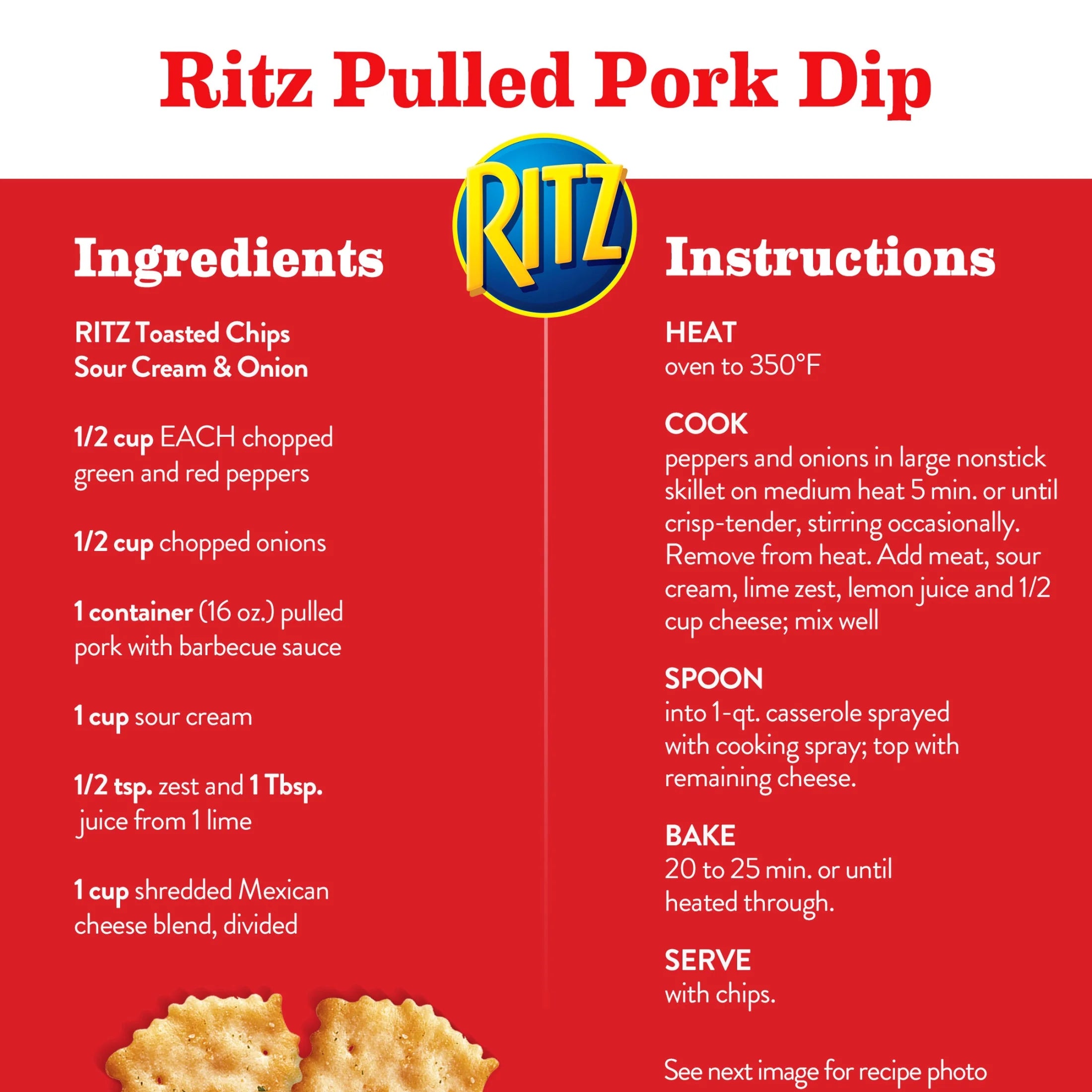 - One 11.4 oz family size bag of RITZ Sour Cream and Onion Toasted Chips (packaging may vary)