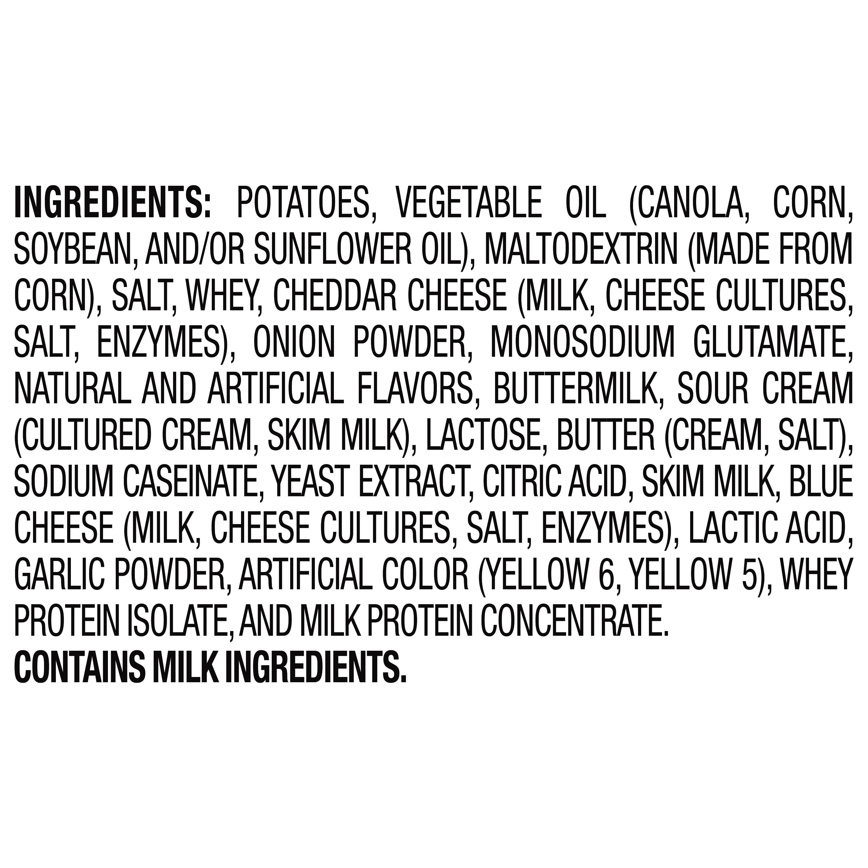 Potatoes, Vegetable Oil (Canola, Corn, Soybean, and/or Sunflower Oil), Maltodextrin (made from Corn), Salt, Whey, Cheddar Cheese (Milk, Cheese Cultures, Salt, Enzymes), Onion Powder, Monosodium Glutamate, Natural and Artificial Flavors, Buttermilk, Sour Cream (Cultured Cream, Skim Milk), Lactose, Butter (Cream, Salt), Sodium Caseinate, Yeast Extract, Citric Acid, Skim Milk, Blue Cheese (Milk, Cheese Cultures, Salt, Enzymes), Lactic Acid, Garlic Powder, Artificial Color (Yellow 6, Yellow 5), Whey Protein Isolate, Milk Protein Concentrate/div>