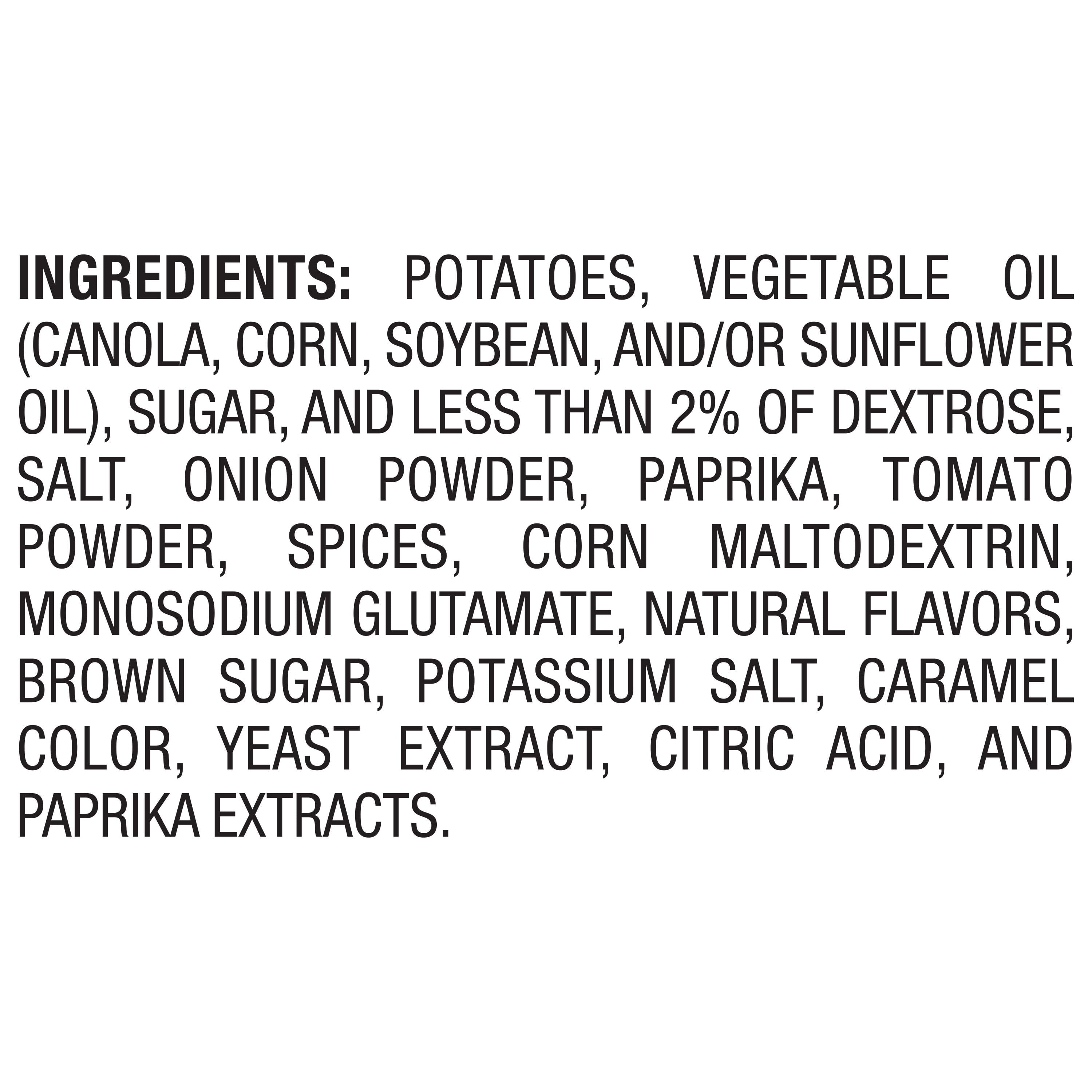 Potatoes, Vegetable Oil (Canola, Corn, Soybean, And/Or Sunflower Oil), Sugar, And Less Than 2% Of Dextrose, Salt, Onion Powder, Paprika, Tomato Powder, Spices, Corn Maltodextrin, Monosodium Glutamate, Natural Flavors, Brown Sugar, Potassium Salt, Caramel Color, Yeast Extract, Citric Acid, And Paprika Extracts/div>