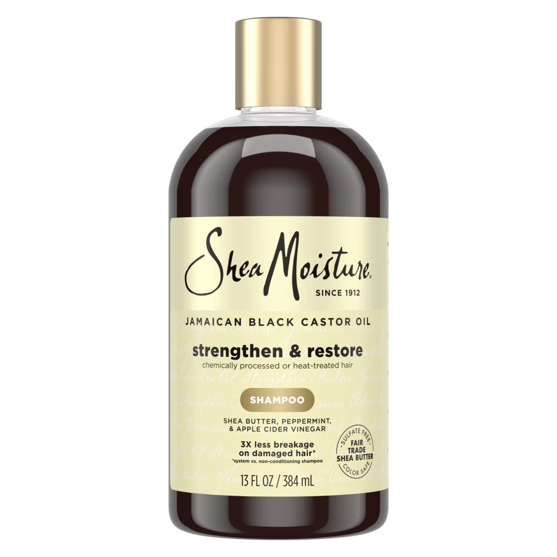 SheaMoisture Strengthen & Restore Nourishing Shampoo 100% Pure Jamaican Black Castor Oil, 13 oz. New and improved formula with a creamy lather! SheaMoisture Jamaican Black Castor Oil Strengthen & Restore Shampoo is a clarifying shampoo that gently cleanses to remove buildup on hair. This SheaMoisture Jamaican Black Castor Oil Strengthen & Restore Shampoo for damaged hair is perfect for those who color, relax, straighten, perm or heat style their hair, as well as kinky, curly or wavy natural styles. Formulated with Jamaican Black Castor Oil and Shea Butter as well as Peppermint Oil to help invigorate the scalp for a tingling experience. Use together with Strengthen & Restore Conditioner for 3X less breakage, as well as restored strength and resilience to damaged hair. For adult use.