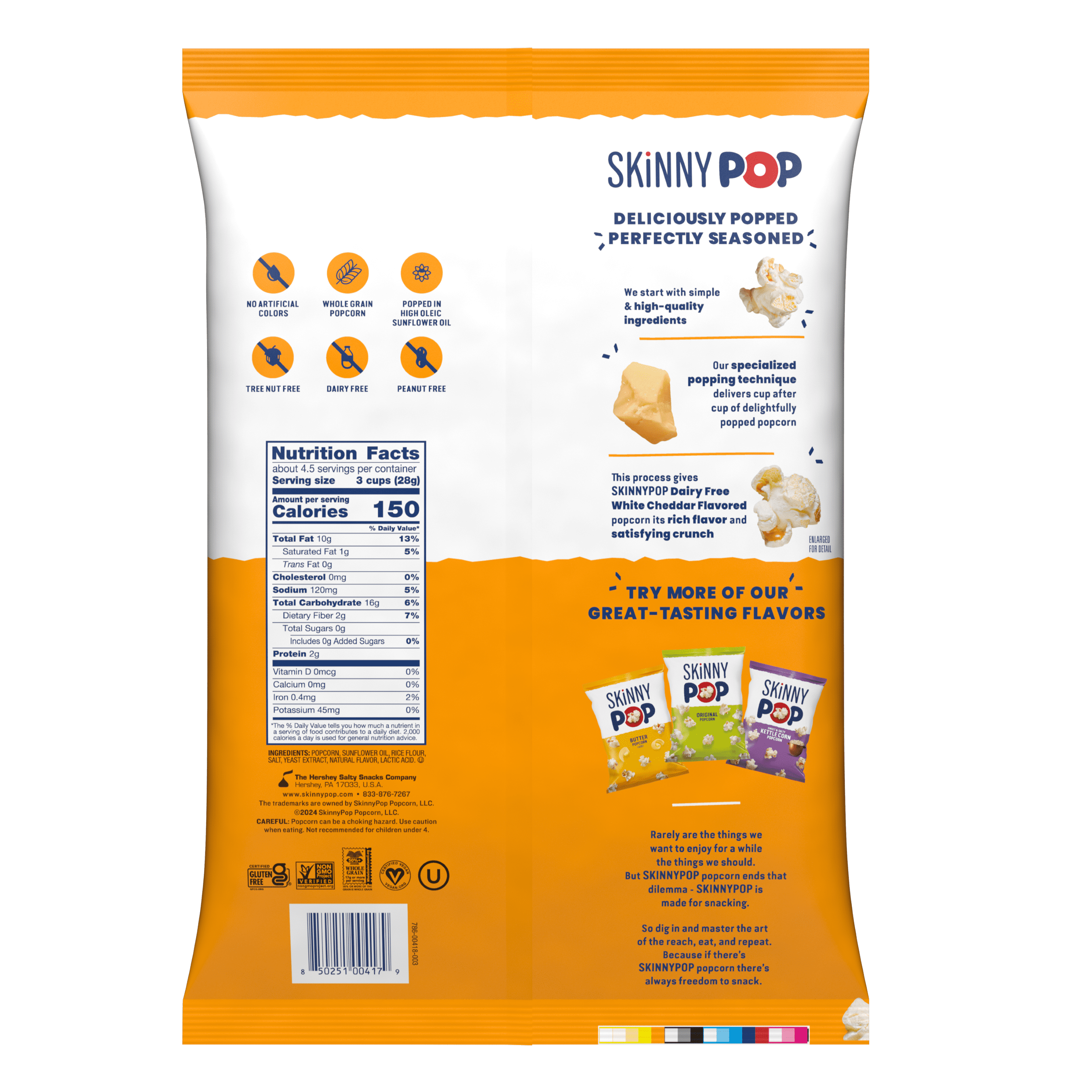 SKINNYPOP WHITE CHEDDAR POPCORN IS THE GUILT-FREE SNACK WITH DAIRY-FREE WHITE CHEDDAR FLAVOR. THIS DELICIOUS VEGAN POPCORN CONTAIN 150 CALORIES PER SERVING. WE BELIEVE IN SNACKING WITHOUT COMPROMISE. TO US, THAT MEANS USING THE CLEANEST, FEWEST AND SIMPLEST INGREDIENTS POSSIBLE TO BRING YOU THE BEST TASTING POPCORN. INCLUDES ONE 4.4 OZ. BAG OF SKINNYPOP WHITE CHEDDAR POPCORN. SKINNYPOP STARTS WITH A PREMIUM POPCORN KERNEL, SUNFLOWER OIL AND THE PERFECT AMOUNT OF SALT. FROM THERE, "PURE POPPED PERFECTION" SAYS IT ALL. OUR POPCORN HAS NO GMOS, GLUTEN OR PRESERVATIVES, MAKING SKINNYPOP A TASTY, GUILT-FREE SNACK.