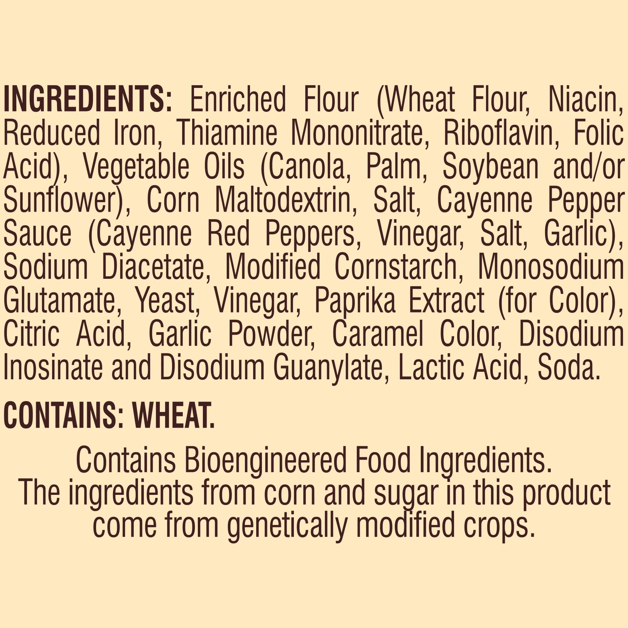 Ingredients: Enriched Flour (Wheat Flour, Niacin, Reduced Iron, Thiamine Mononitrate, Riboflavin, Folic Acid), Vegetable Oils (Canola, Palm, Soybean And/Or Sunflower), Corn Maltodextrin, Salt, Cayenne Pepper Sauce (Cayenne Red Peppers, Vinegar, Salt, Garlic), Sodium Diacetate, Modified Cornstarch, Monosodium Glutamate, Yeast, Vinegar, Paprika Extract (For Color), Citric Acid, Garlic Powder, Caramel Color, Disodium Inosinate And Disodium Guanylate, Lactic Acid, Soda. Contains: Wheat/div>
