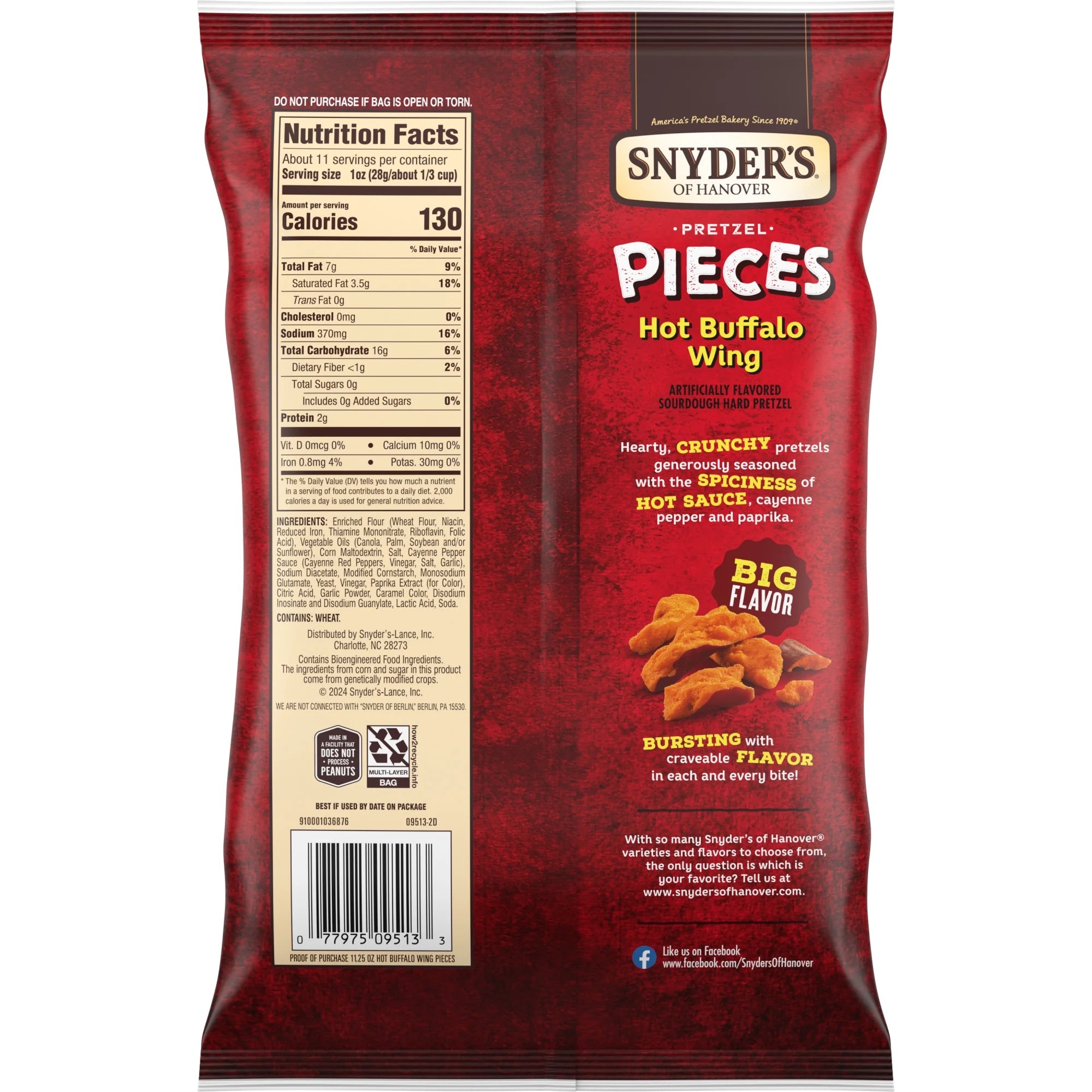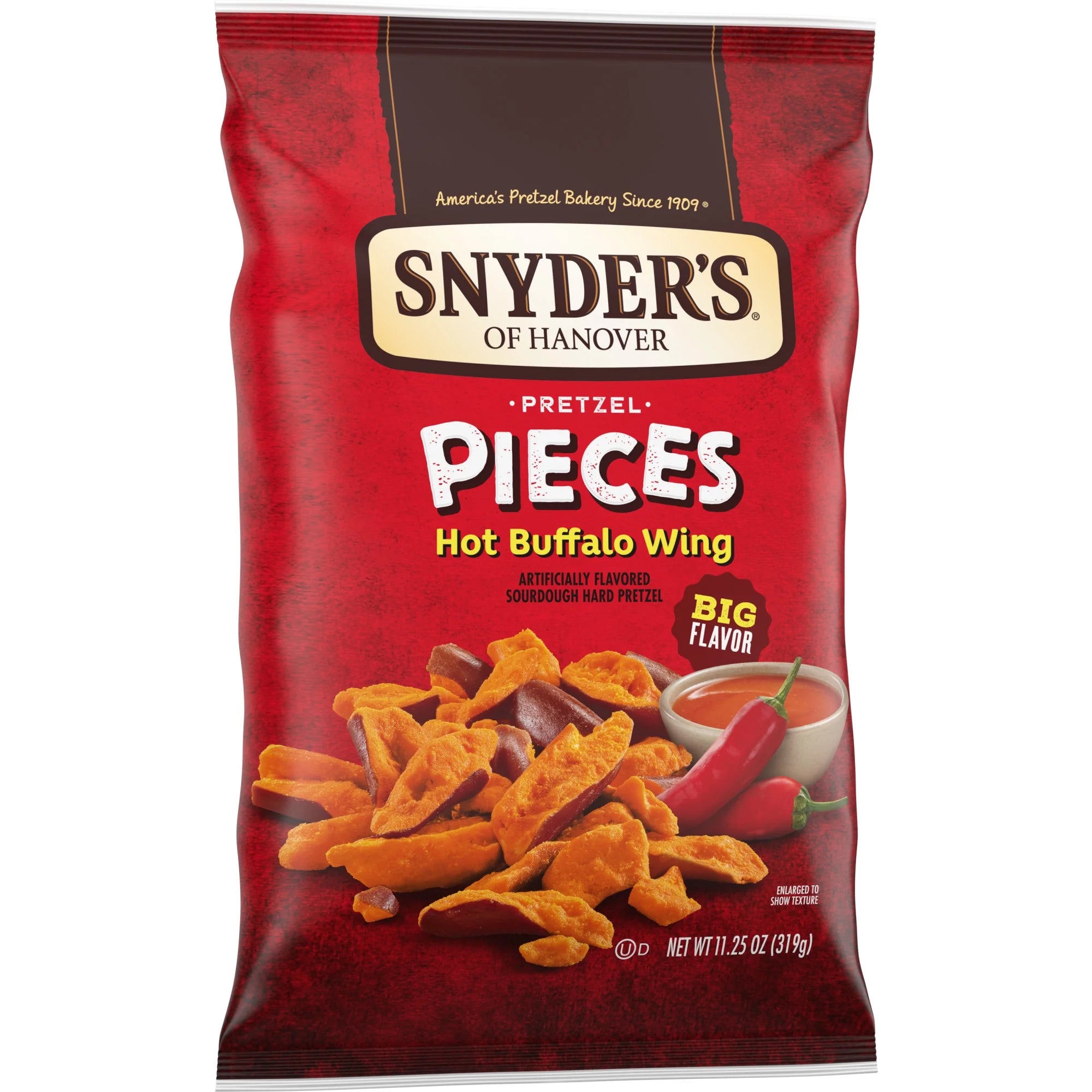 - Includes one (1) 11.25-ounce bag of Snyder's of Hanover Hot Buffalo Wing Flavored Pretzel Pieces