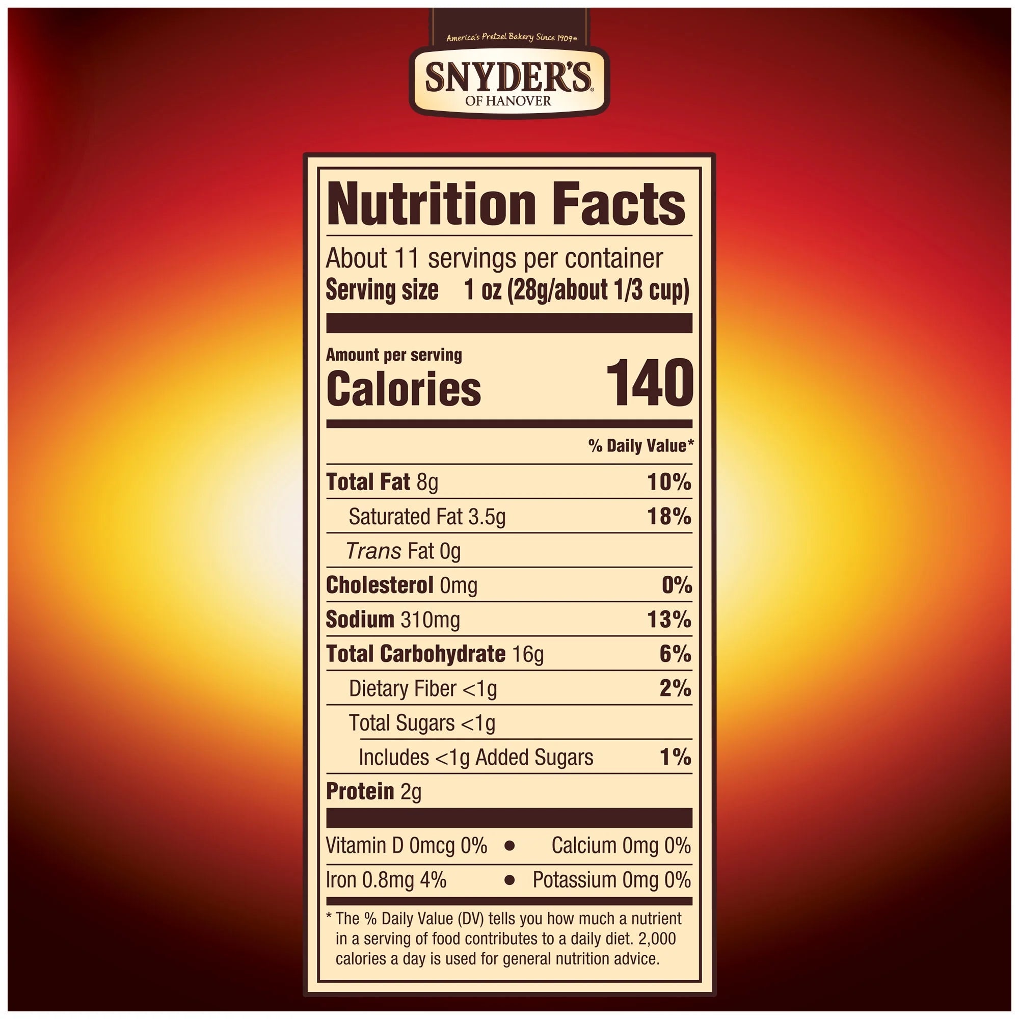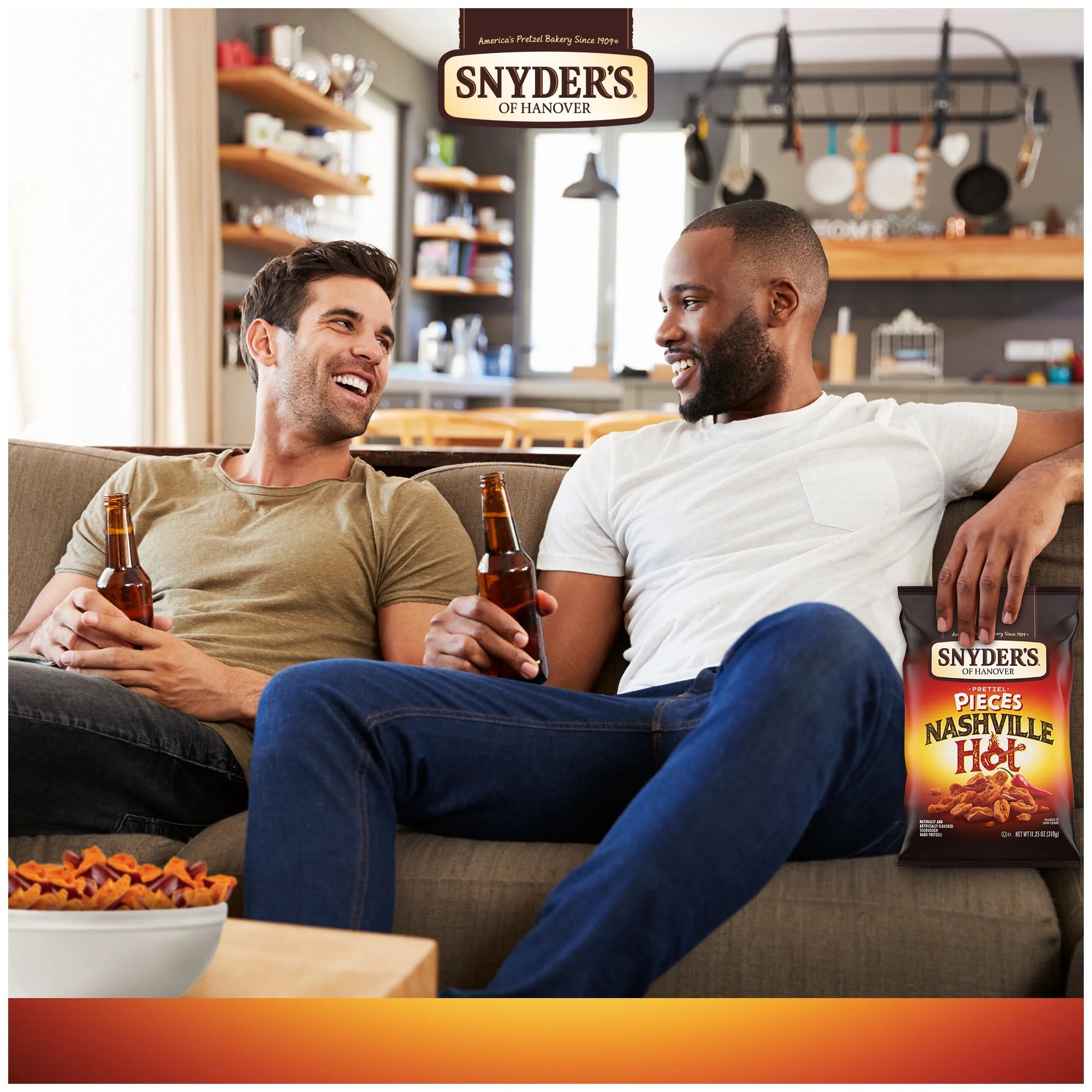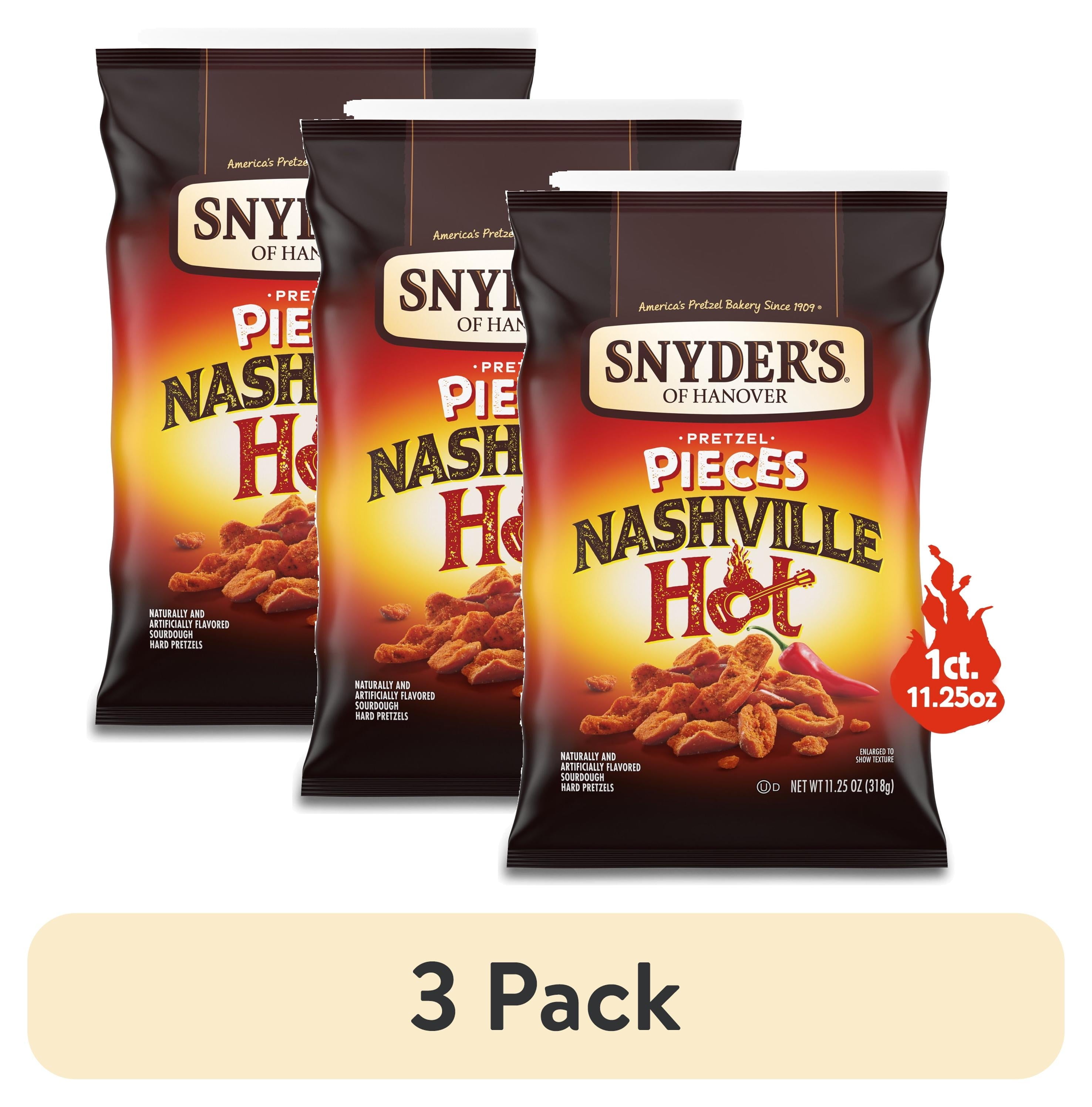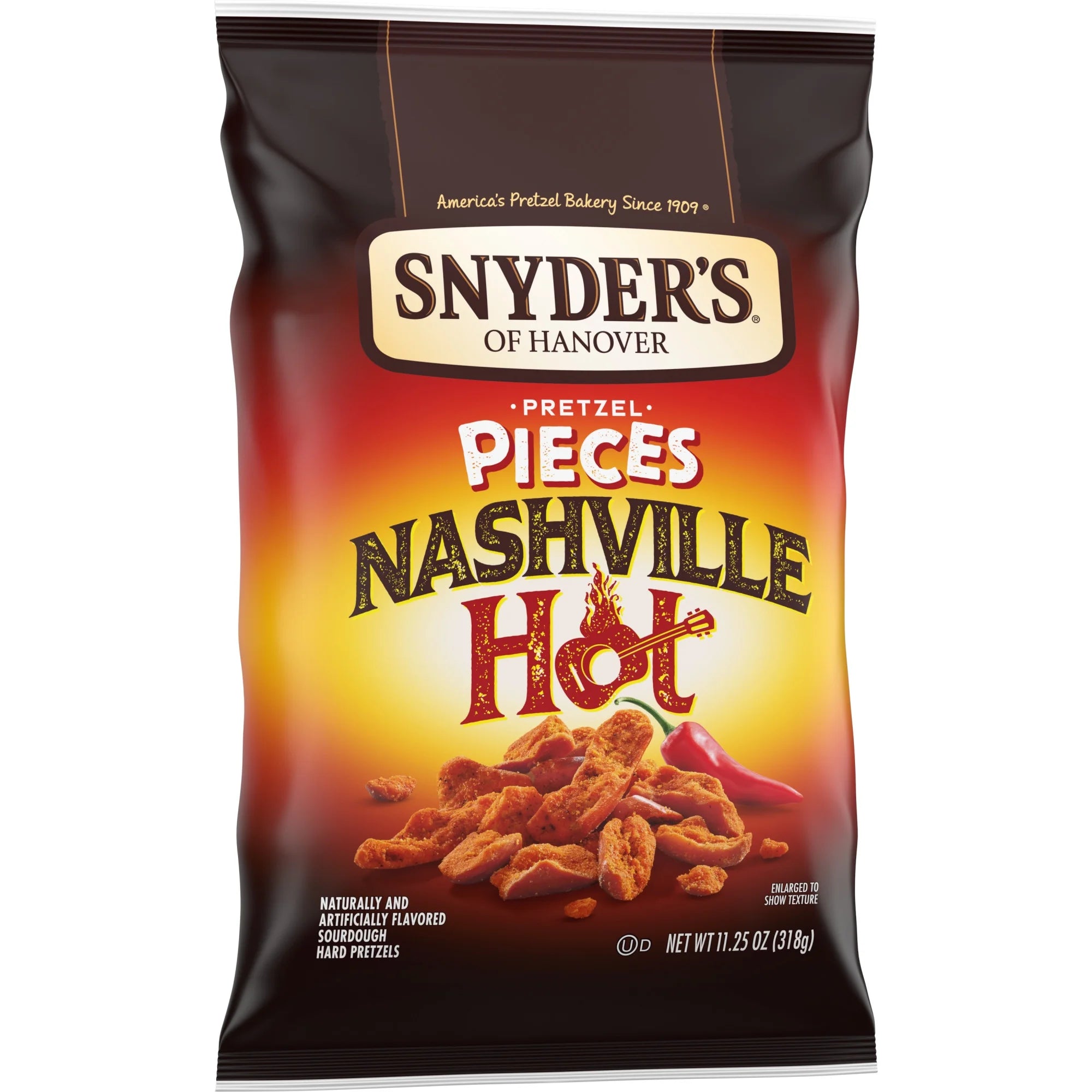 Snyder's of Hanover Nashville Hot Pretzel Pieces are bursting with big flavor! Nashville Hot Pieces combines the spicy, savory and tangy flavor of Nashville Hot sauce and a hint of pickle with the signature crunch of Snyder's pretzels. You'll love the crunch, heat, and hearty satisfaction found in every bite of these Snyder's Pretzel Pieces. Enjoy these crunchy pretzel pieces as a lunch snack or while watching your favorite sports game. Snyder's of Hanover has been America's Pretzel Bakery since 1909 and our pretzels give you that delicious crunch for the perfect snack! Made in a facility that does not process peanuts, Snyder's pretzels are made from select ingredients, kneaded, and oven-baked to seal in all the flavor. Each 11.25-oz bag of Nashville Hot Pieces contains roughly 11 servings, making them perfect for sharing. Shelf-stable product.