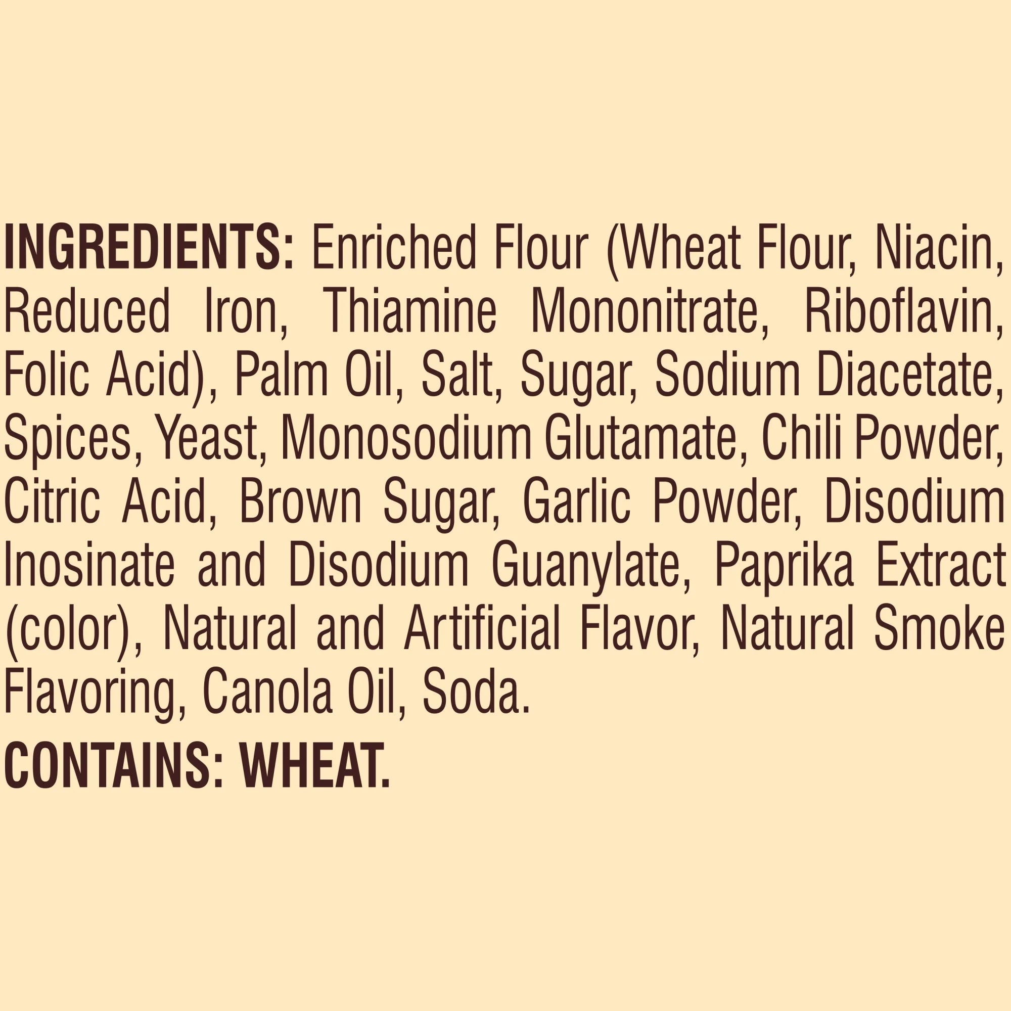 Ingredients: Enriched Flour (Wheat Flour, Niacin, Reduced Iron, Thiamine Mononitrate, Riboflavin, Folic Acid), Palm Oil, Salt, Sugar, Sodium Diacetate, Spices, Yeast, Monosodium Glutamate, Chili Powder, Citric Acid, Brown Sugar, Garlic Powder, Disodium Inosinate And Disodium Guanylate, Paprika Extract (Color), Natural And Artificial Flavor, Natural Smoke Flavoring, Canola Oil, Soda. Contains: Wheat/div>