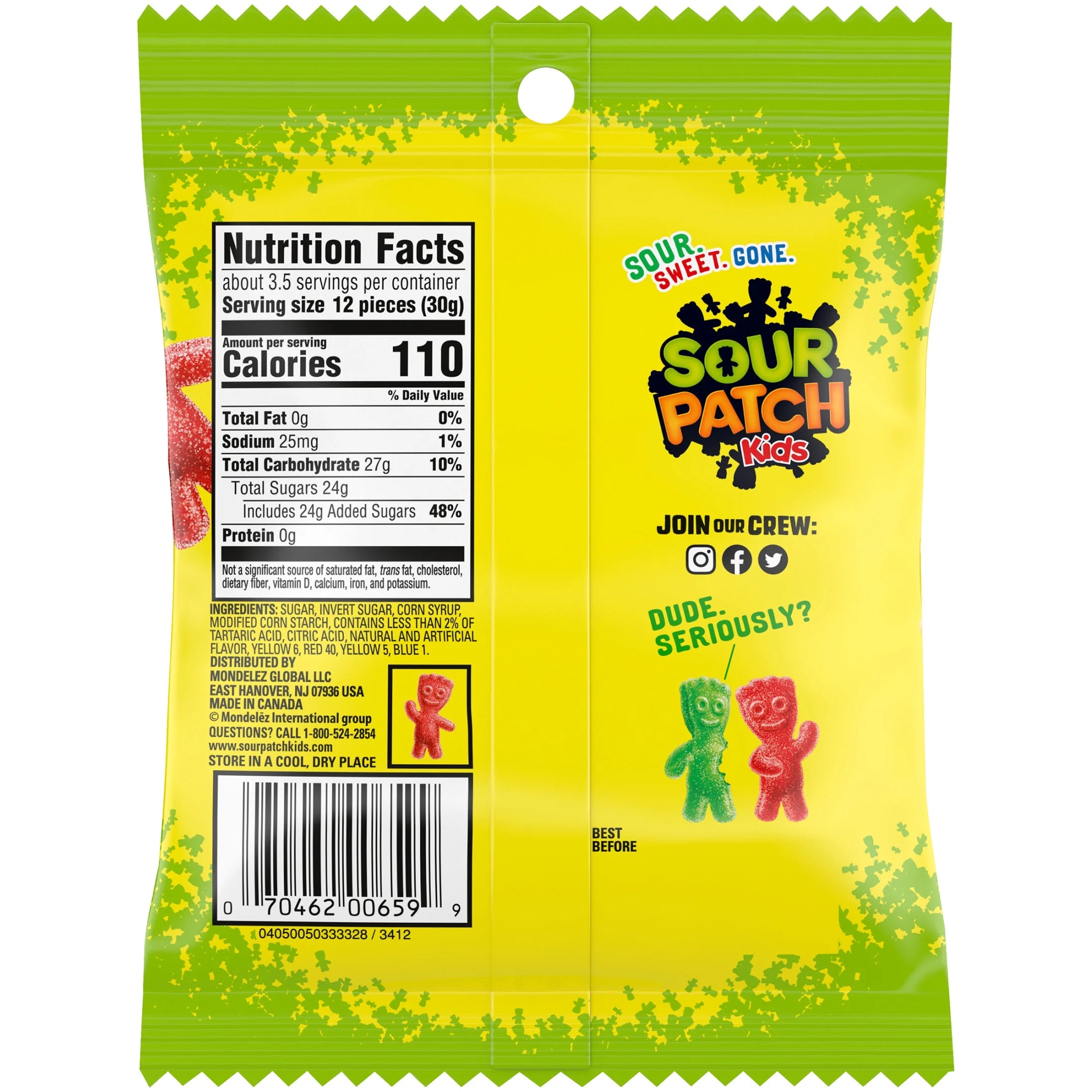 SOUR PATCH KIDS Soft & Chewy Candy packs all the classic flavor into a mischief-filled soft candy. SOUR PATCH KIDS chewy candy is a wholly delicious sweet treat that's SOUR. SWEET. GONE. A fat free food, this fruit flavored candy makes a great sour treat for multiple occasions. Enjoy this sour candy whenever you want a SOUR THEN SWEET treat by keeping a package on-hand for quick gummy snacks or party favors.
