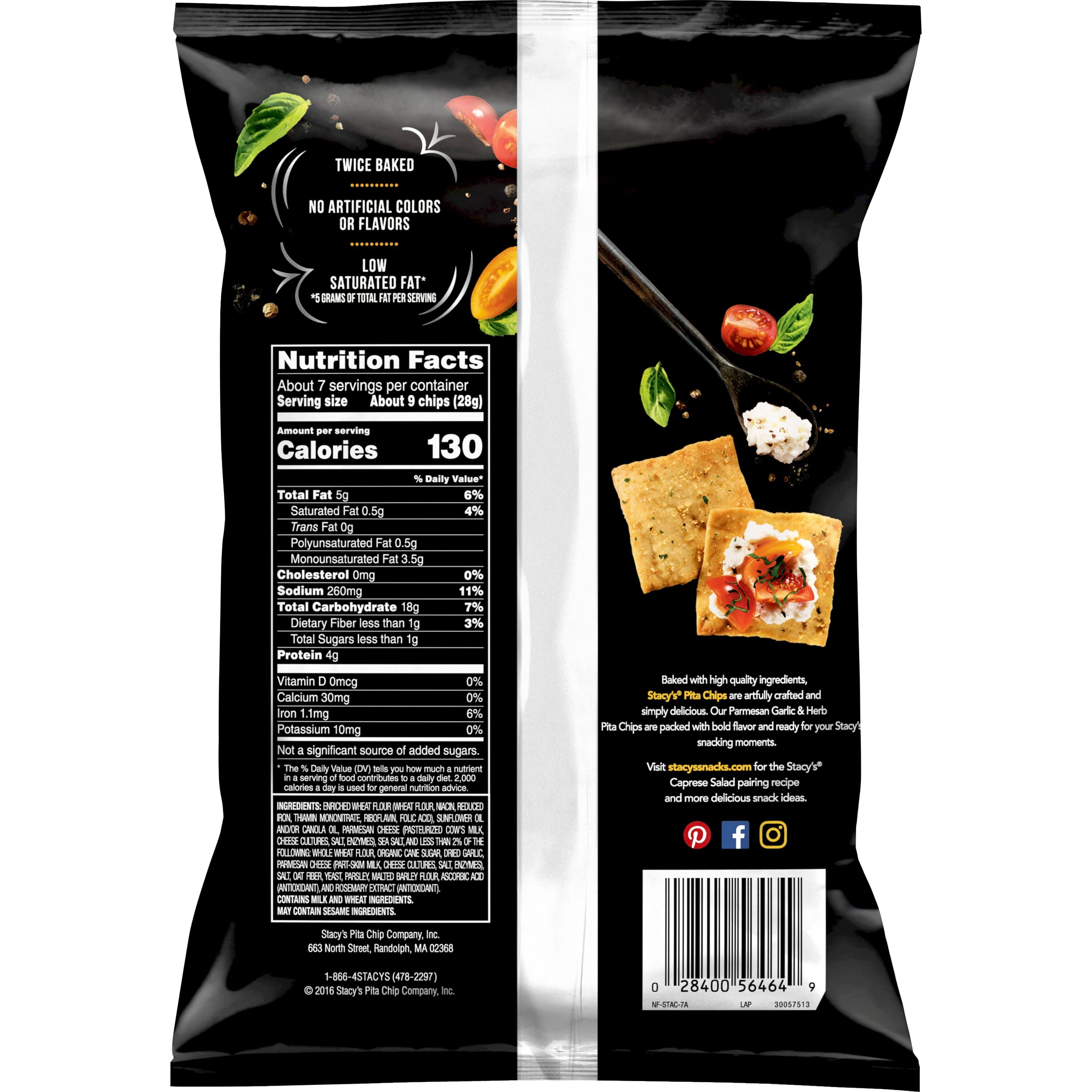 Stacy's Baked Pita Chips Parmesan Garlic and Herb Flavored are great for pairing with a dip or hummus and these chips are a perfect snack to split with a friend. We bake real pita from our own special recipe, slice it into chips, then bake it again for a delicious crunch. We think time is an essential ingredient, which is why we devote up to 14 hours to bake each batch of Stacy's Pita Chips. The Parmesan Garlic & Herb variety is seasoned with real Parmesan cheese, garlic, and parsley, delivering a savory taste that's perfect for snacking. These chips are free from artificial colors and flavors, ensuring a natural and wholesome snack experience and are low in saturated fat, with 5 grams of total fat per serving.