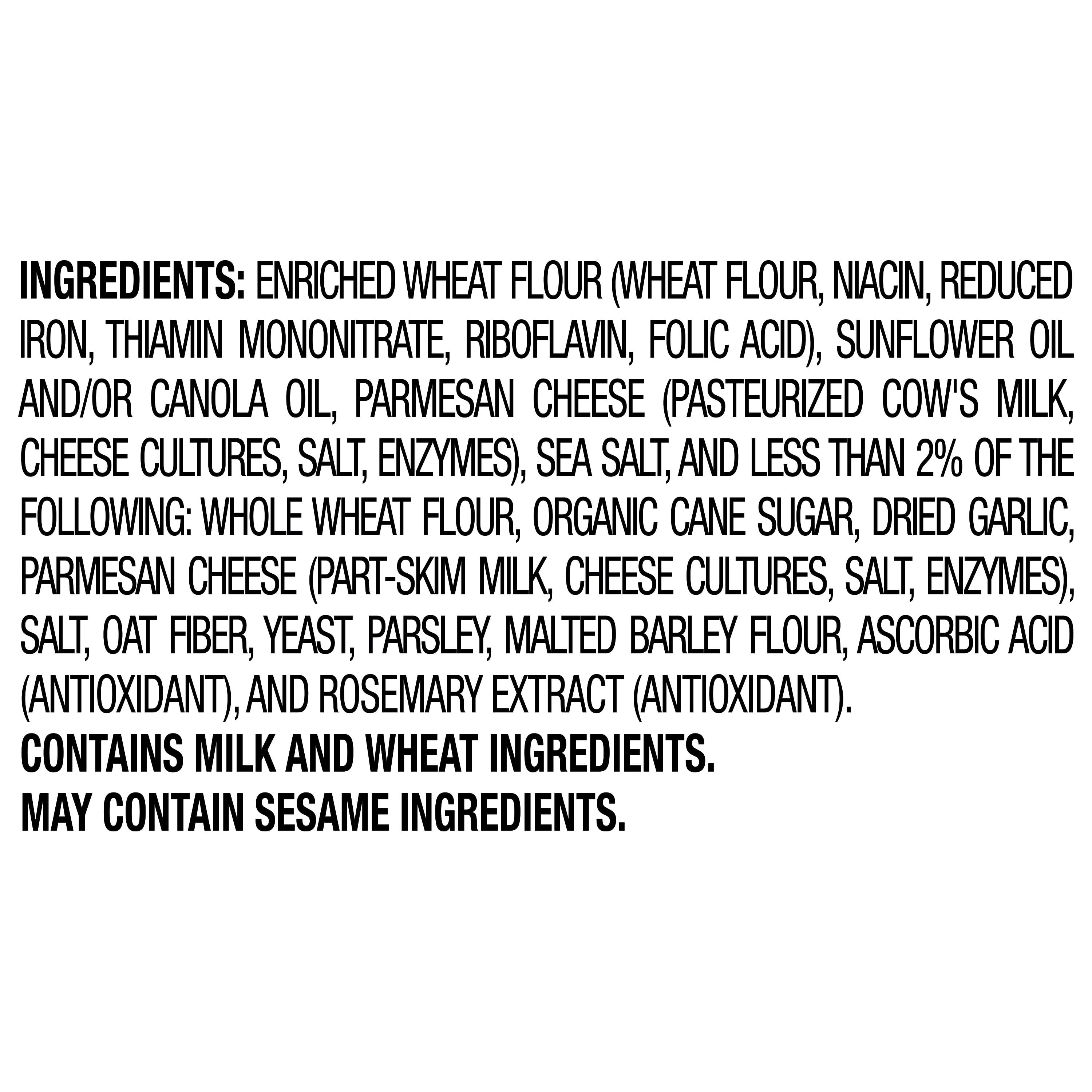 Enriched Wheat Flour (Wheat Flour, Niacin, Reduced Iron, Thiamin Mononitrate, Riboflavin, Folic Acid), Sunflower Oil and/or Canola Oil, Parmesan Cheese (Pasteurized Cow's Milk, Cheese Cultures, Salt, Enzymes), Sea Salt, and Less than 2% of Whole Wheat Flour, Organic Cane Sugar, Dried Garlic, Parmesan Cheese (Part-Skim Milk, Cheese Cultures, Salt, Enzymes), Salt, Oat Fiber, Yeast, Parsley, Malted Barley Flour, Ascorbic Acid (Antioxidant), and Rosemary Extract (Antioxidant)./div>