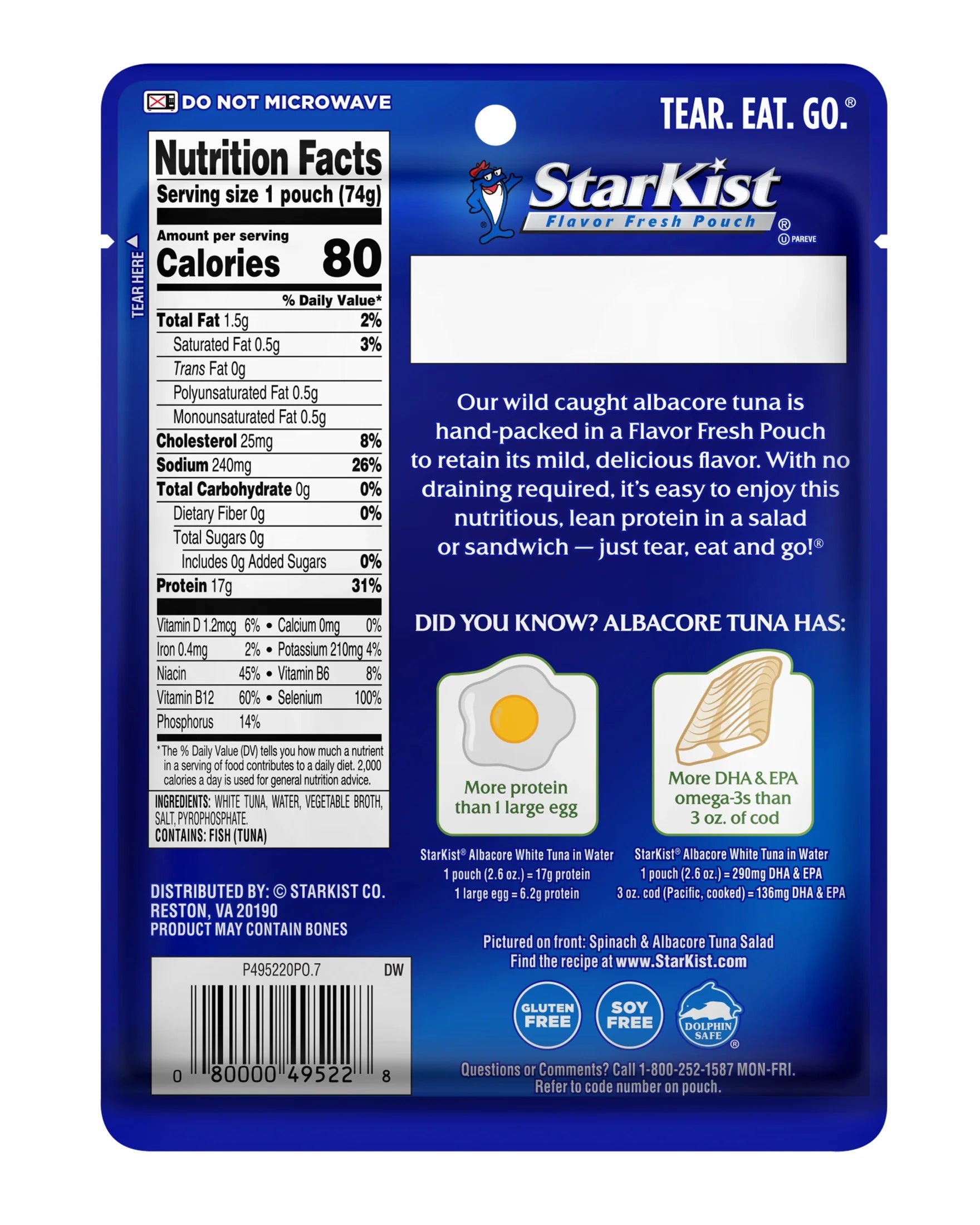 Our Albacore White Tuna in Water features hand packed, select cuts of premium, wild caught tuna in a convenient single serve pouch. With 80 calories and 17g of protein, this nutrient dense tuna pouch is the perfect fit for today's active lifestyle. Albacore's mild flavor and firmer texture makes it a great option for salads, pasta dishes or as a substitute for chicken in your favorite recipe. It also works well with Keto, Paleo, Whole30, Mediterranean and Weight Watchers diet plans - just tear, eat and go!