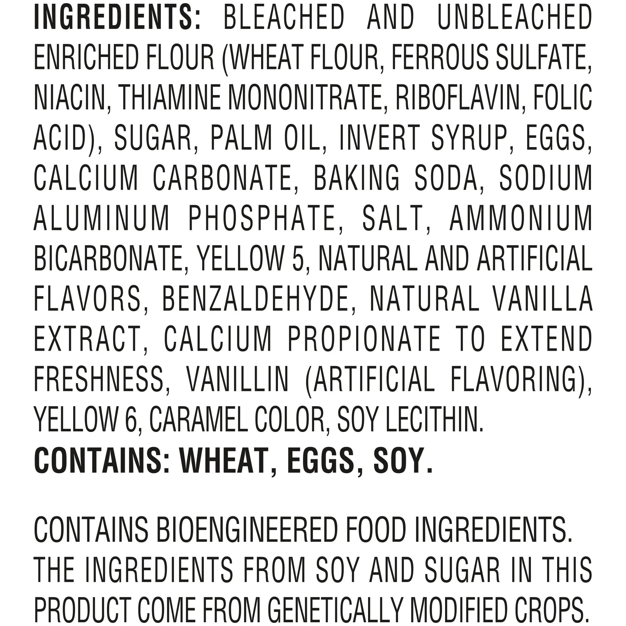 Ingredients: Bleached And Unbleached Enriched Flour (Wheat Flour, Ferrous Sulfate, Niacin, Thiamine Mononitrate, Riboflavin, Folic Acid), Sugar, Palm Oil, Invert Syrup, Eggs, Calcium Carbonate, Baking Soda, Sodium Aluminum Phosphate, Salt, Ammonium Bicarbonate, Yellow 5, Natural And Artificial Flavors, Benzaldehyde, Natural Vanilla Extract, Calcium Propionate To Extend Freshness, Vanillin (Artificial Flavoring), Yellow 6, Caramel Color, Soy Lecithin. Contains: Wheat, Eggs, Soy./div>