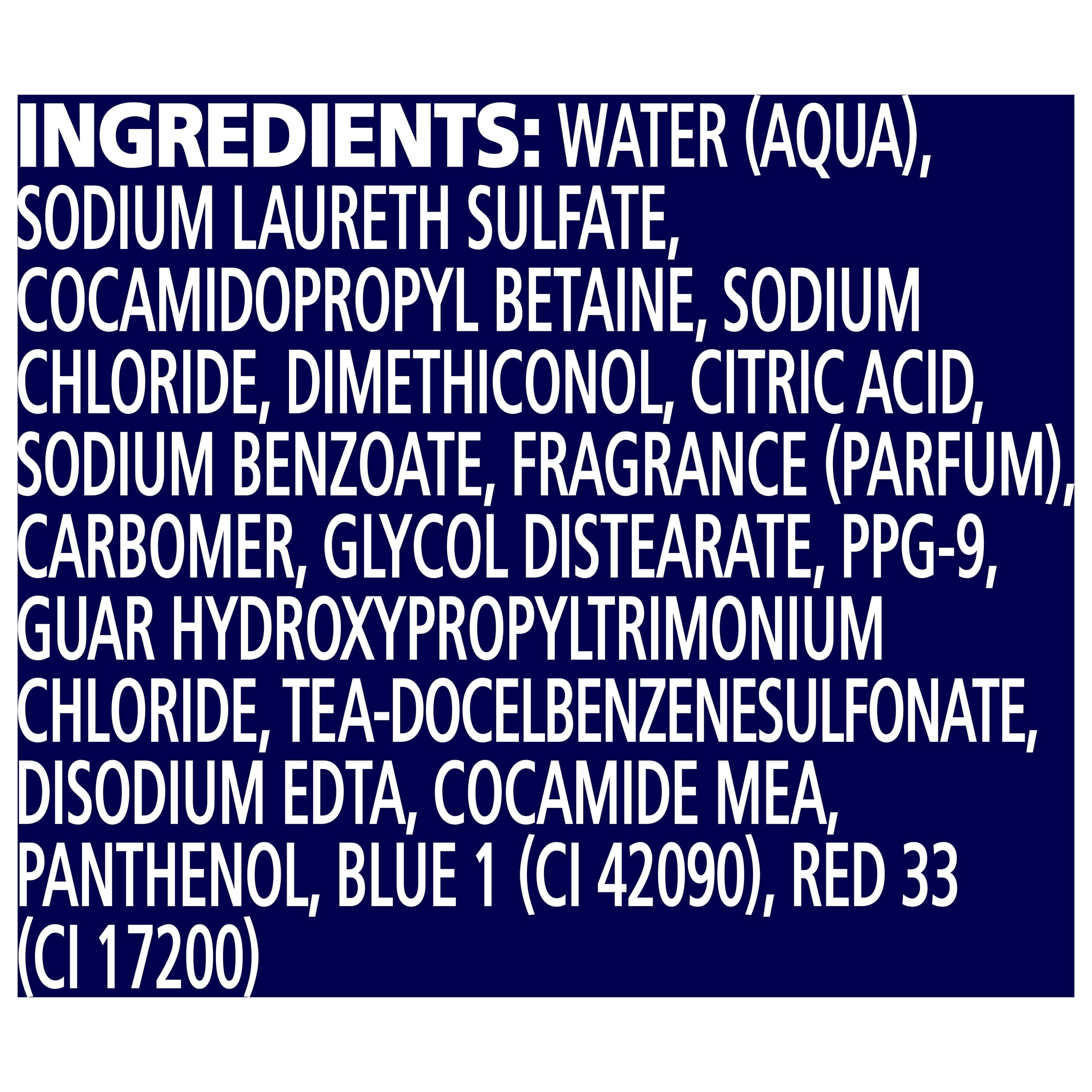 Water (Aqua), Sodium Laureth Sulfate, Cocamidopropyl Betaine, Sodium Chloride, Dimethiconol, Fragrance (Parfum), Carbomer, Glycol Distearate, Citric Acid, Guar Hydroxypropyltrimonium Chloride, TEA-Dodecylbenzenesulfonate, Tetrasodium EDTA, DMDM Hydantoin, Propylene Glycol PPG-9, Panthenol, Methylchloroisothiazolinone, Methylisothiazolinone, Blue 1 (CI 42090), Red 33 (CI 17200)./div>