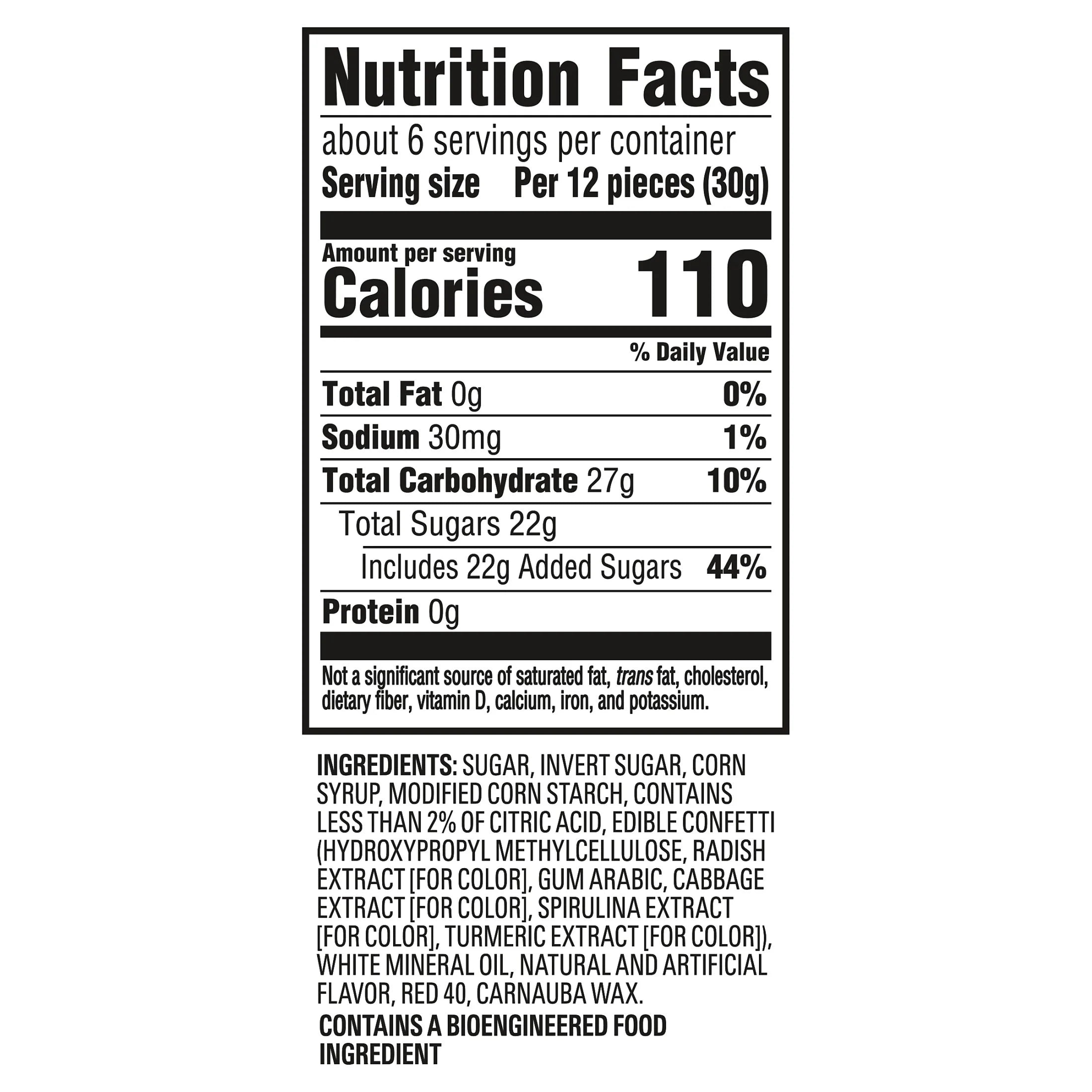 Sugar, Invert Sugar, Corn Syrup, Modified Corn Starch, Contains Less Than 2% Of Citric Acid, Edible Confetti (Hydroxypropyl Methylcellulose, Radish Extract [For Color], Gum Arabic, Cabbage Extract [For Color], Spirulina Extract [For Color], Turmeric Extract [For Color]), White Mineral Oil, Natural And Artificial Flavor, Red 40, Carnauba Wax./div>