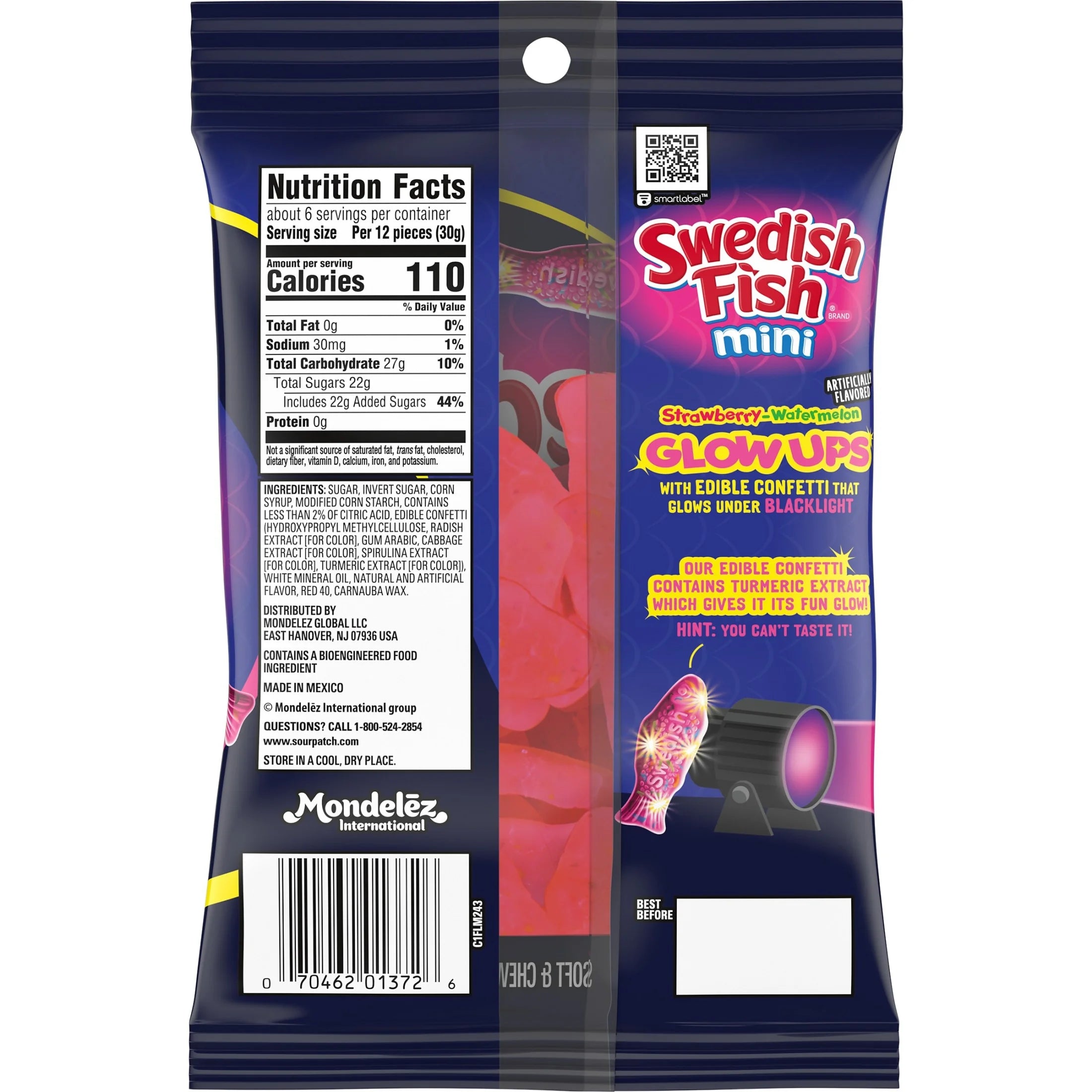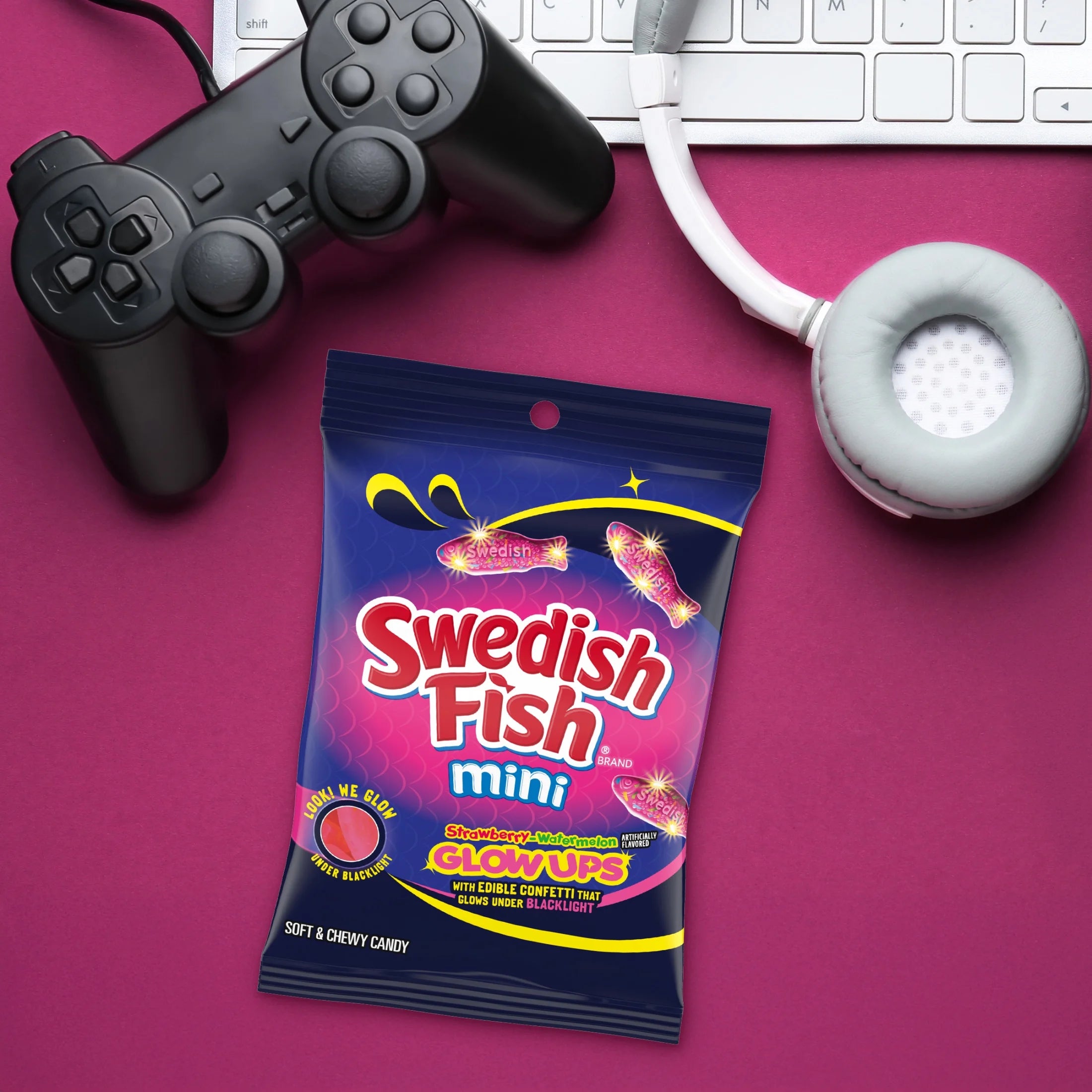 - One 6.7 oz bag of SWEDISH FISH Mini Glow Ups Strawberry-Watermelon Soft & Chewy Candy