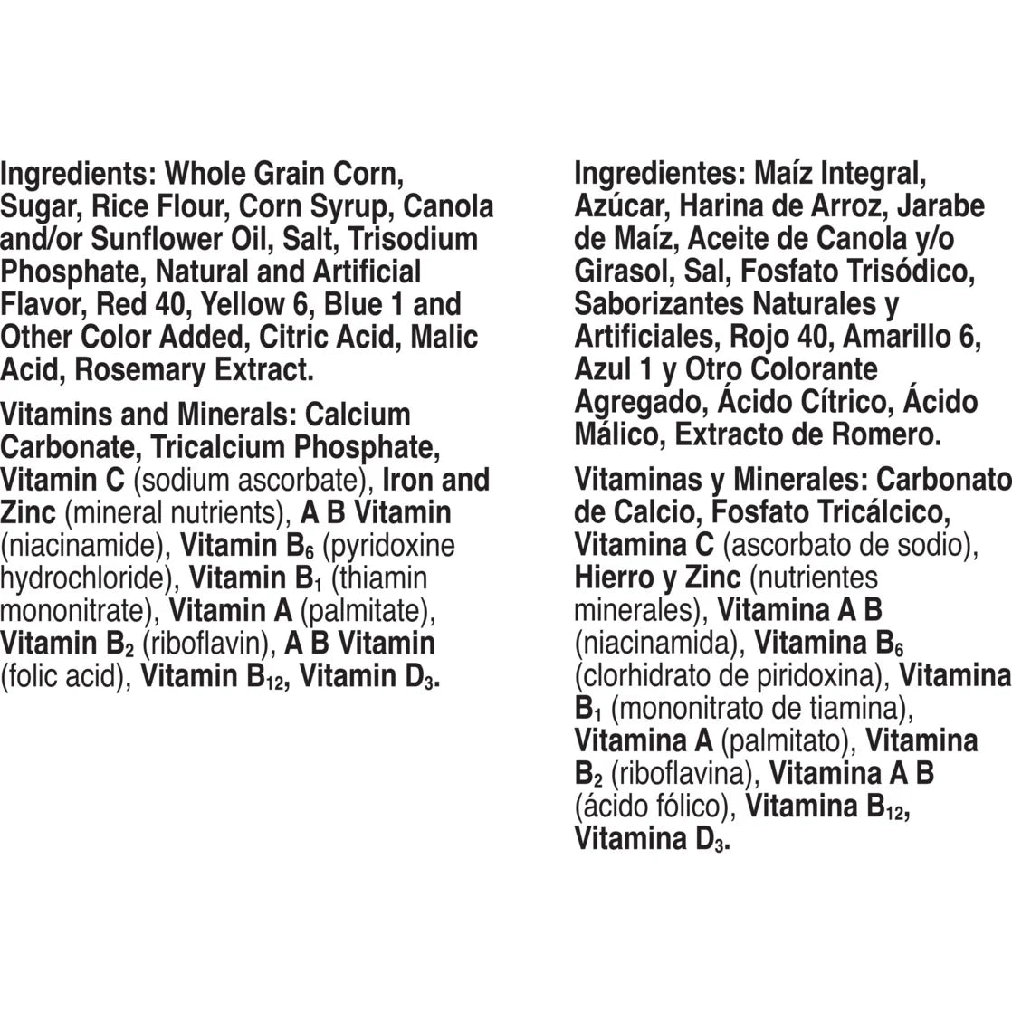 Whole Grain Corn, Sugar, Rice Flour, Corn Syrup, Canola and/or Sunflower Oil, Salt, Trisodium Phosphate, Natural and Artificial Flavor, Red 40, Yellow 6, Blue 1 and Other Color Added, Citric Acid, Malic Acid, Rosemary Extract. Vitamins and Minerals: Calcium Carbonate, Tricalcium Phosphate, Vitamin C (sodium ascorbate), Iron and Zinc (mineral nutrients), A B Vitamin (niacinamide), Vitamin B6 (pyridoxine hydrochloride), Vitamin B1 (thiamin mononitrate), Vitamin A (palmitate), Vitamin B2 (riboflavin), A B Vitamin (folic acid), Vitamin B12, Vitamin D3./div>
