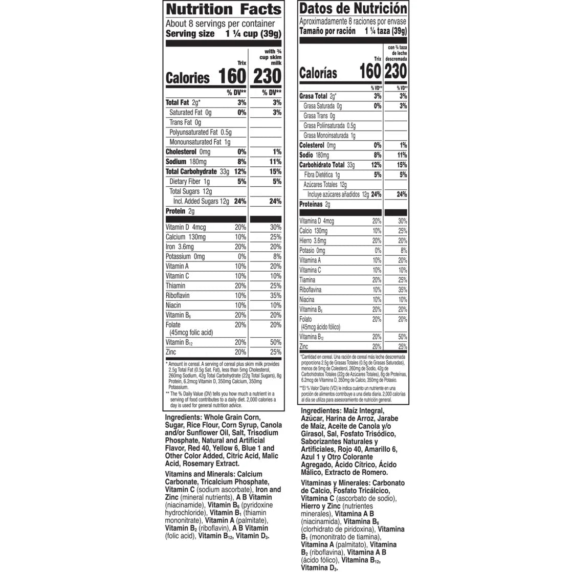- CONTAINS: One cardboard box of crunchy Trix Fruity Breakfast Cereal, 6 Fruity Shapes, Whole Grain Corn Puffs, 10.7 oz; Perfect for instant snacking, or a part of breakfast and meals